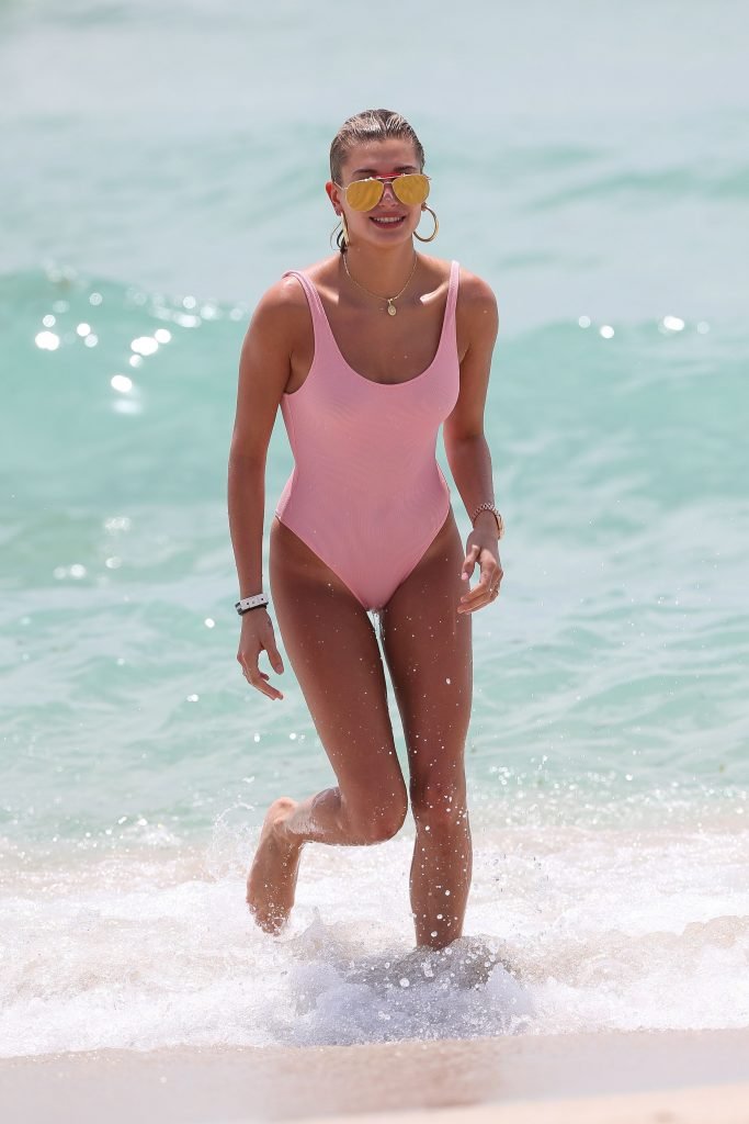 Hailey Baldwin porte un maillot de bain une pièce rose pâle sur la plage de Miami, 10/06/2017. Hailey Rhode Baldwin est un mannequin et actrice américaine originaire de Tucson. Âge – 20 ans.