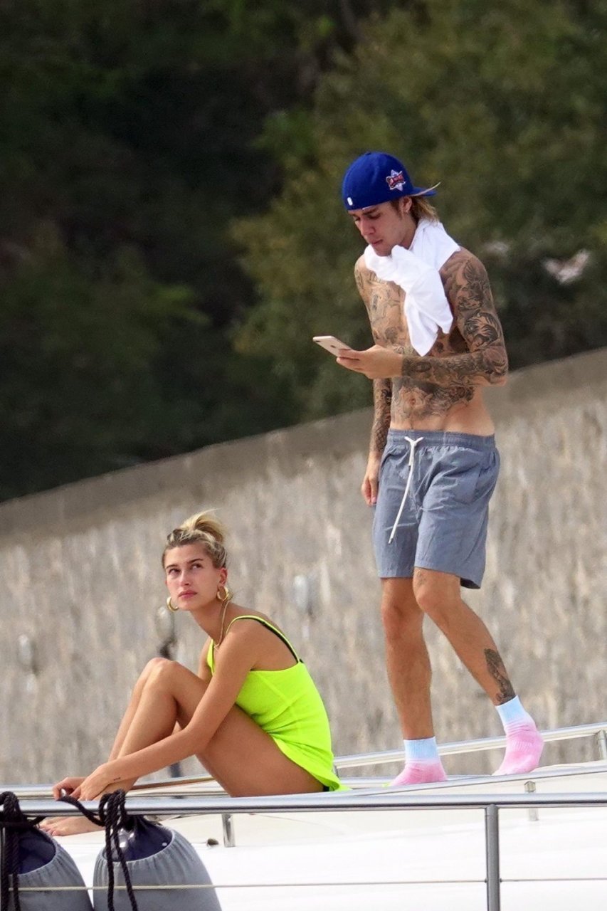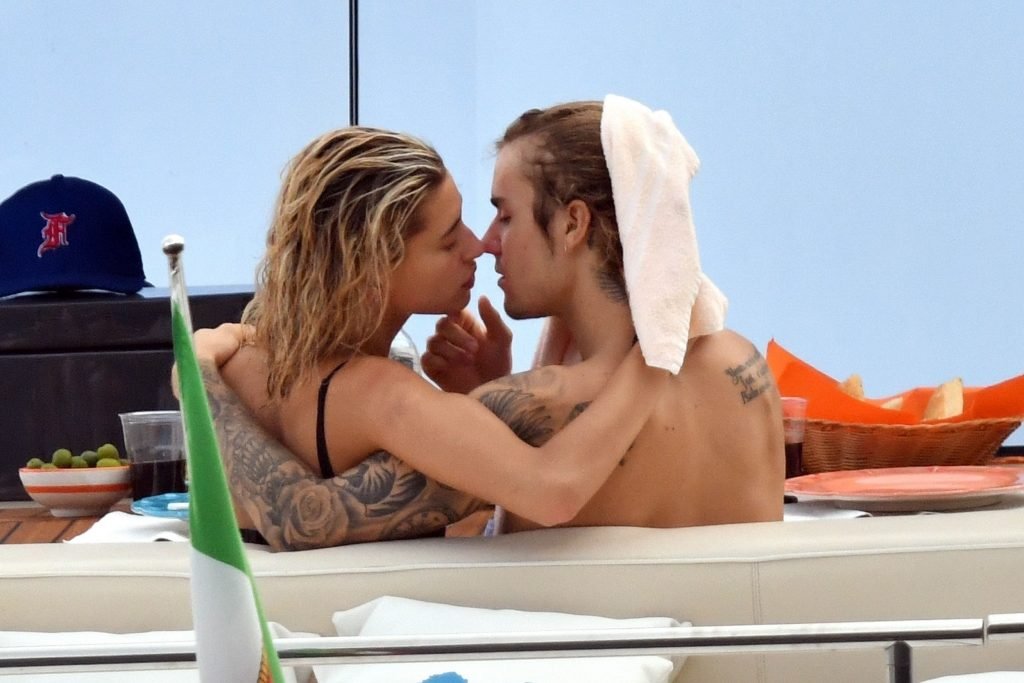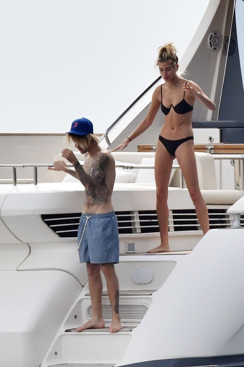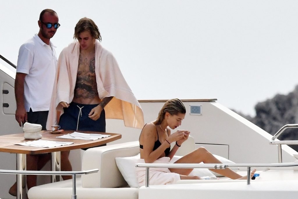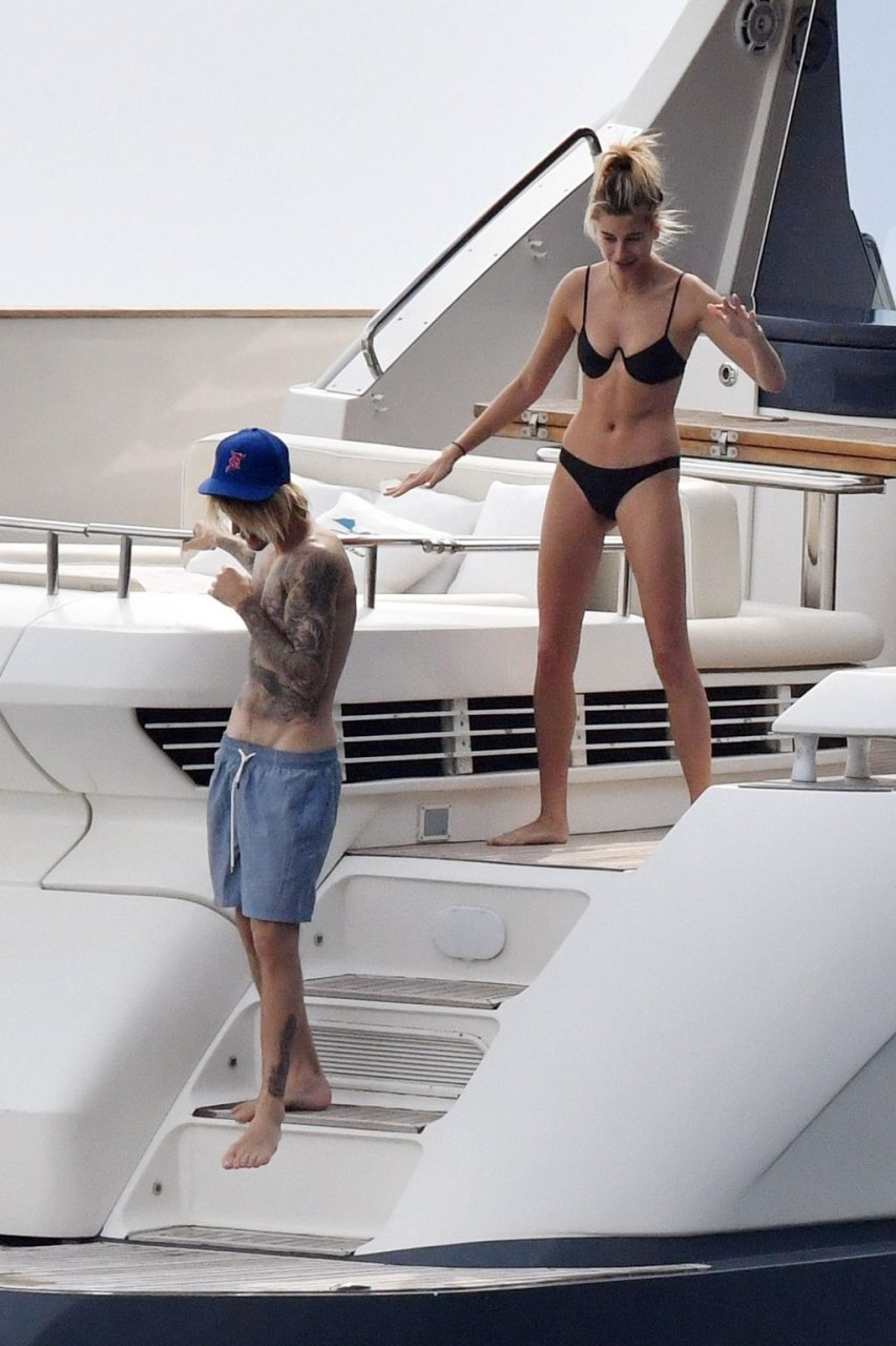 Les tourtereaux affichent leur affection lors du déjeuner sur leur yacht après une séance de shopping en ville et des salutations aux jeunes fans. Hailey montre sa silhouette fine dans un bikini noir pour une baignade dans l’océan, 21/09/2018.