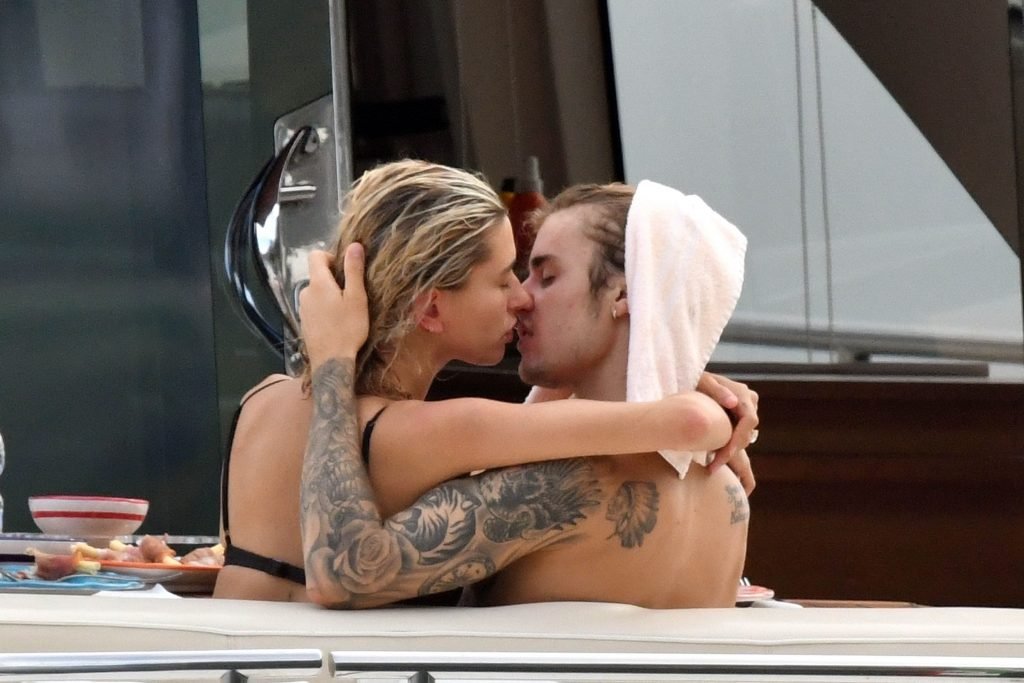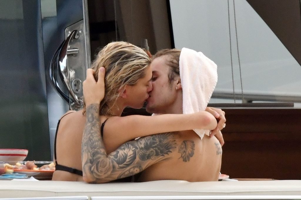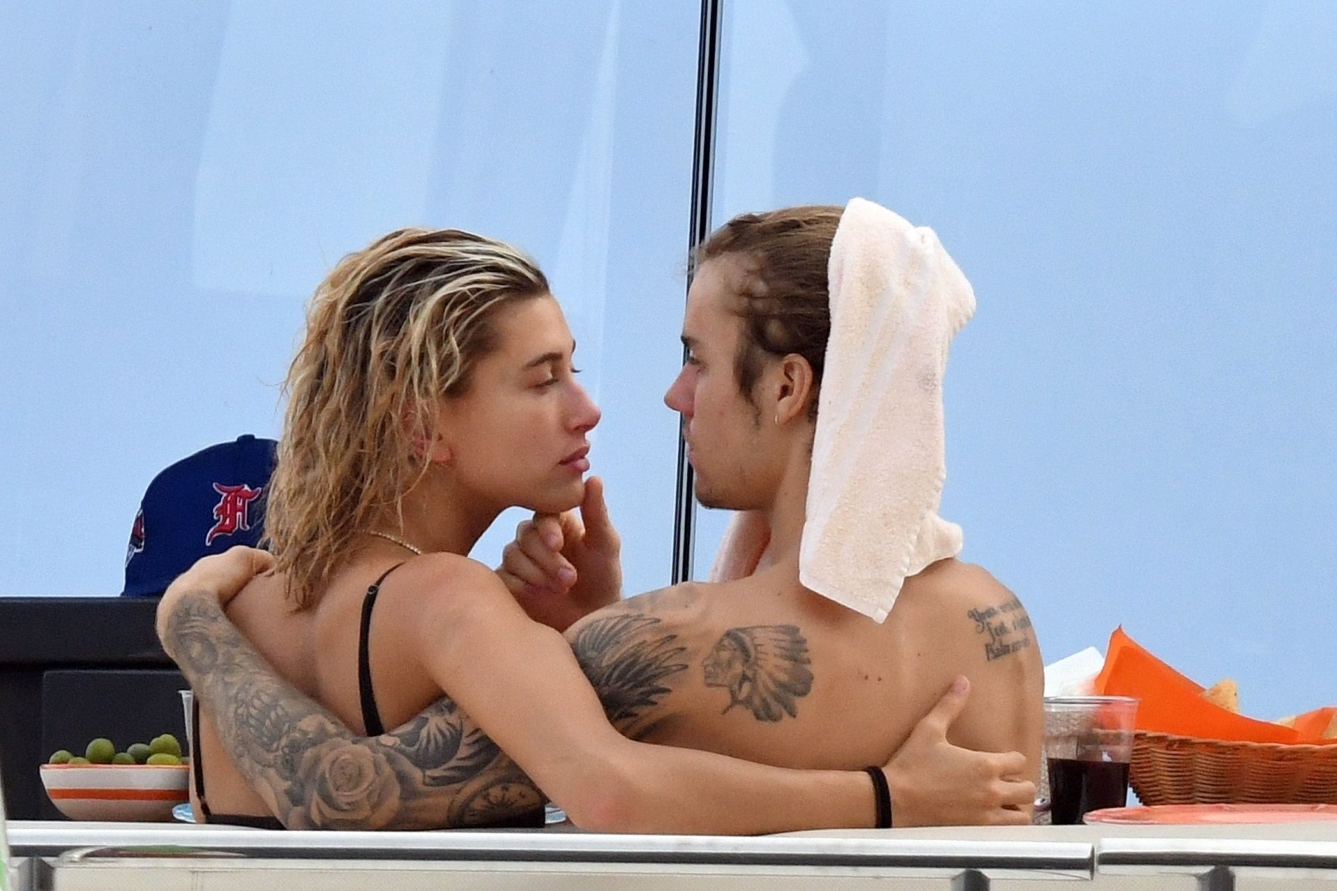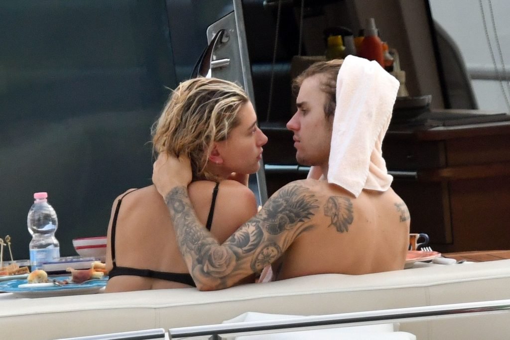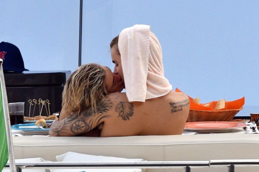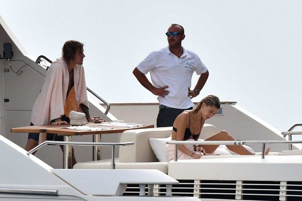 Les tourtereaux affichent leur affection lors du déjeuner sur leur yacht après une séance de shopping en ville et des salutations aux jeunes fans. Hailey montre sa silhouette fine dans un bikini noir pour une baignade dans l’océan, 21/09/2018.