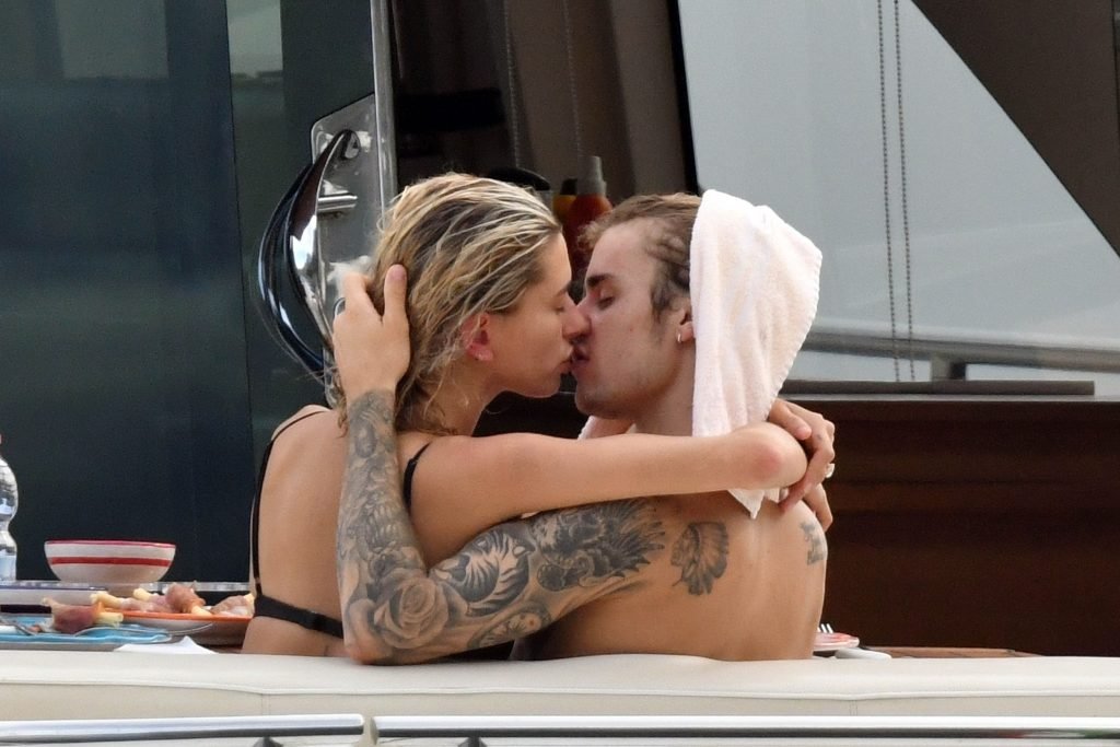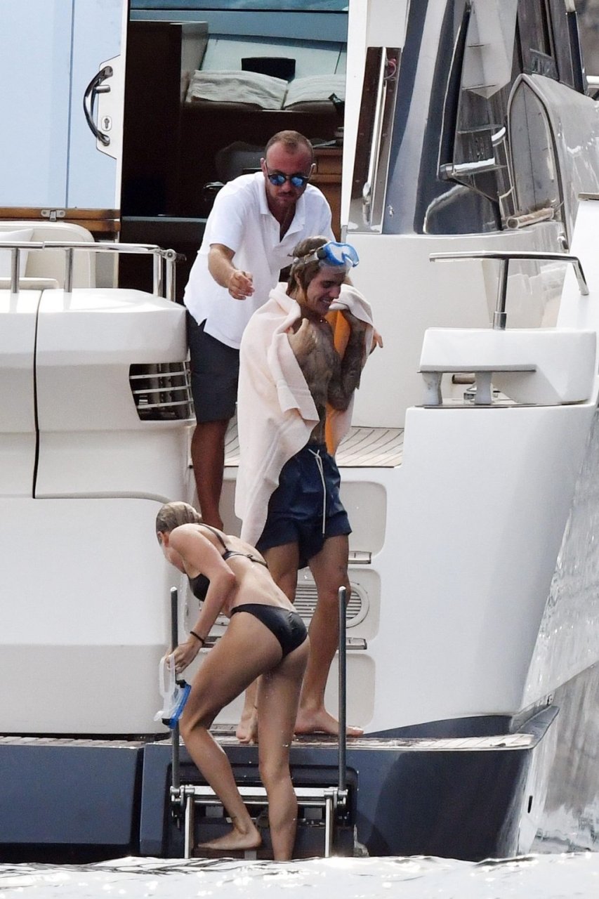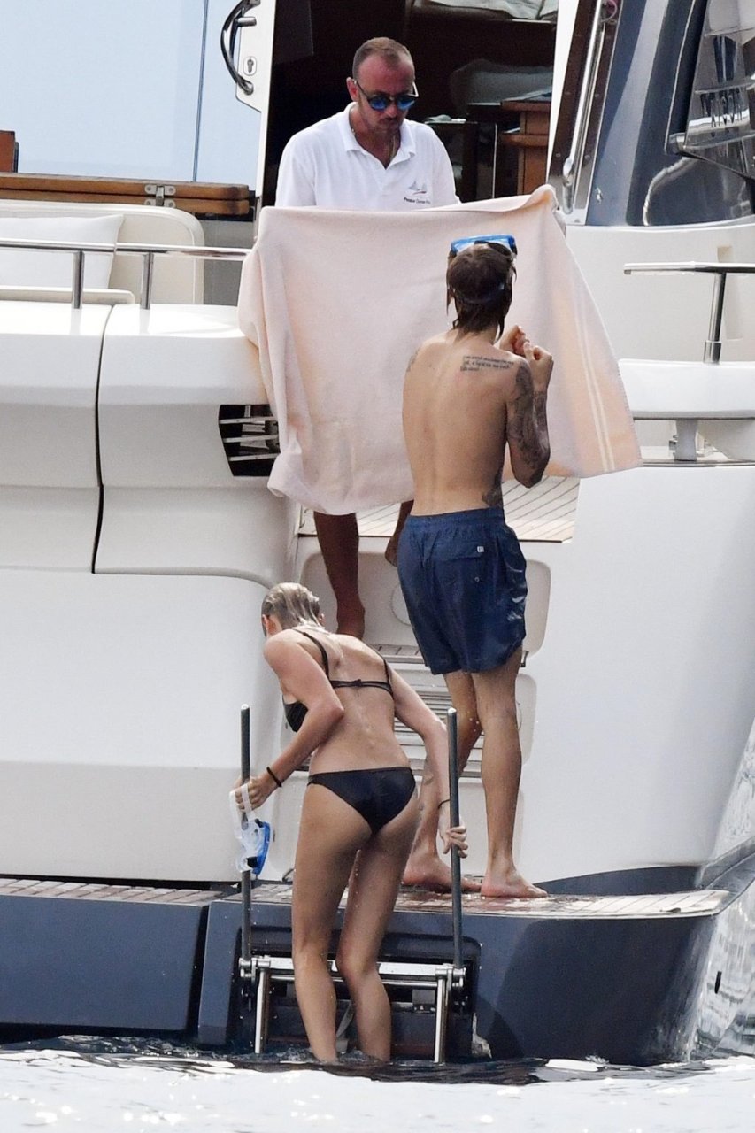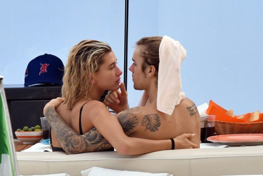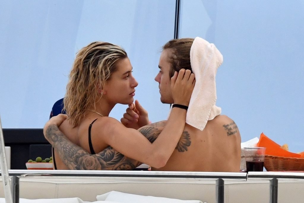 Les tourtereaux affichent leur affection lors du déjeuner sur leur yacht après une séance de shopping en ville et des salutations aux jeunes fans. Hailey montre sa silhouette fine dans un bikini noir pour une baignade dans l’océan, 21/09/2018.