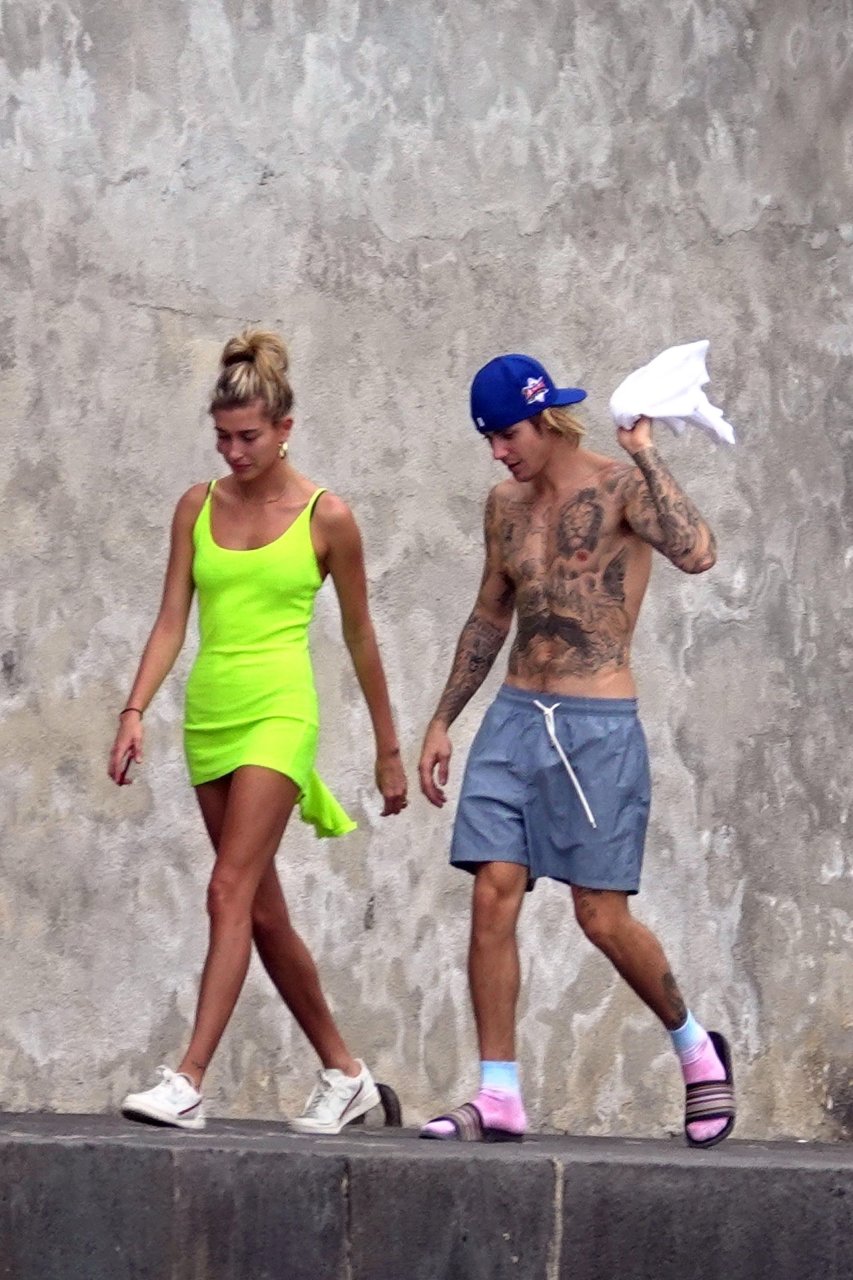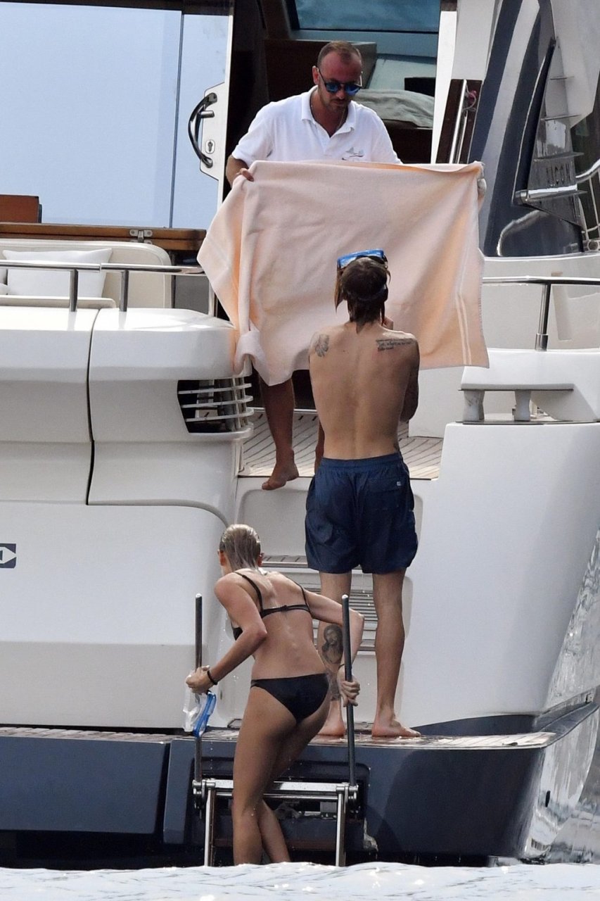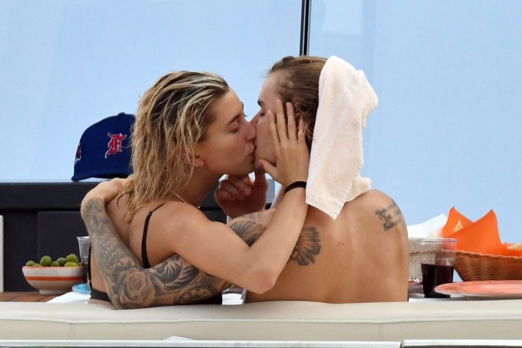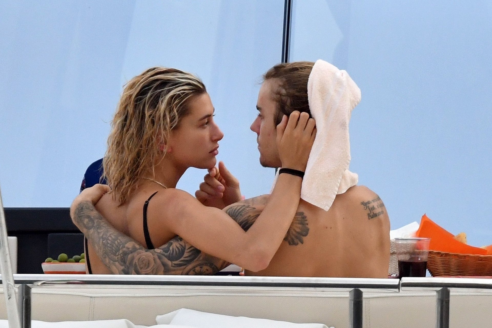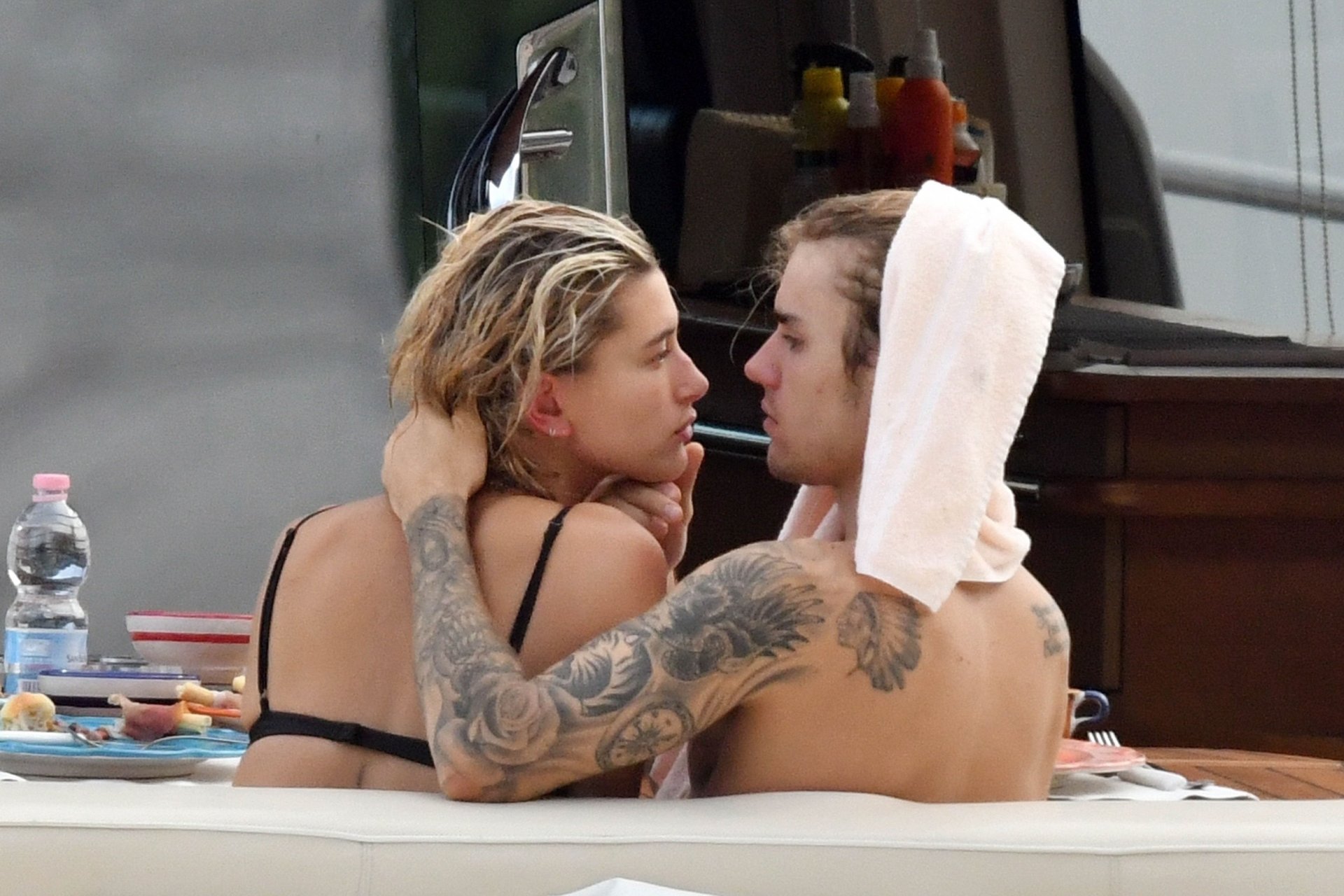 Les tourtereaux affichent leur affection lors du déjeuner sur leur yacht après une séance de shopping en ville et des salutations aux jeunes fans. Hailey montre sa silhouette fine dans un bikini noir pour une baignade dans l’océan, 21/09/2018.