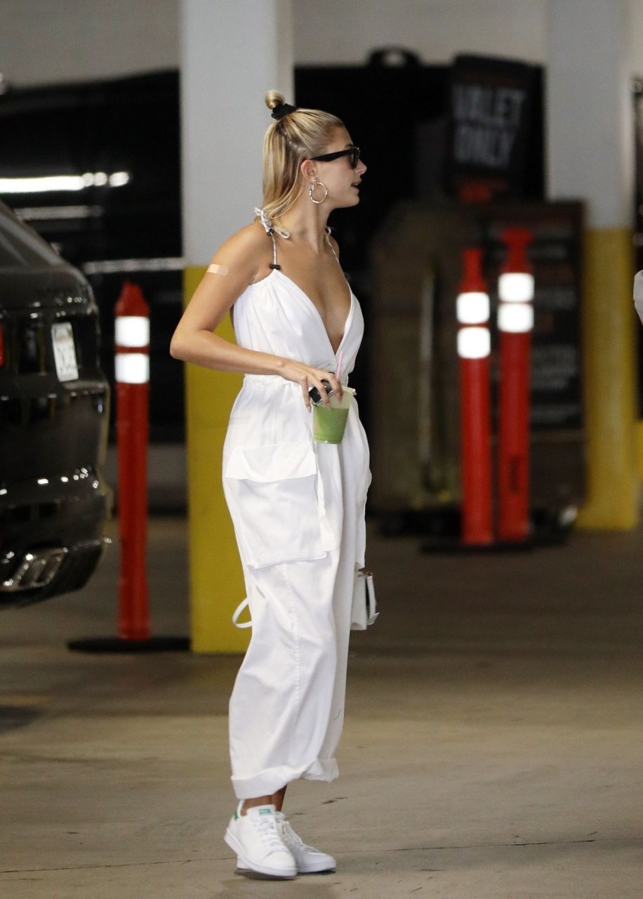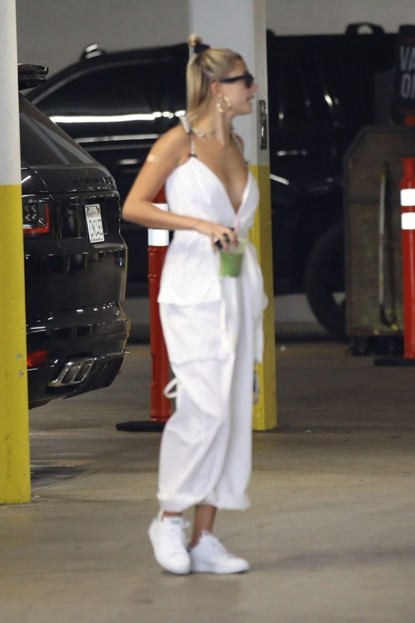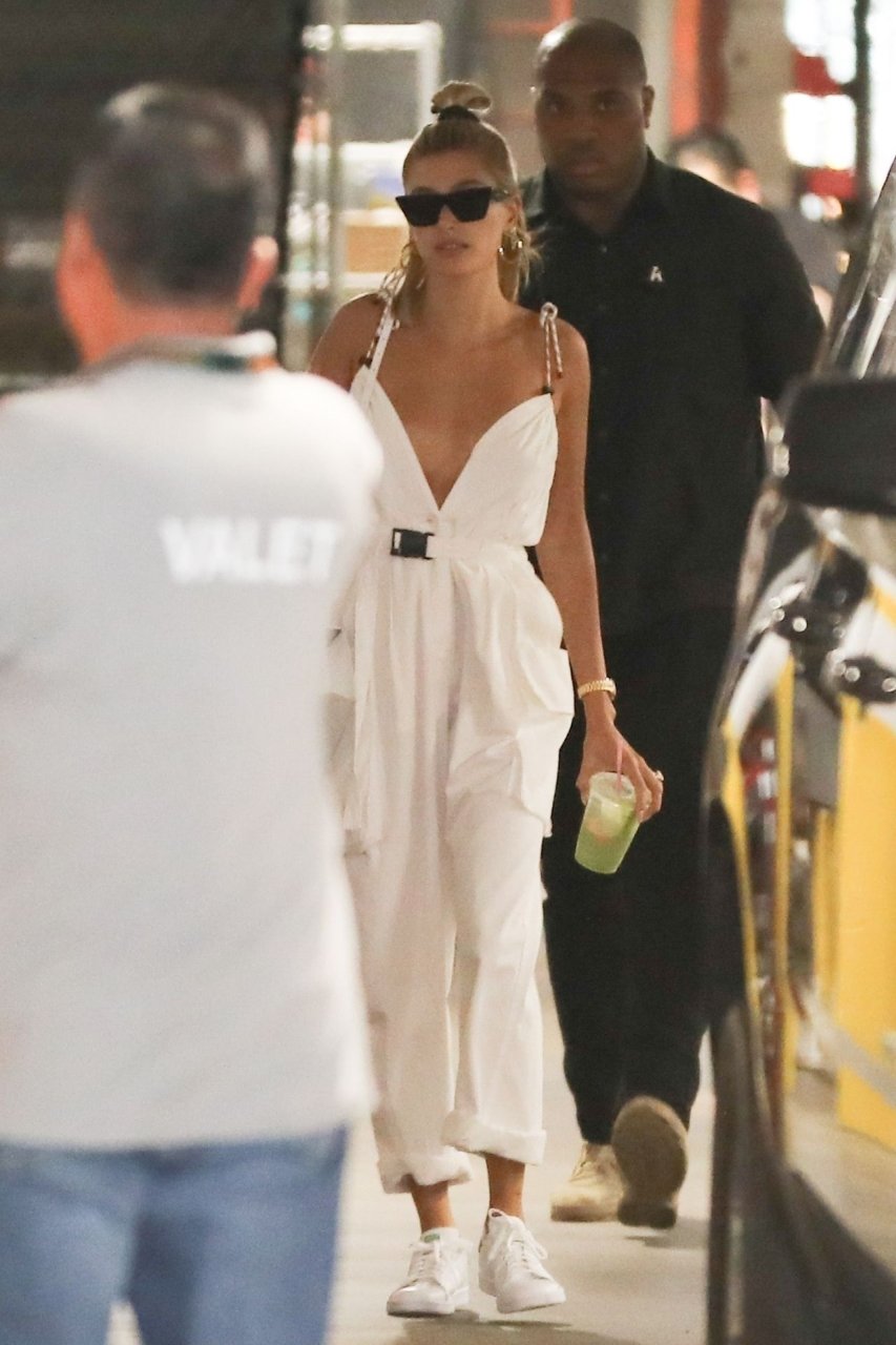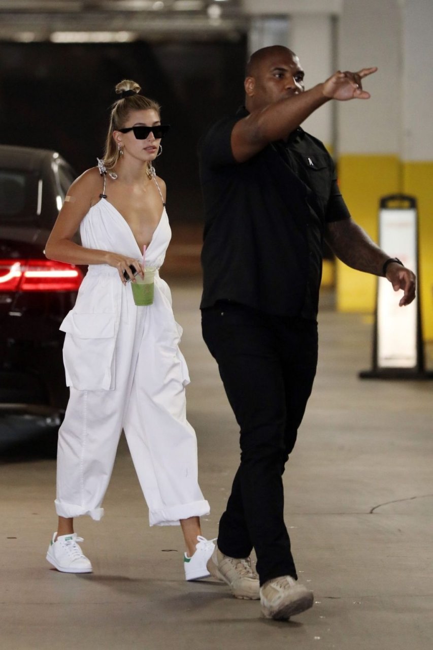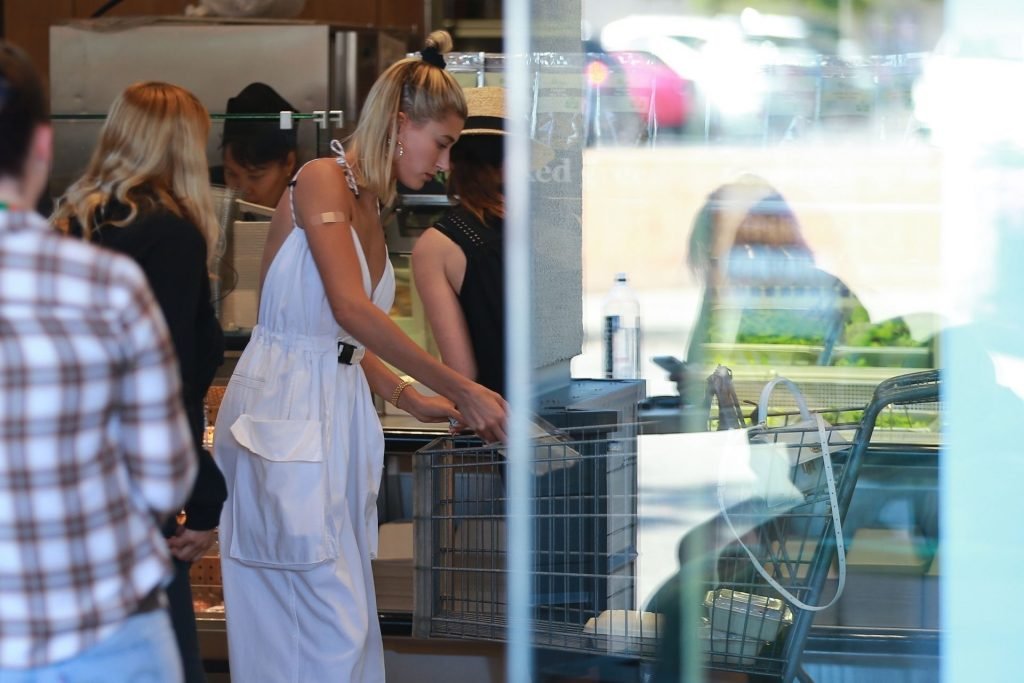 Hailey Bieber fait du shopping avec sa sécurité au marché Erewhon à Beverly Hills dans une tenue blanche dévoilant son décolleté, 12/06/2019.