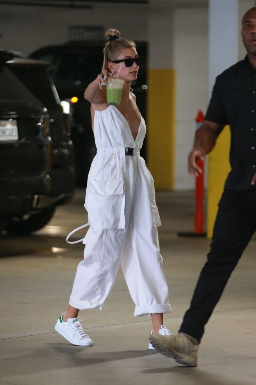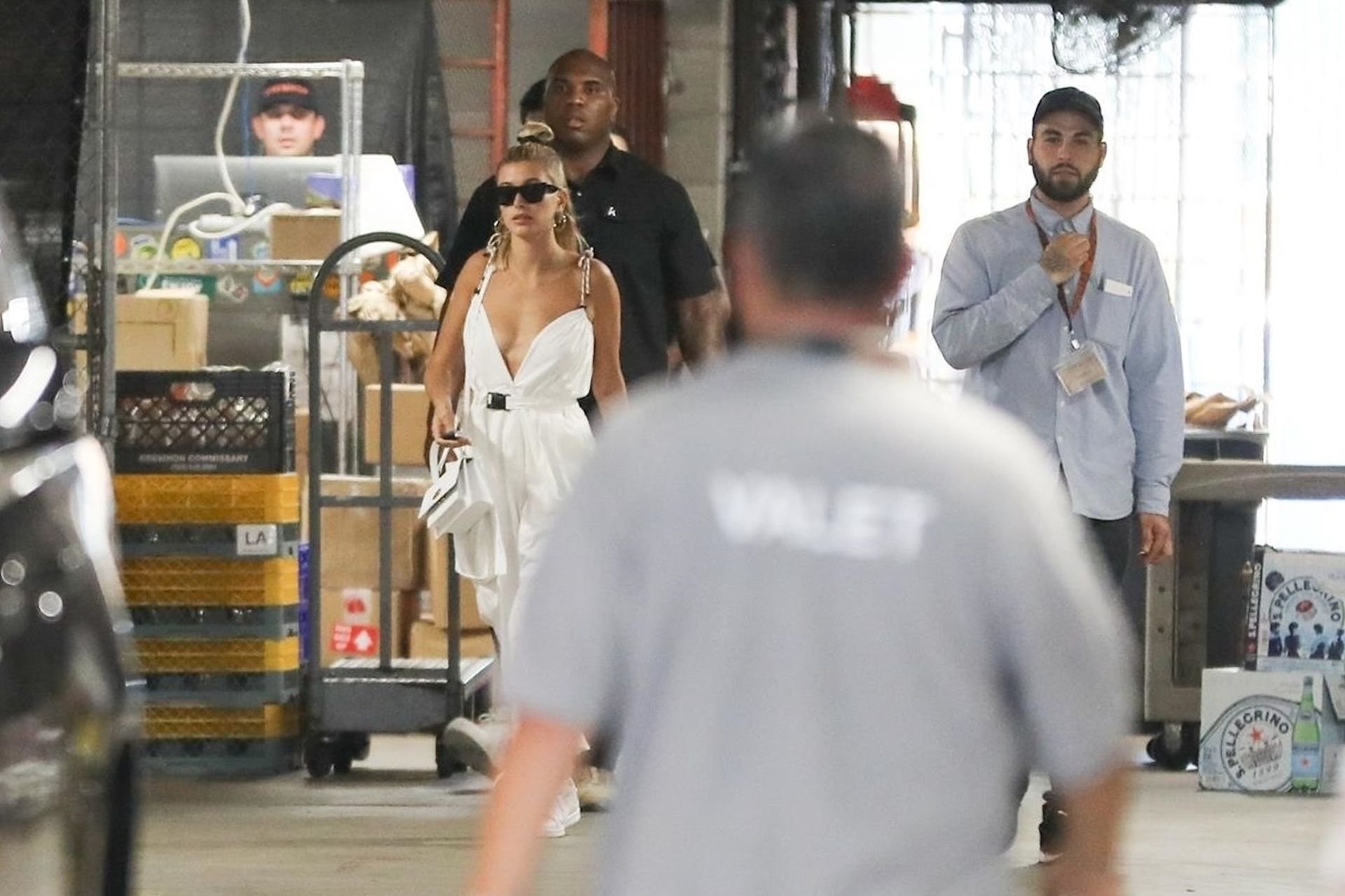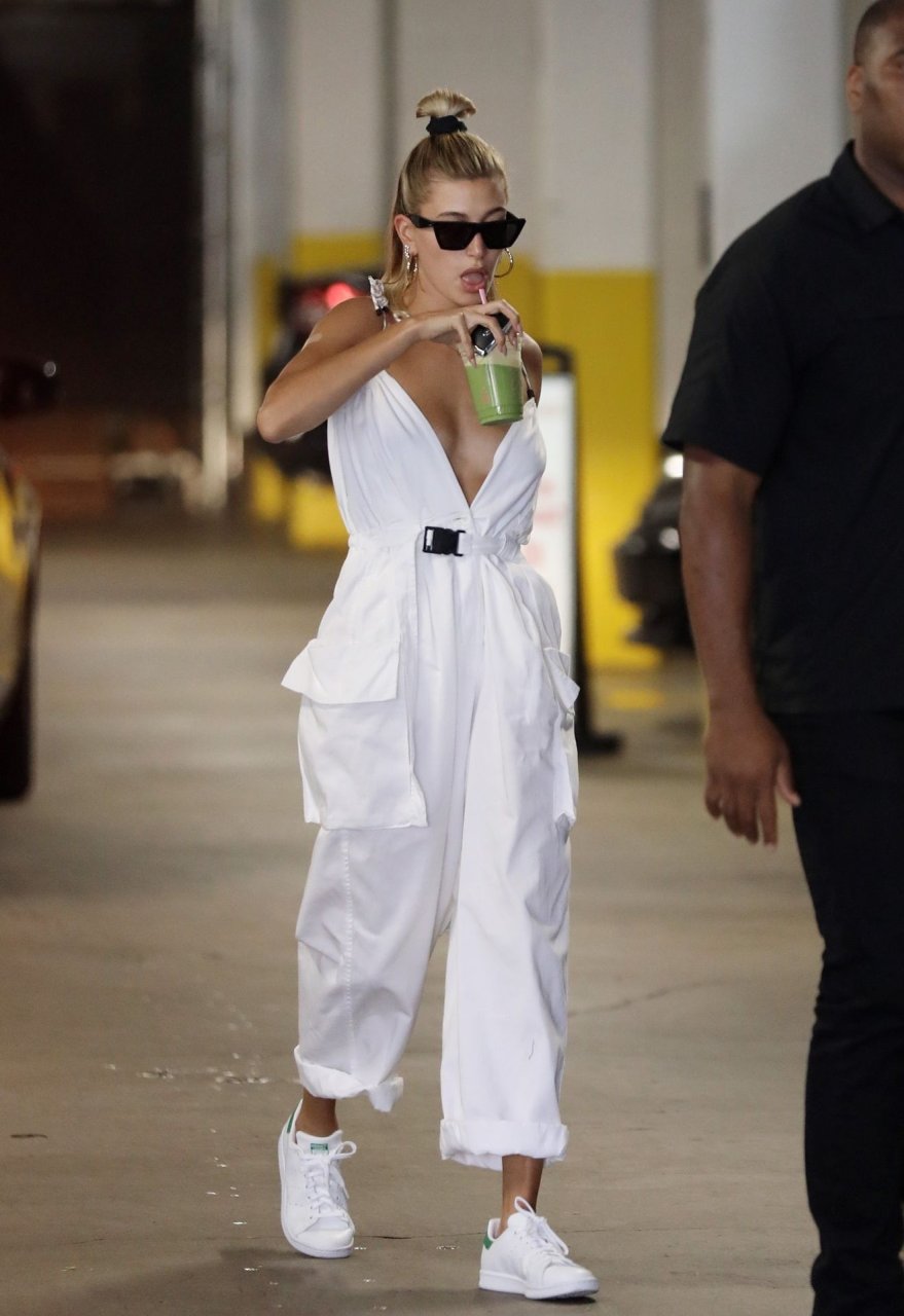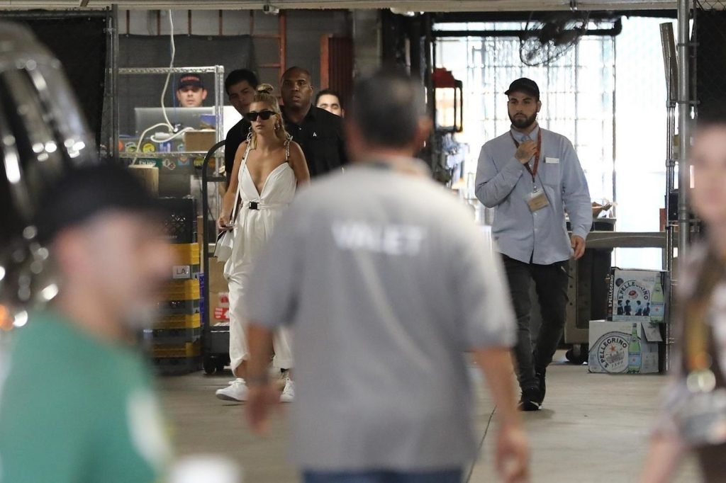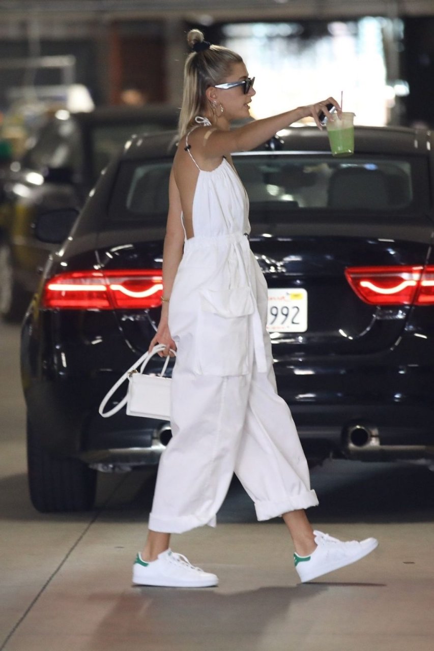 Hailey Bieber fait du shopping avec sa sécurité au marché Erewhon à Beverly Hills dans une tenue blanche dévoilant son décolleté, 12/06/2019.