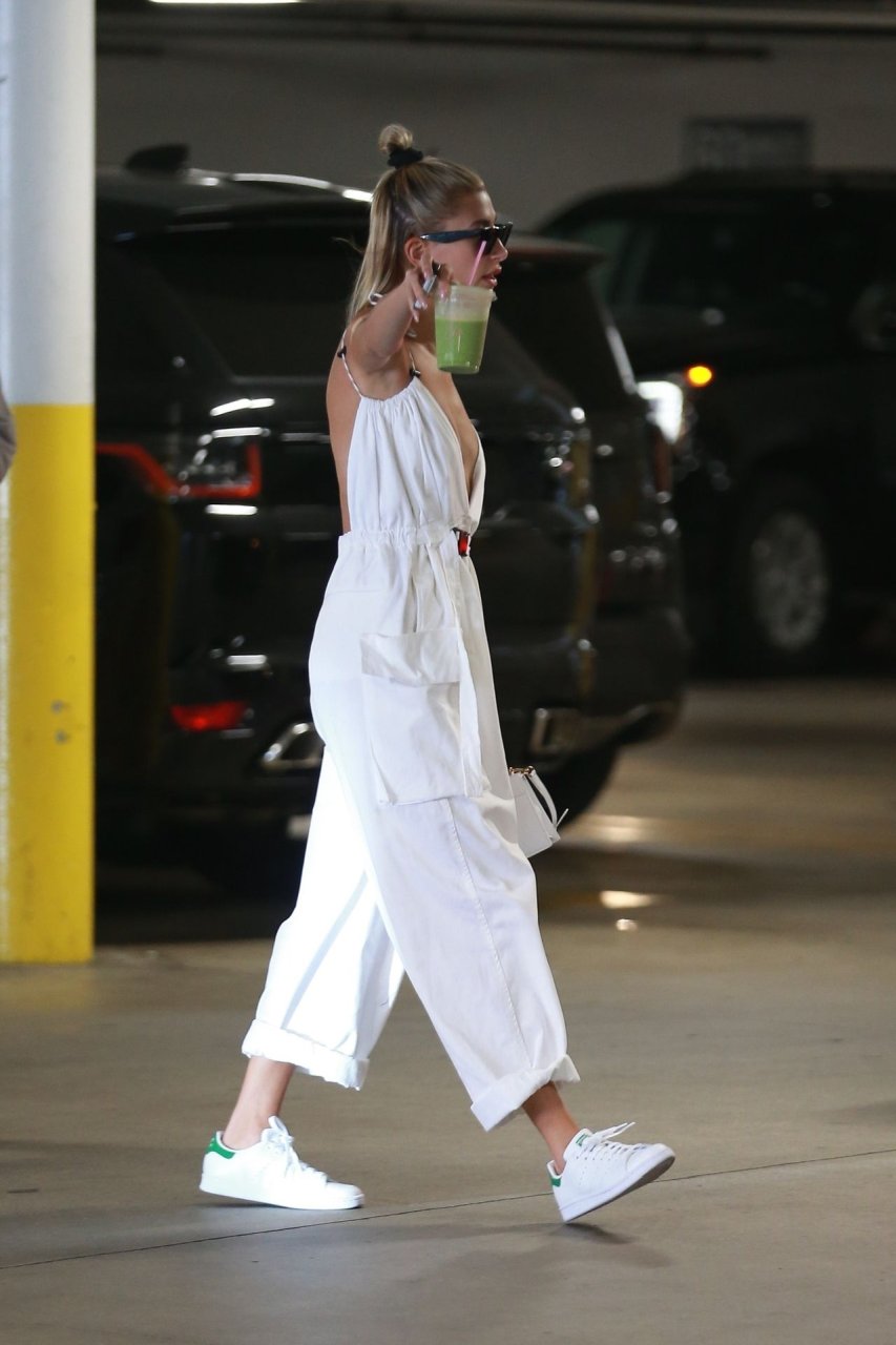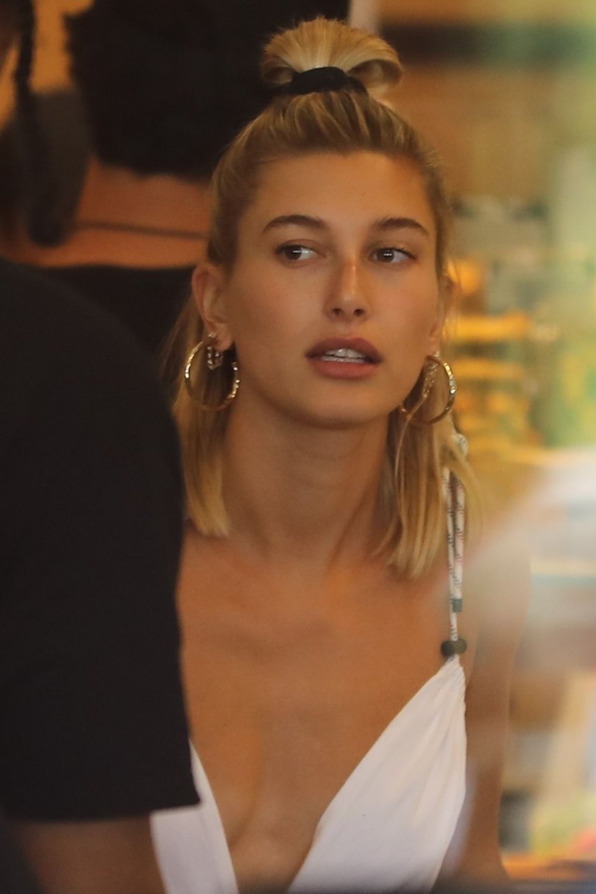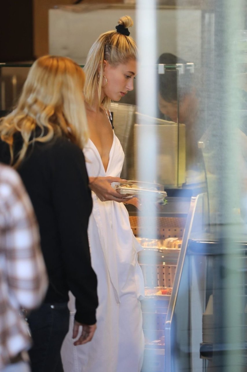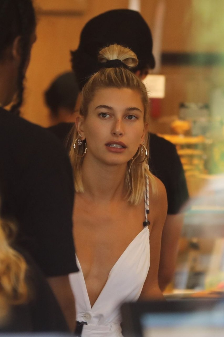Hailey Bieber fait du shopping avec sa sécurité au marché Erewhon à Beverly Hills dans une tenue blanche dévoilant son décolleté, 12/06/2019.