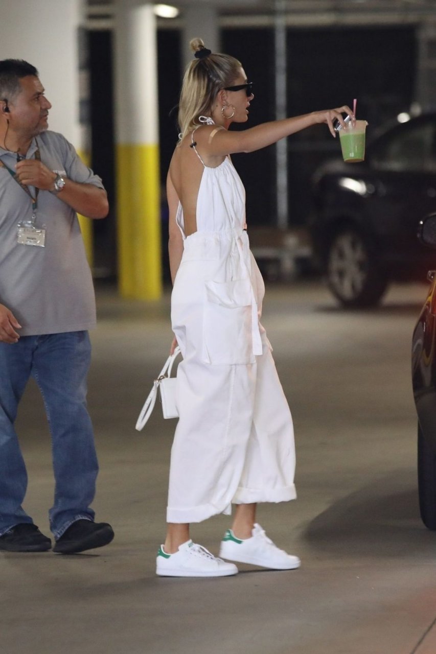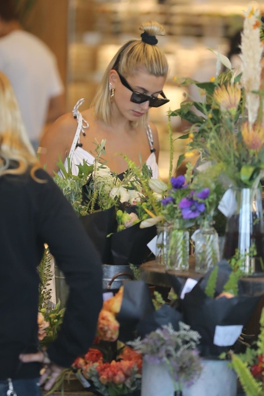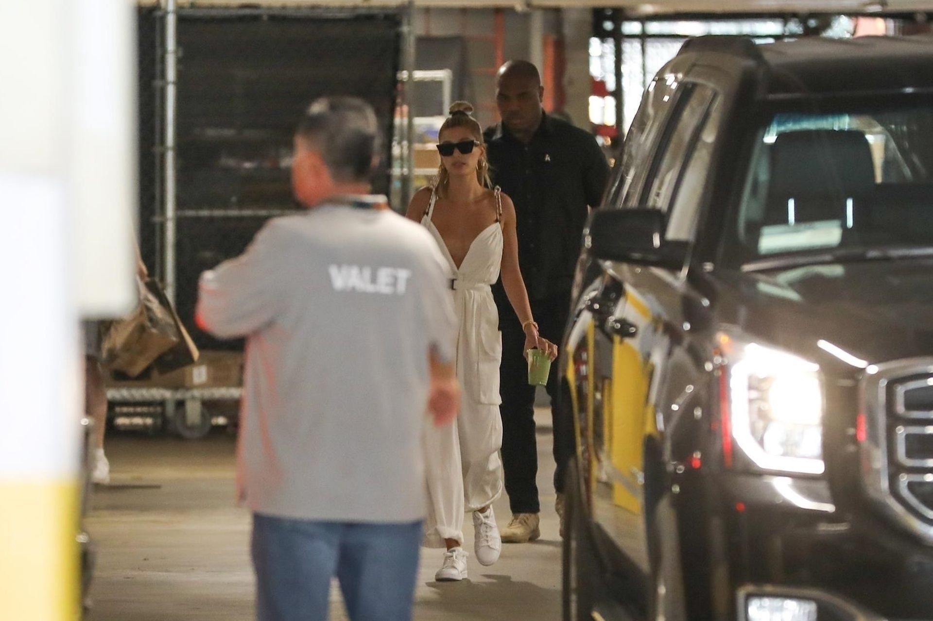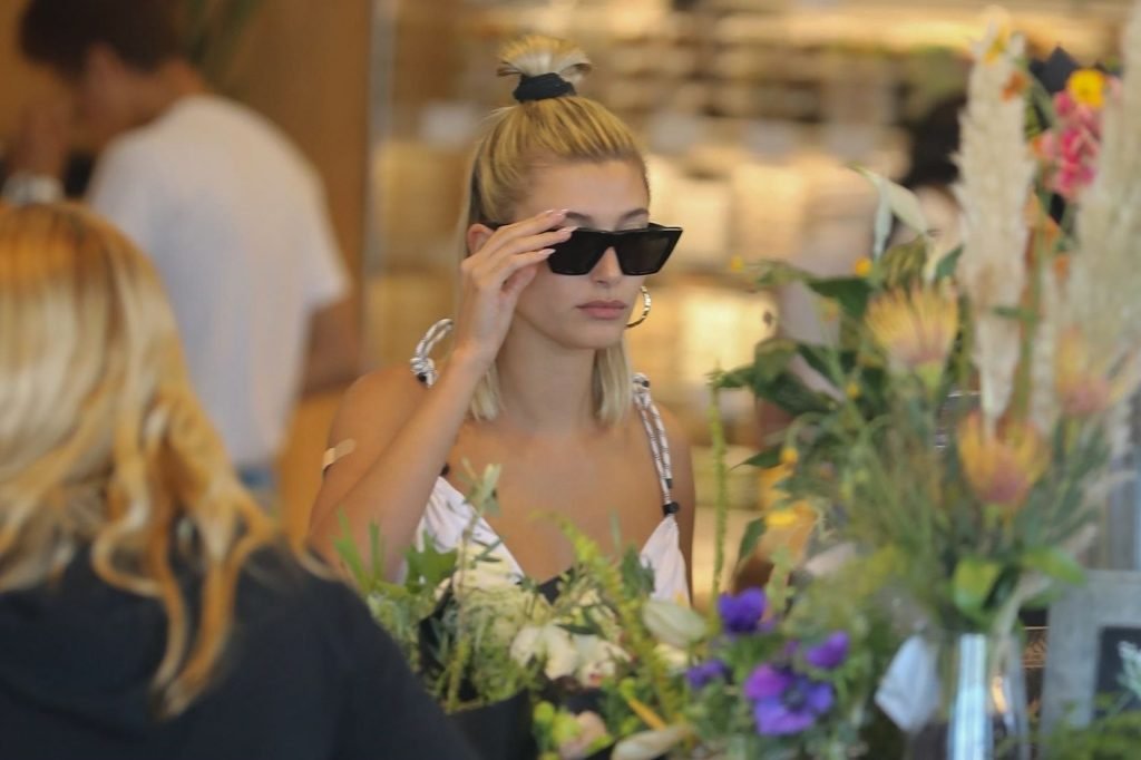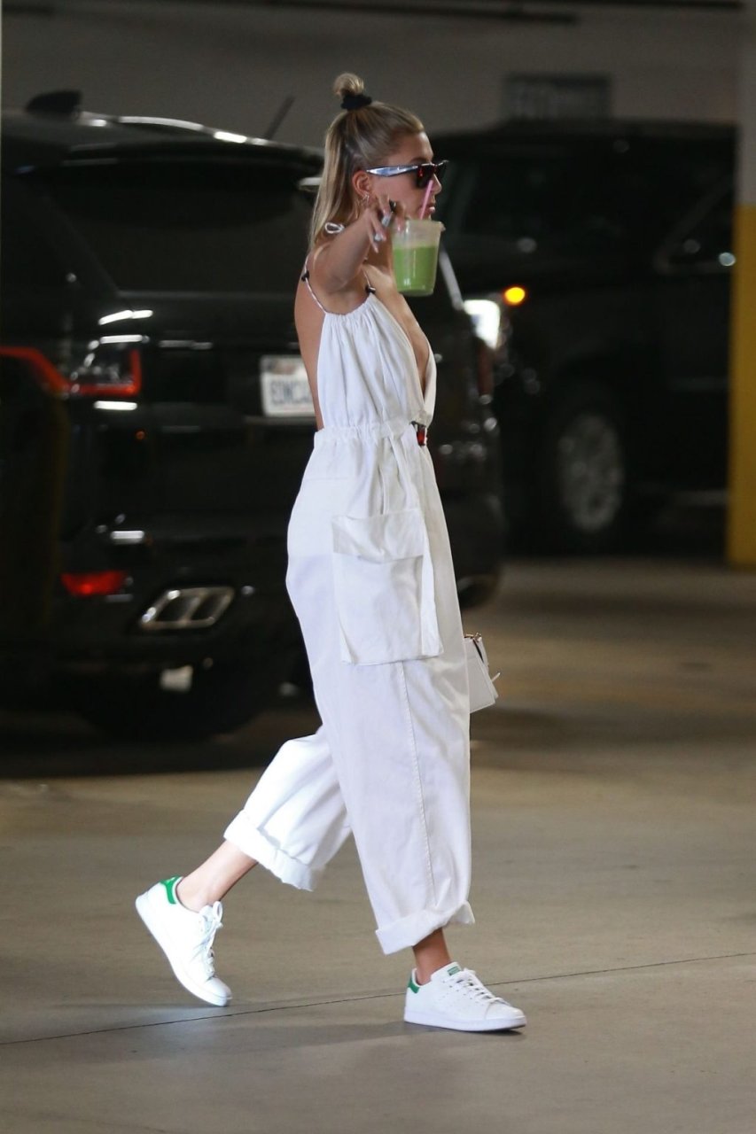 Hailey Bieber fait du shopping avec sa sécurité au marché Erewhon à Beverly Hills dans une tenue blanche dévoilant son décolleté, 12/06/2019.
