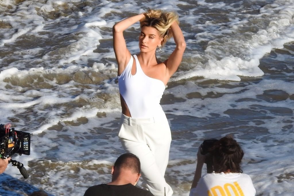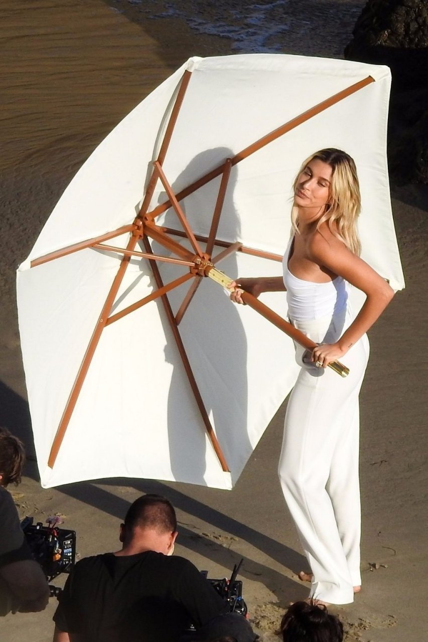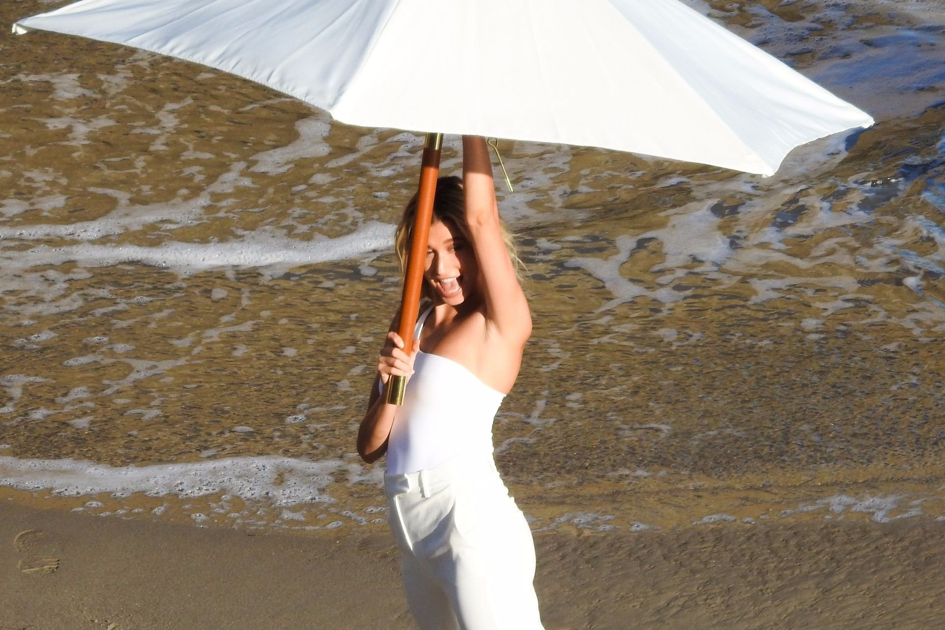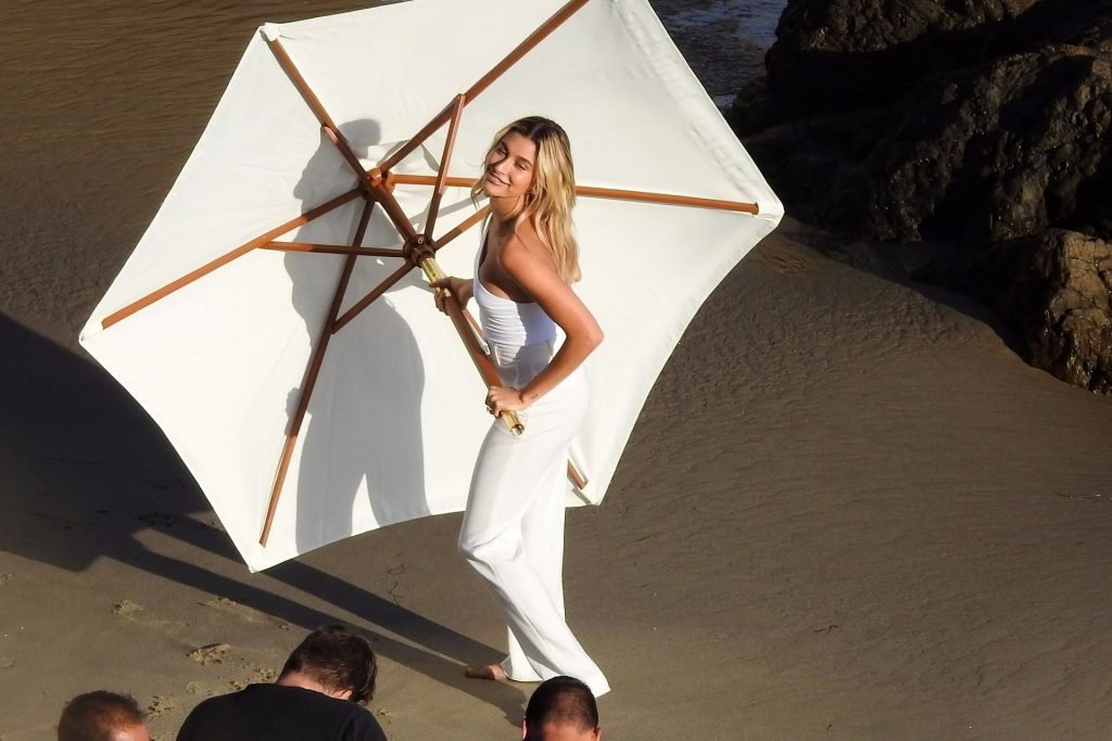 Hailey a posé sans relâche et changé de tenue, passant d’un short et d’un débardeur à un magnifique maillot de bain blanc avec un pantalon blanc, tenant un parasol de plage blanc. Le top model est le visage de la marque de cosmétiques emblématique depuis 2018.