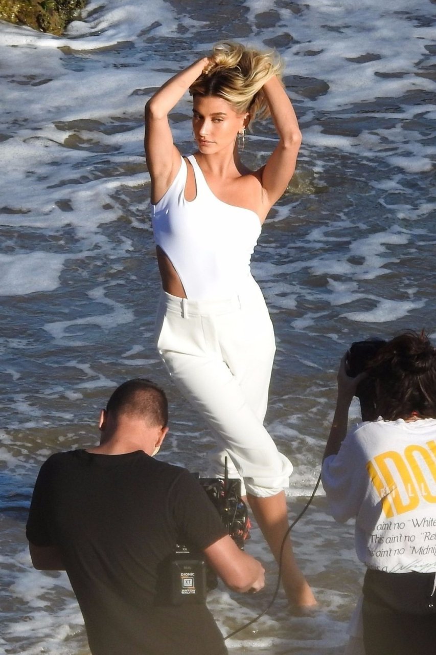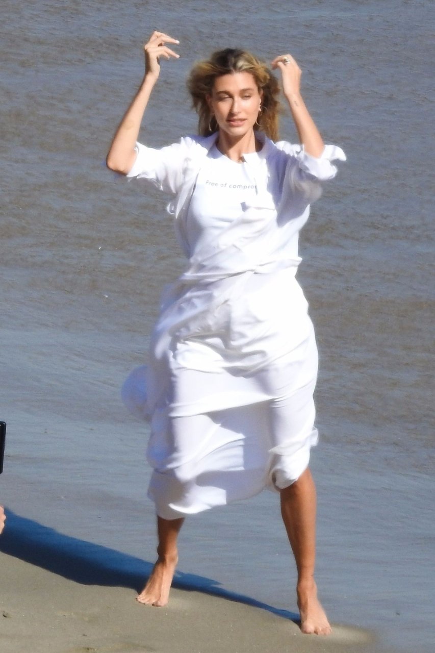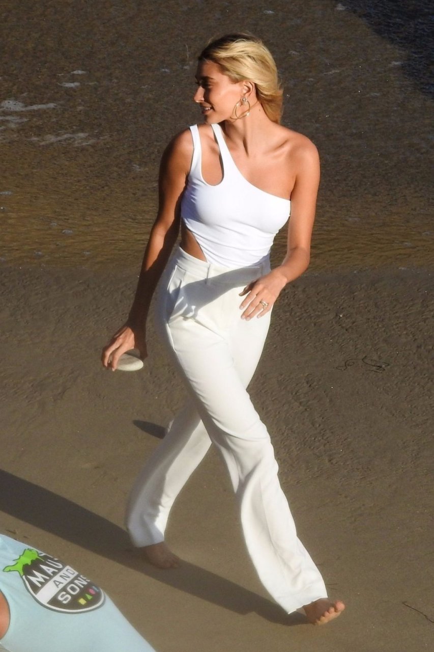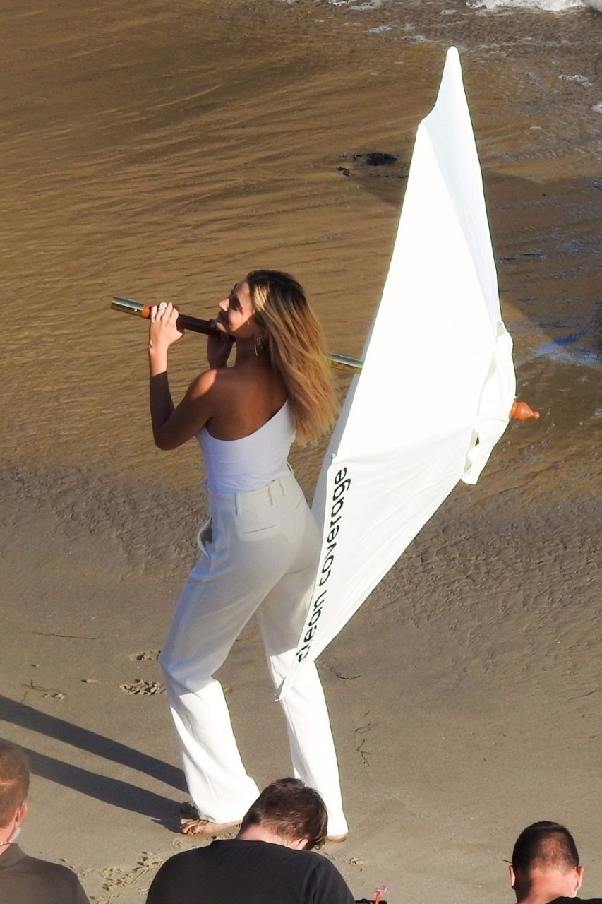 Hailey a posé sans relâche et changé de tenue, passant d’un short et d’un débardeur à un magnifique maillot de bain blanc avec un pantalon blanc, tenant un parasol de plage blanc. Le top model est le visage de la marque de cosmétiques emblématique depuis 2018.