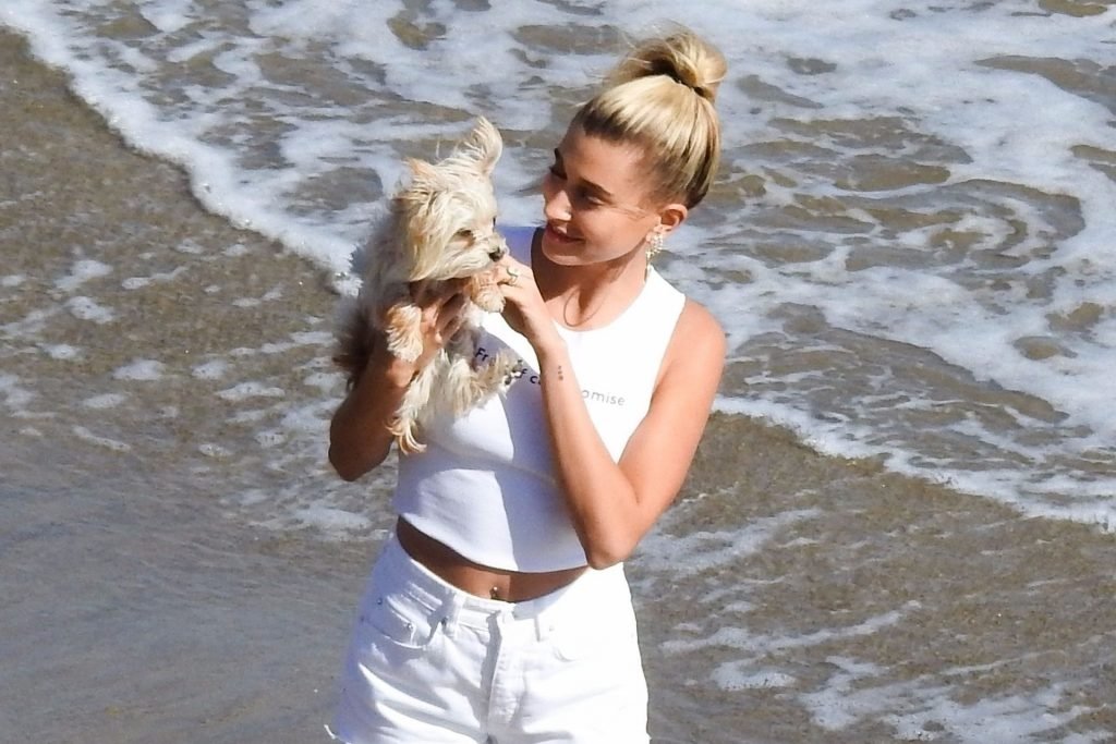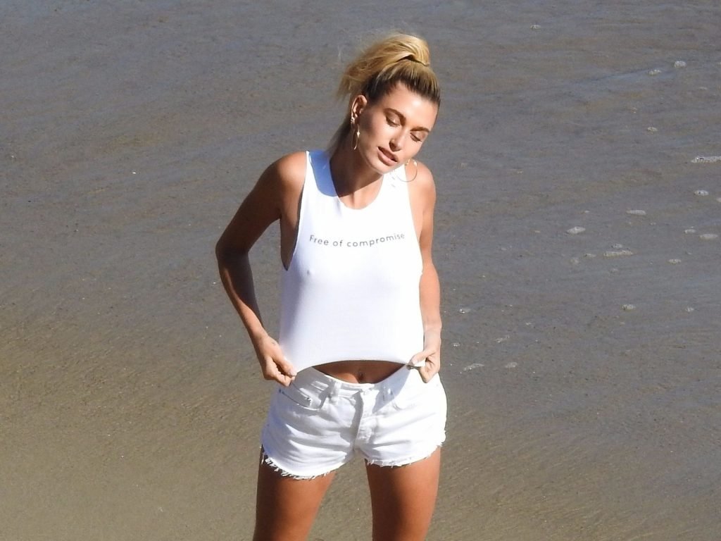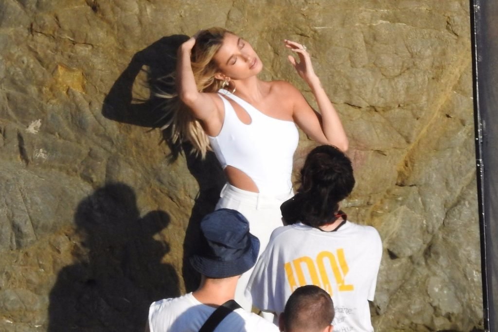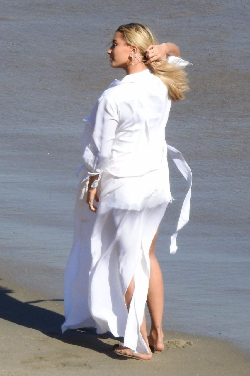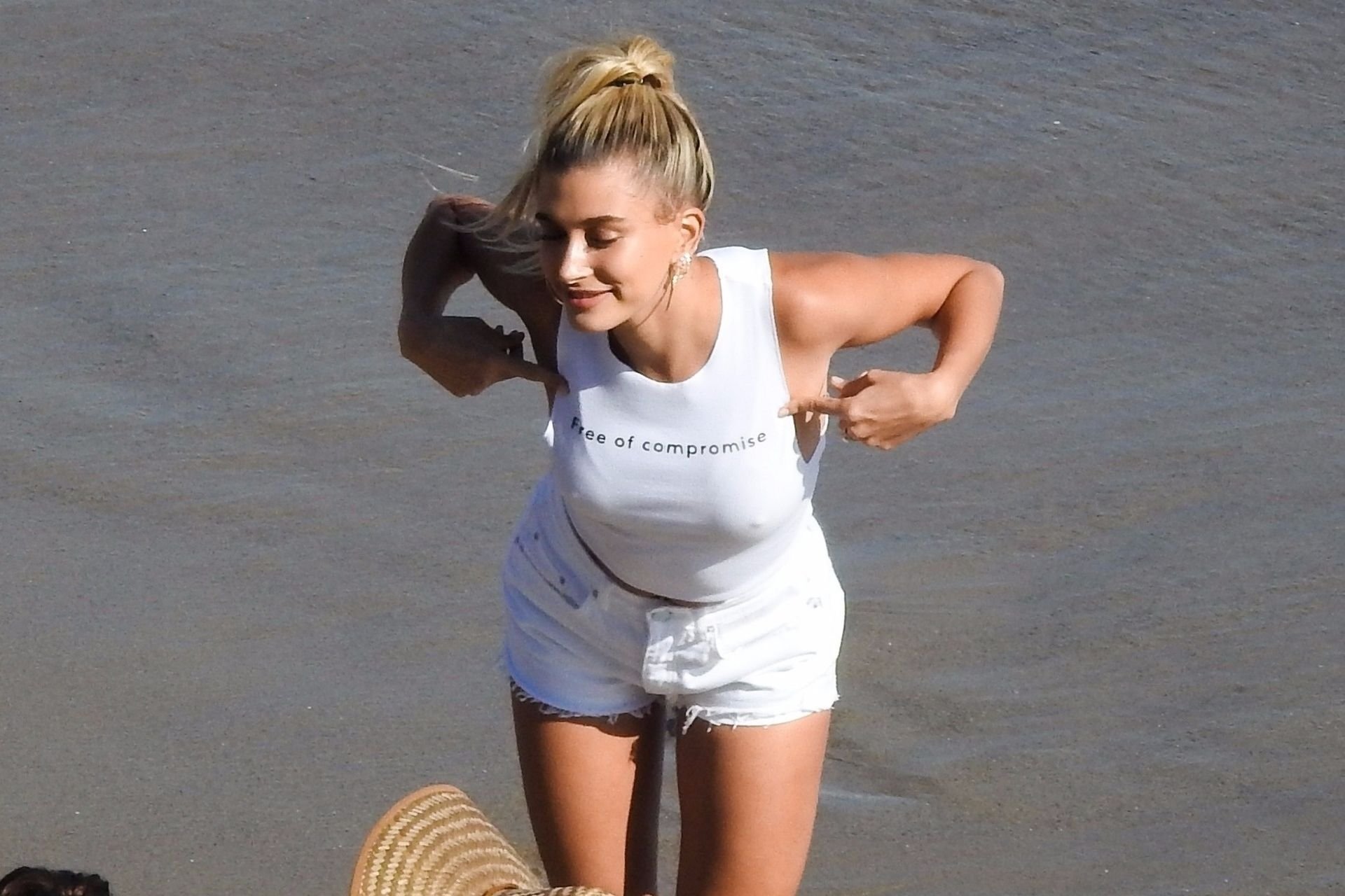 Hailey a posé sans relâche et changé de tenue, passant d’un short et d’un débardeur à un magnifique maillot de bain blanc avec un pantalon blanc, tenant un parasol de plage blanc. Le top model est le visage de la marque de cosmétiques emblématique depuis 2018.