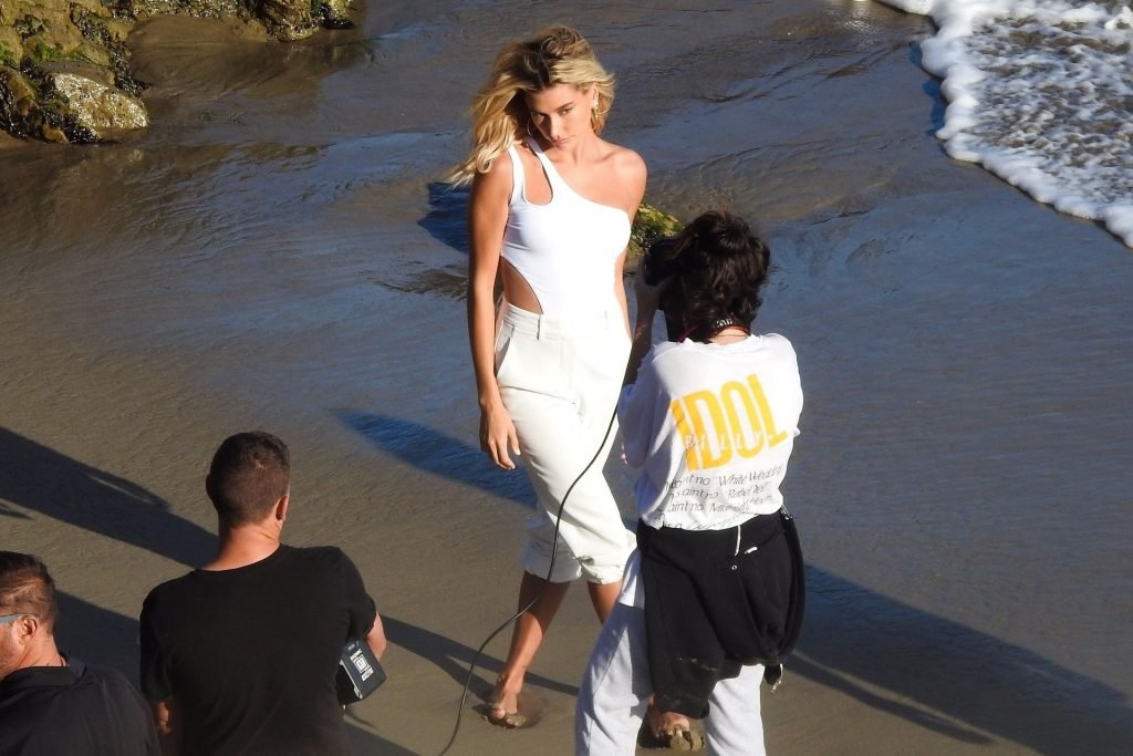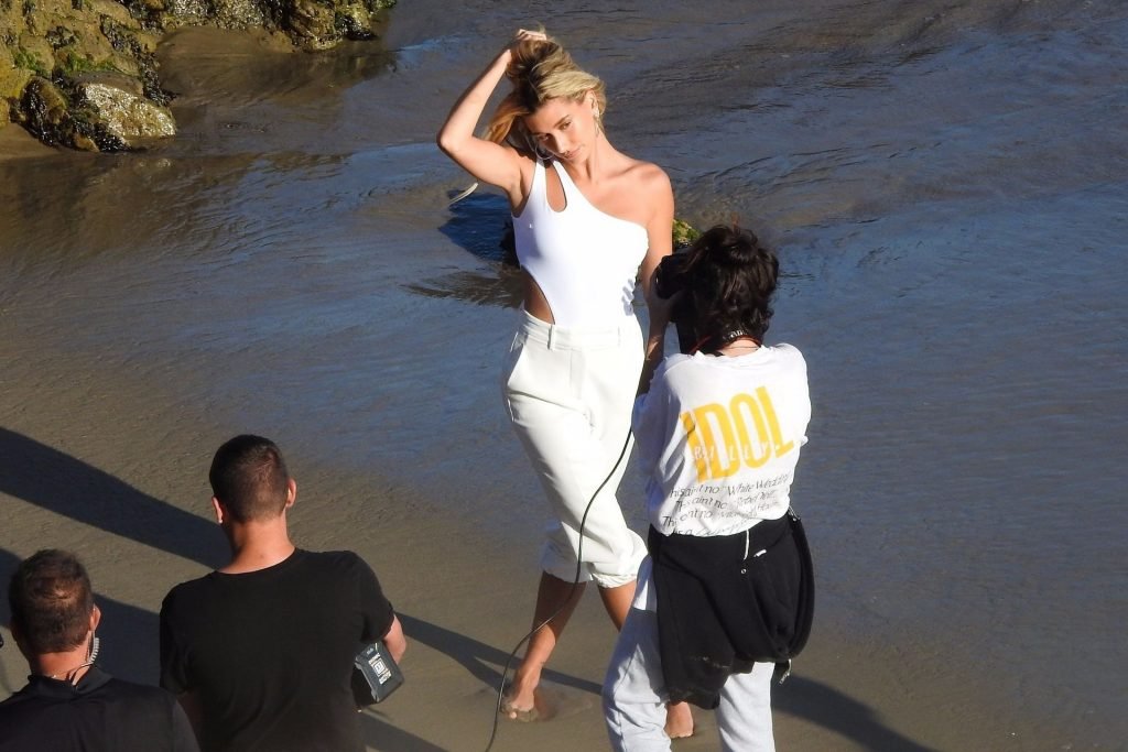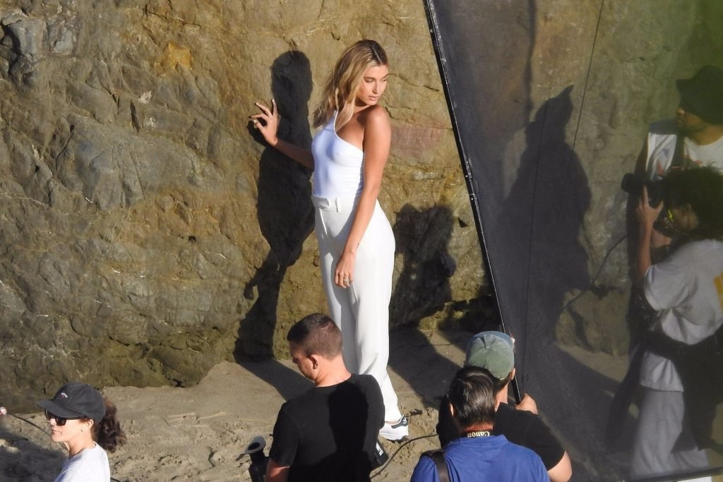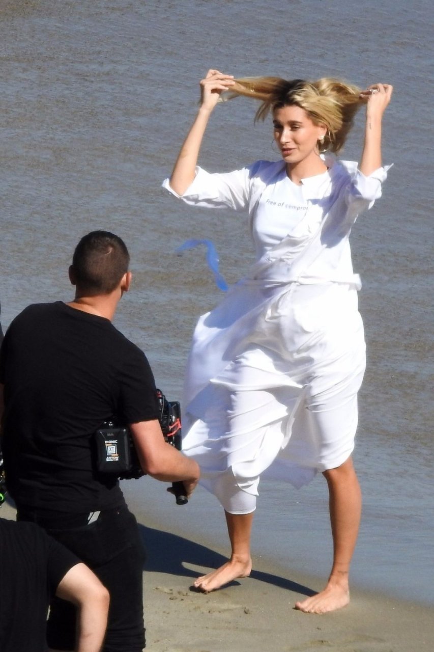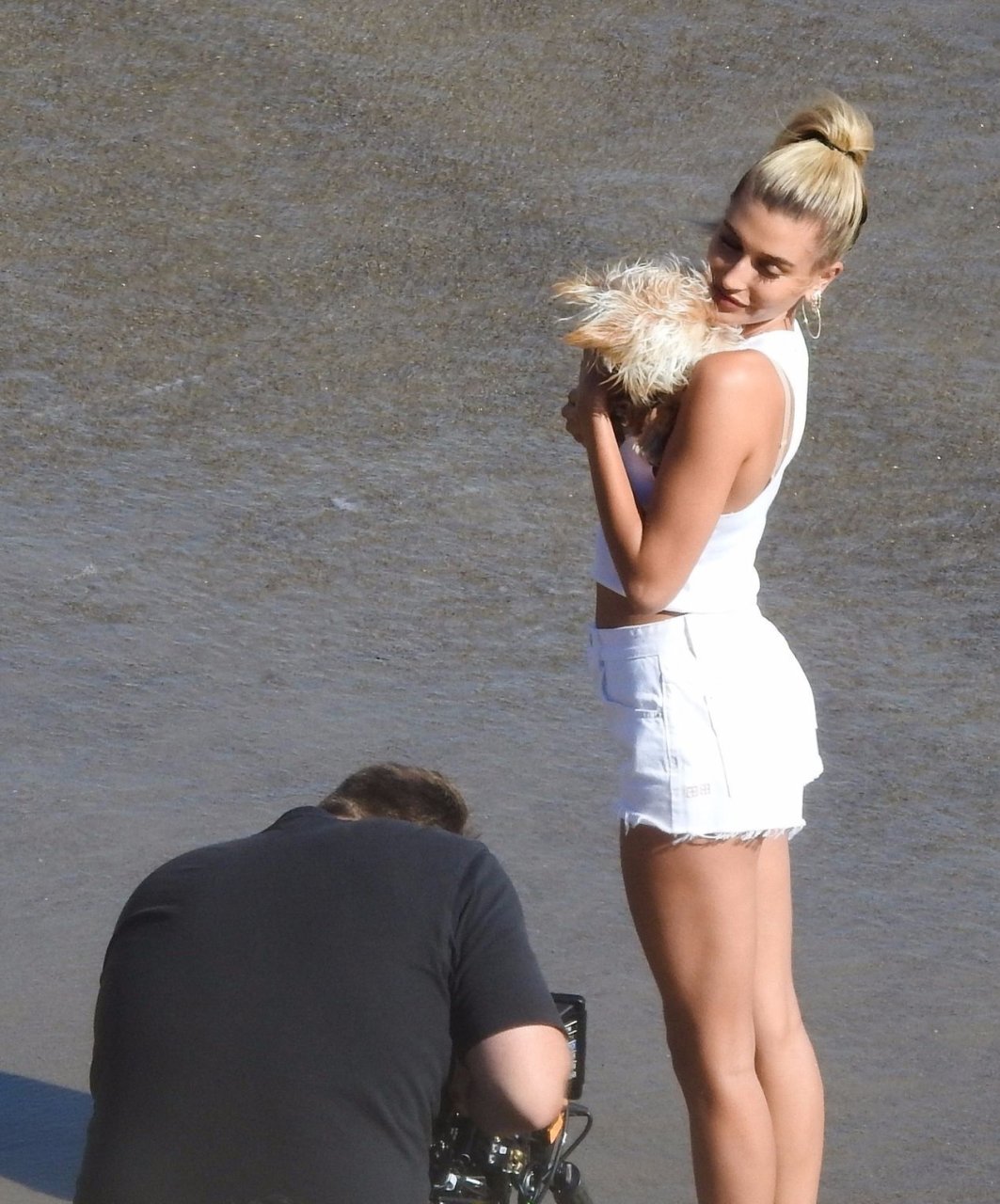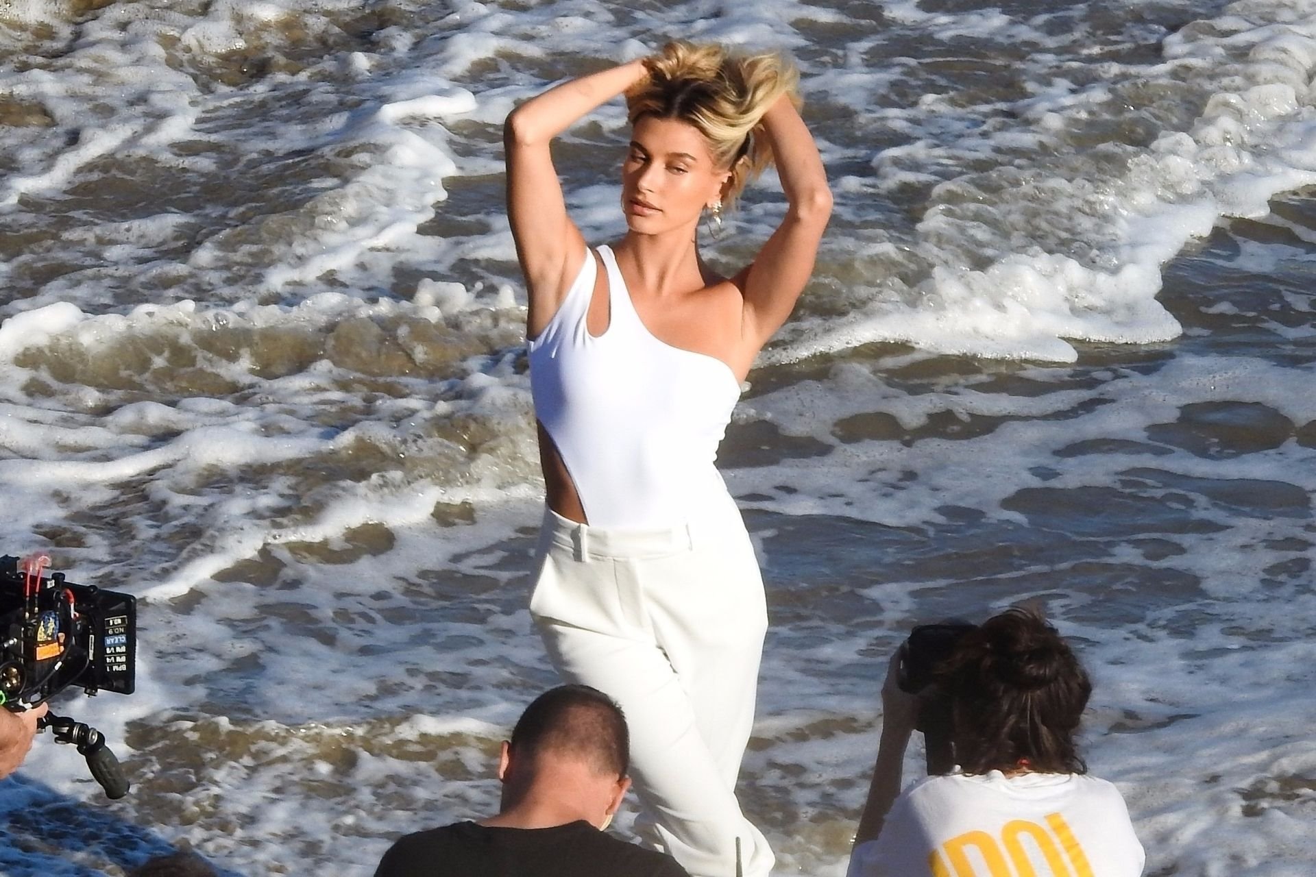 Hailey Bieber fait une séance photo sur la plage de Malibu pour les cosmétiques Bare Minerals, 23/07/2019.