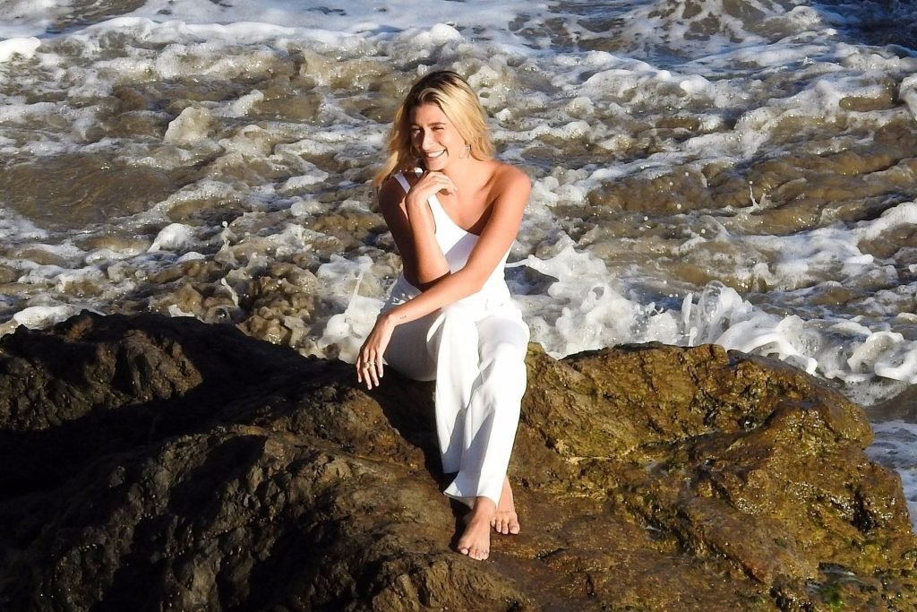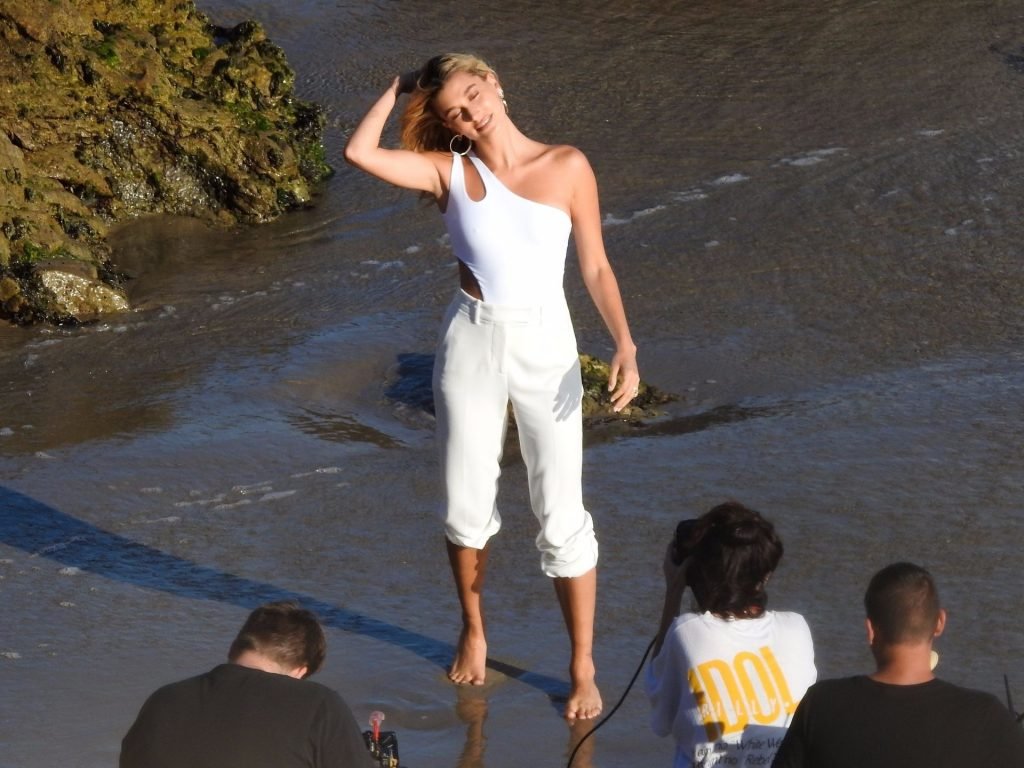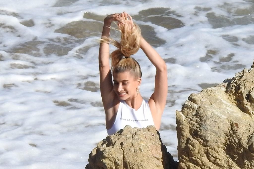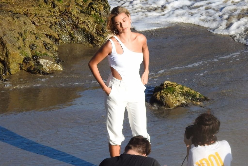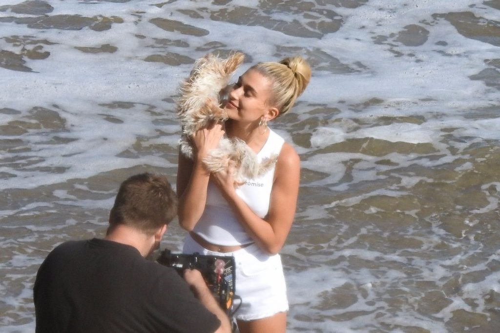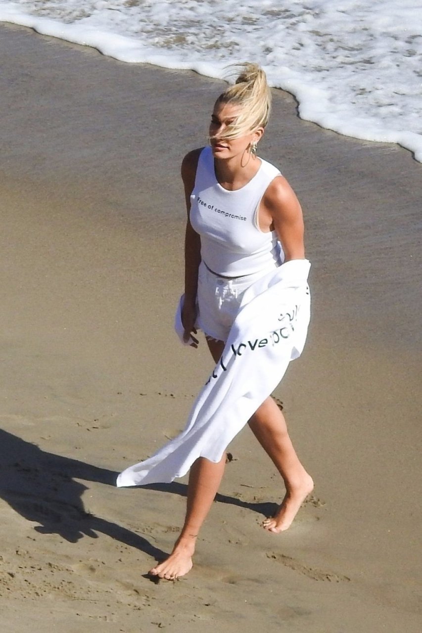 Hailey Bieber fait une séance photo sur la plage de Malibu pour les cosmétiques Bare Minerals, 23/07/2019.