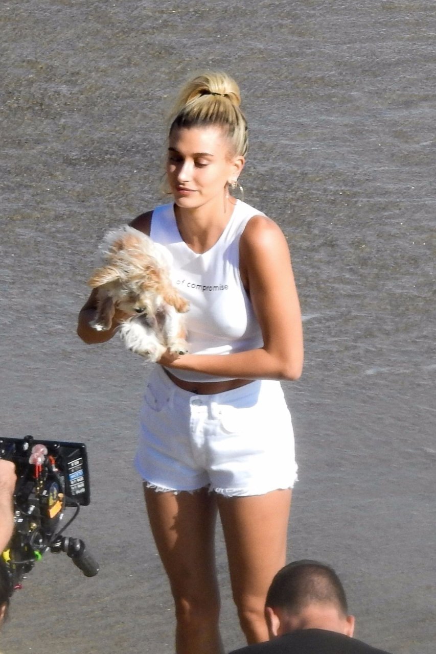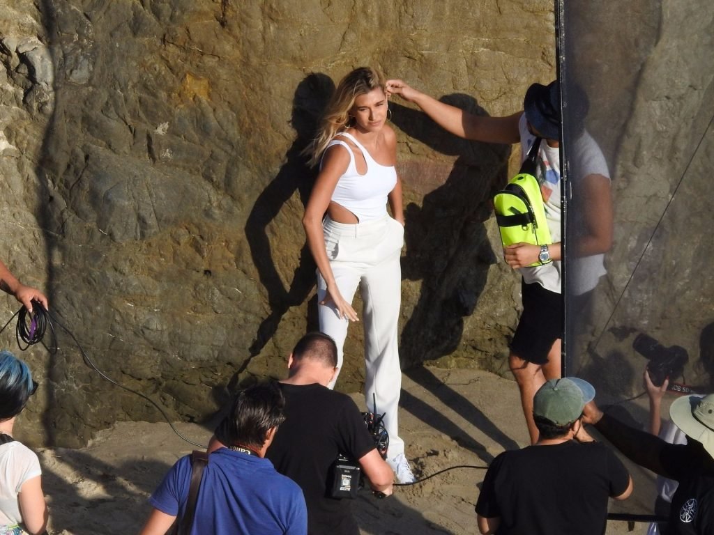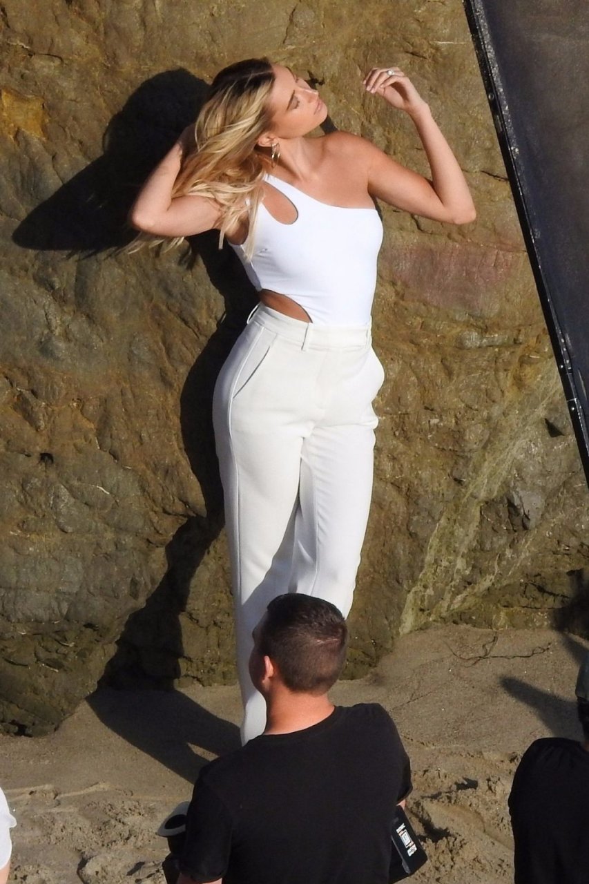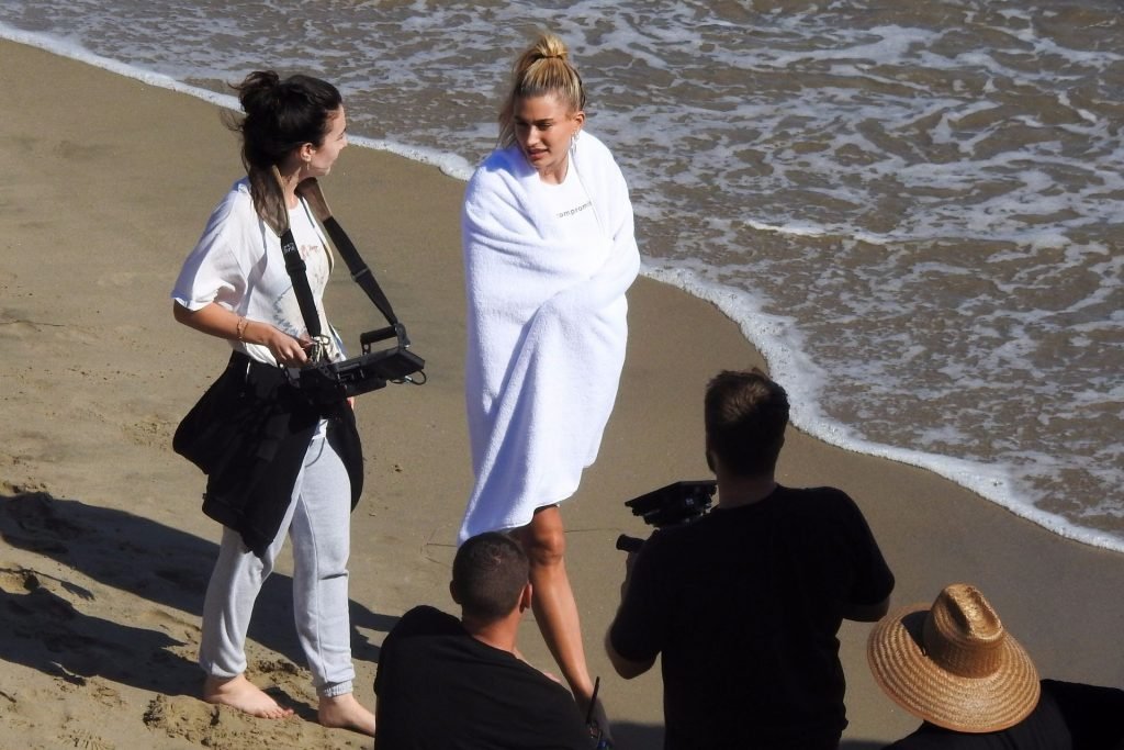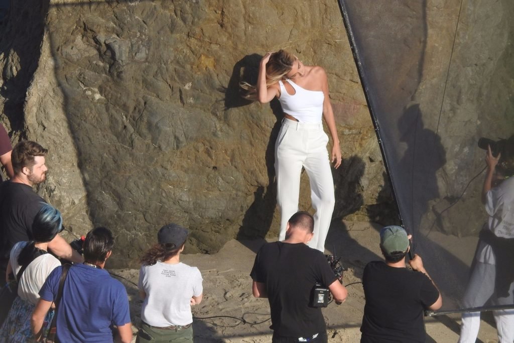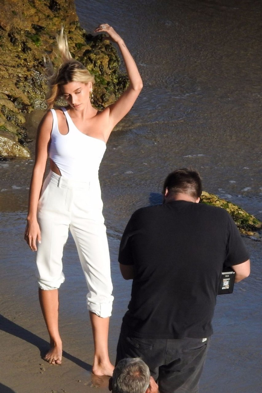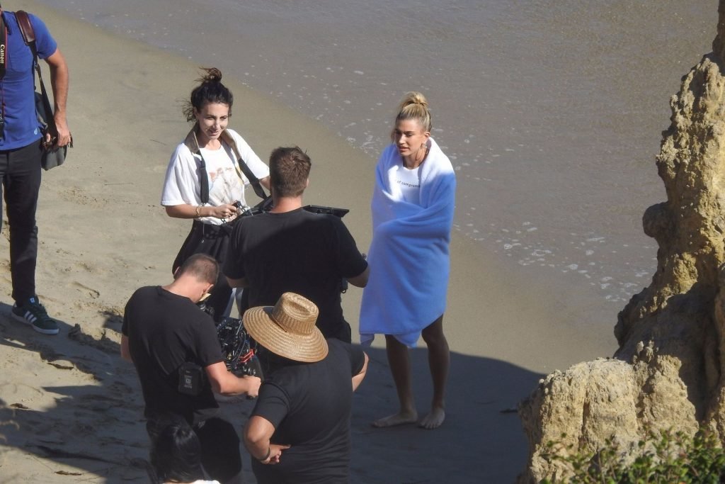 Hailey Bieber fait une séance photo sur la plage de Malibu pour les cosmétiques Bare Minerals, 23/07/2019.