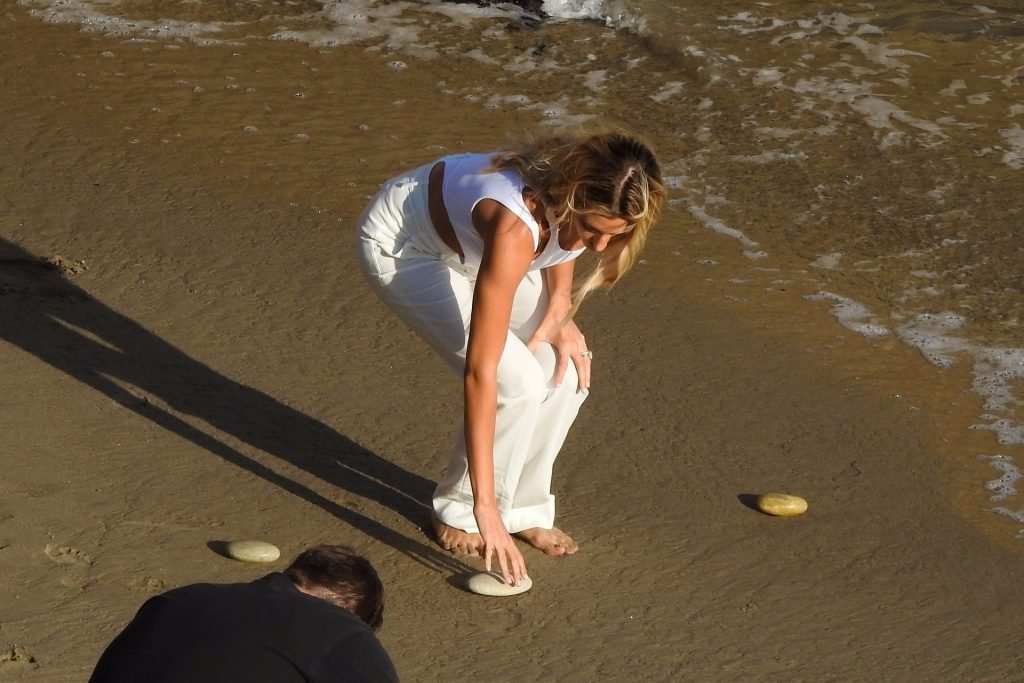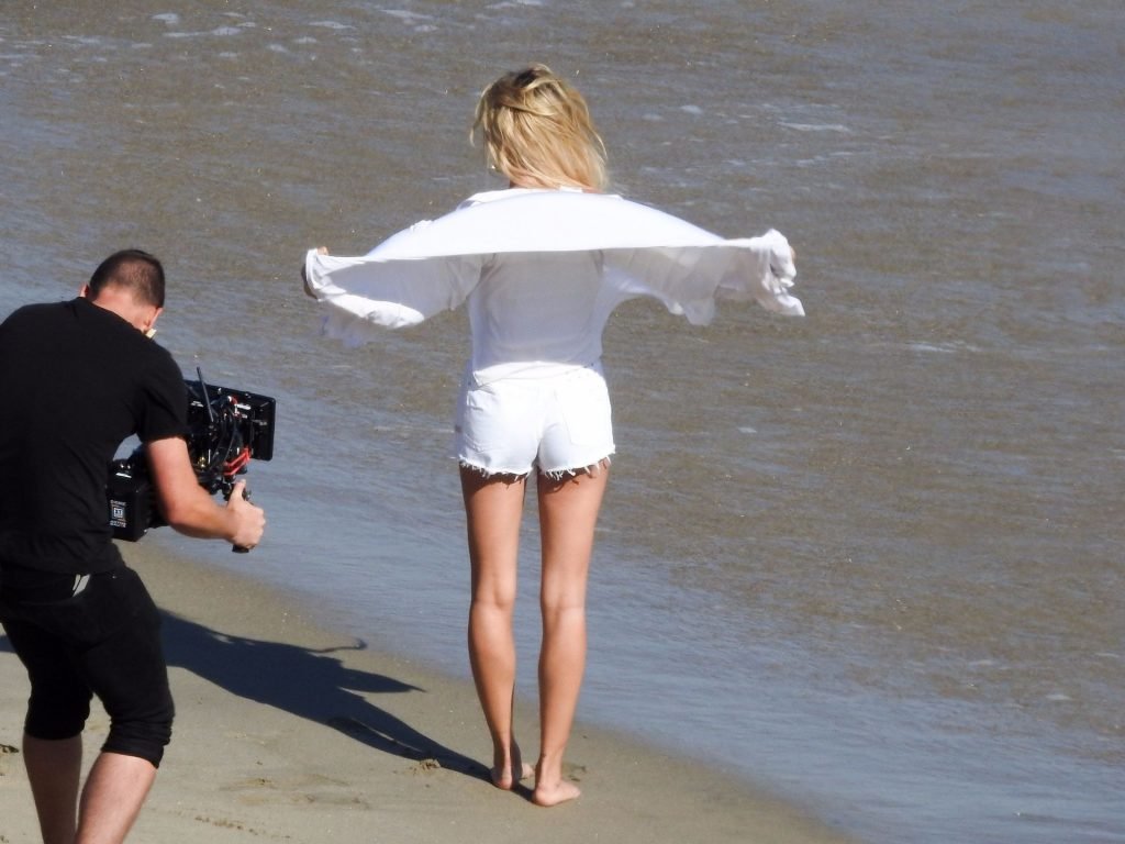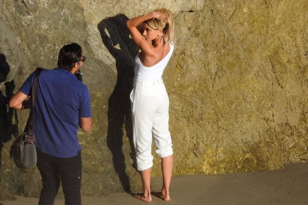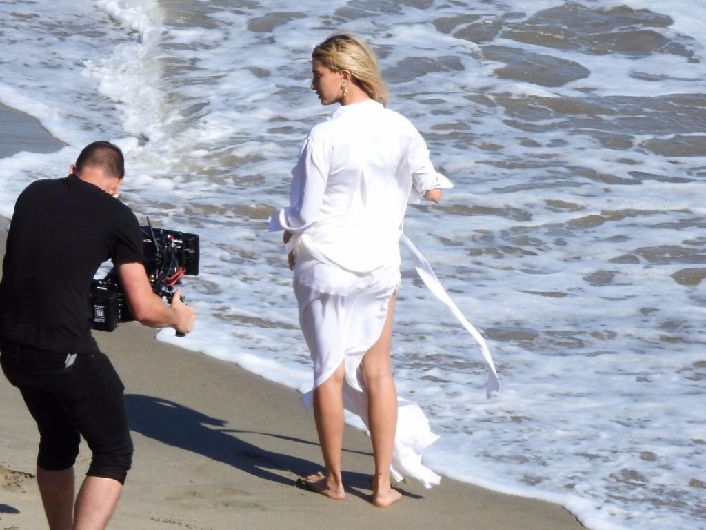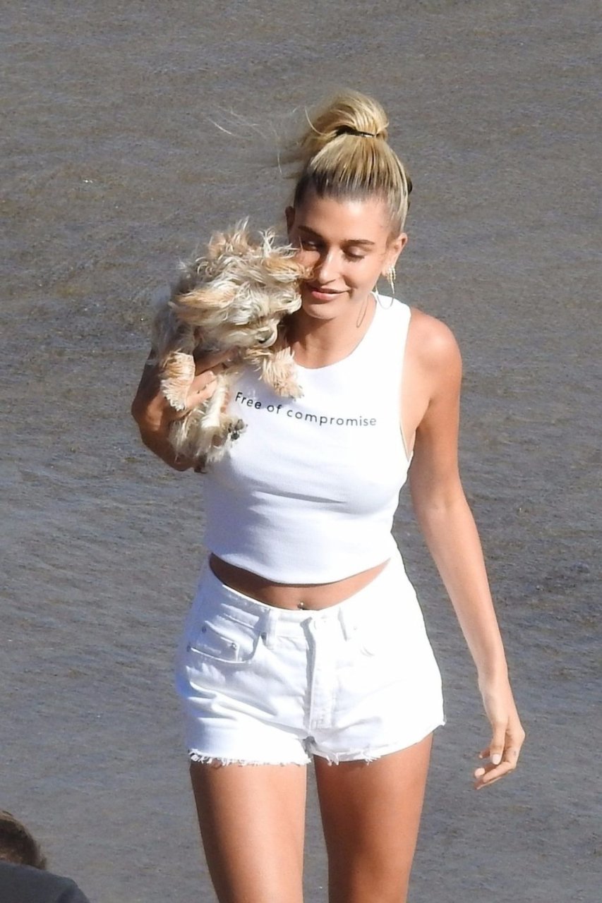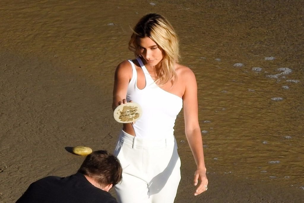 Hailey Bieber fait une séance photo sur la plage de Malibu pour les cosmétiques Bare Minerals, 23/07/2019.