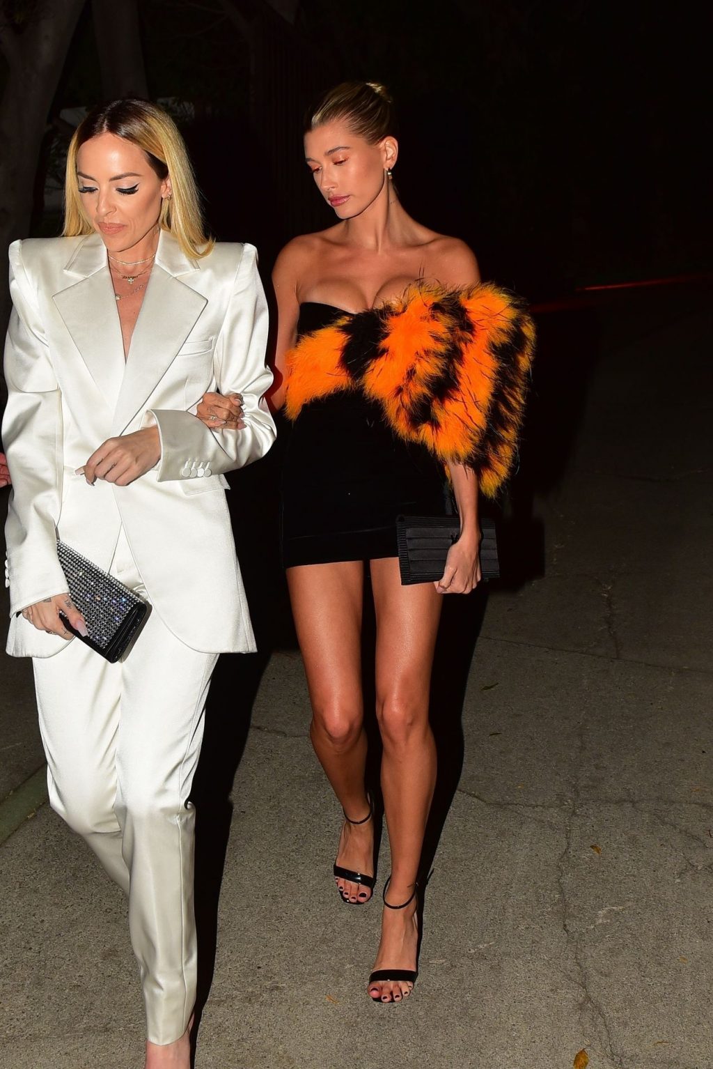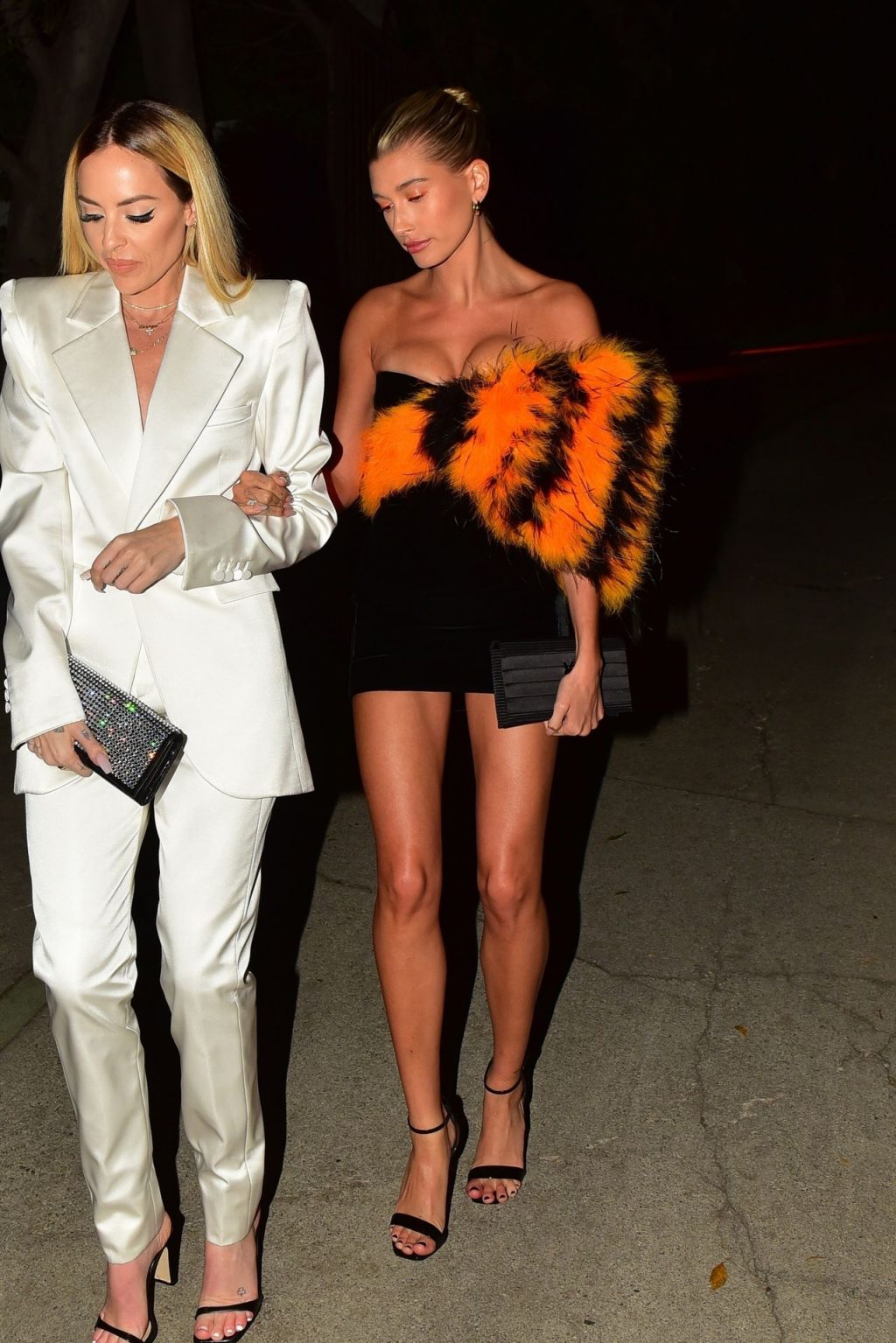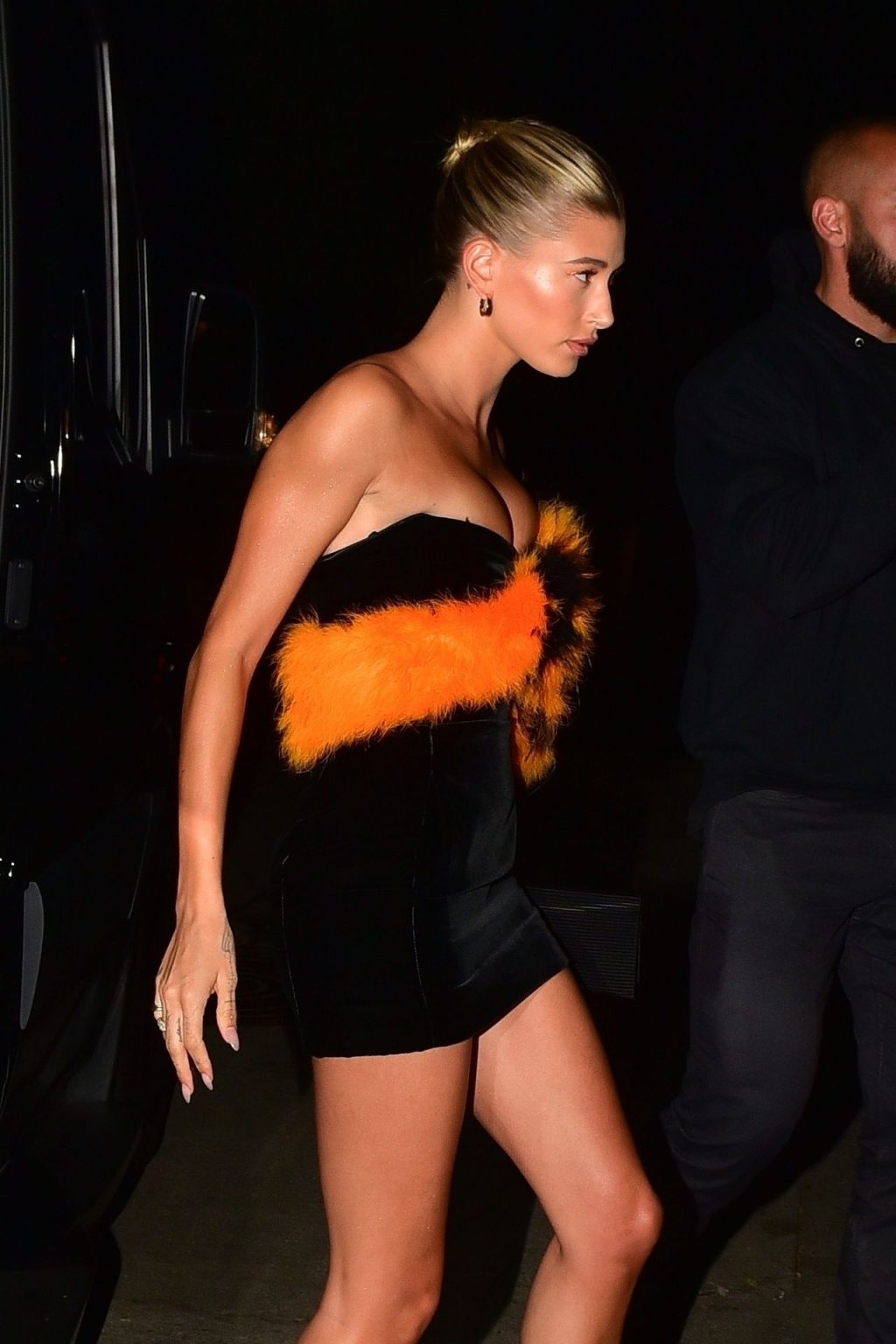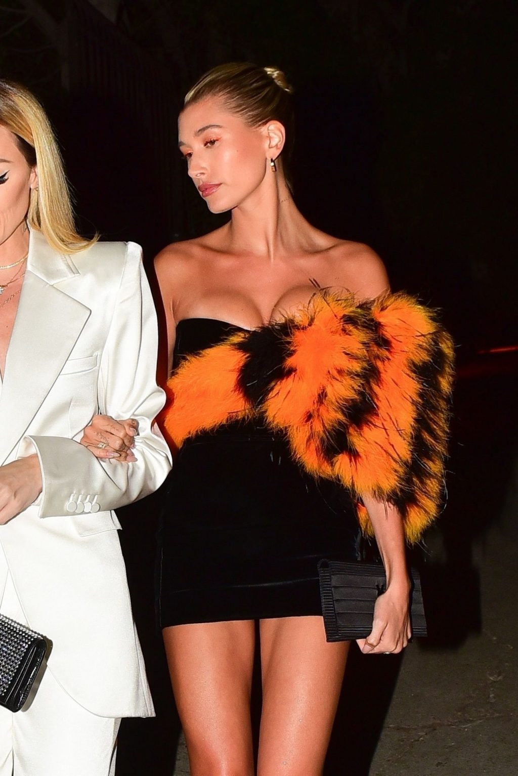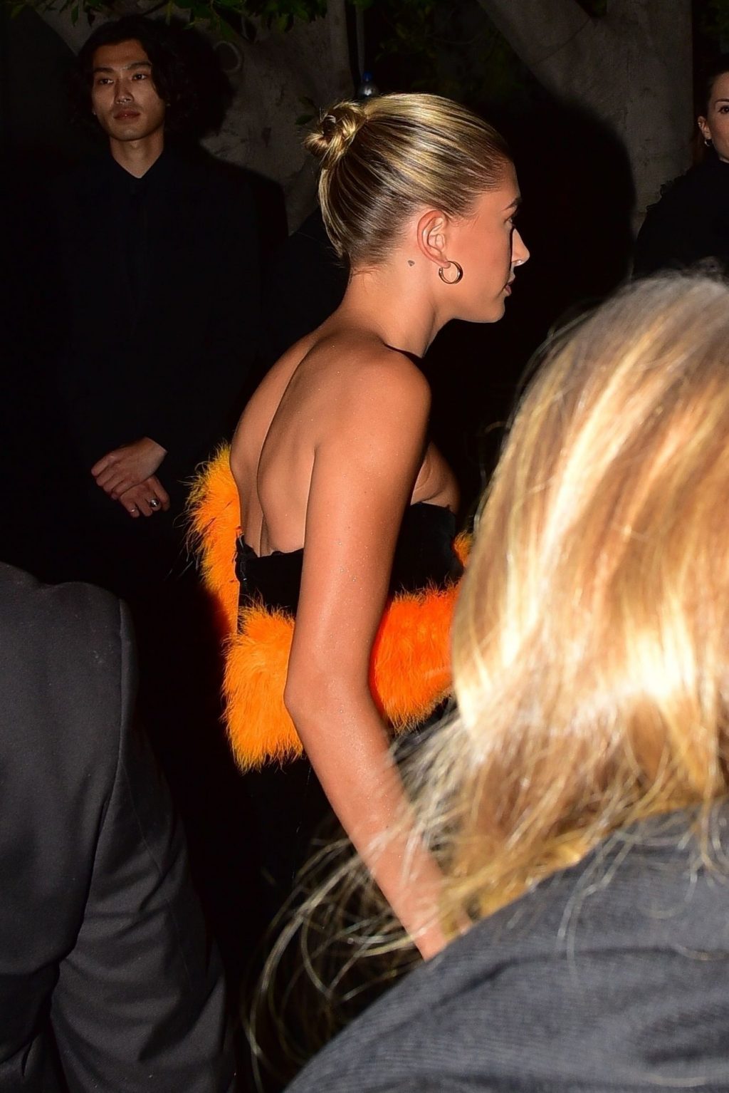 Hailey Bieber est sexy dans une robe noire avec des accents orange en arrivant à la fête YSL à Los Angeles, 01/04/2020.