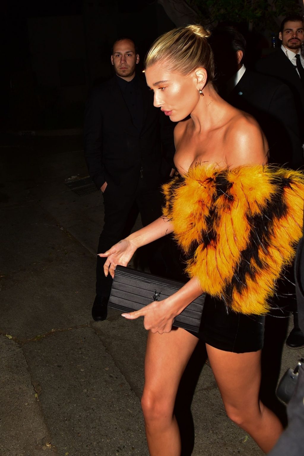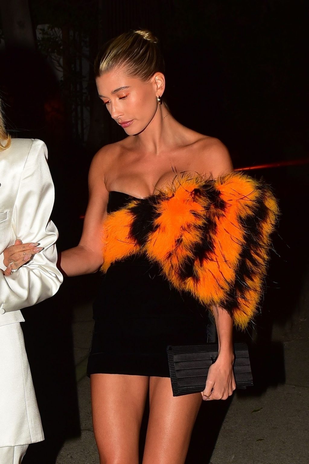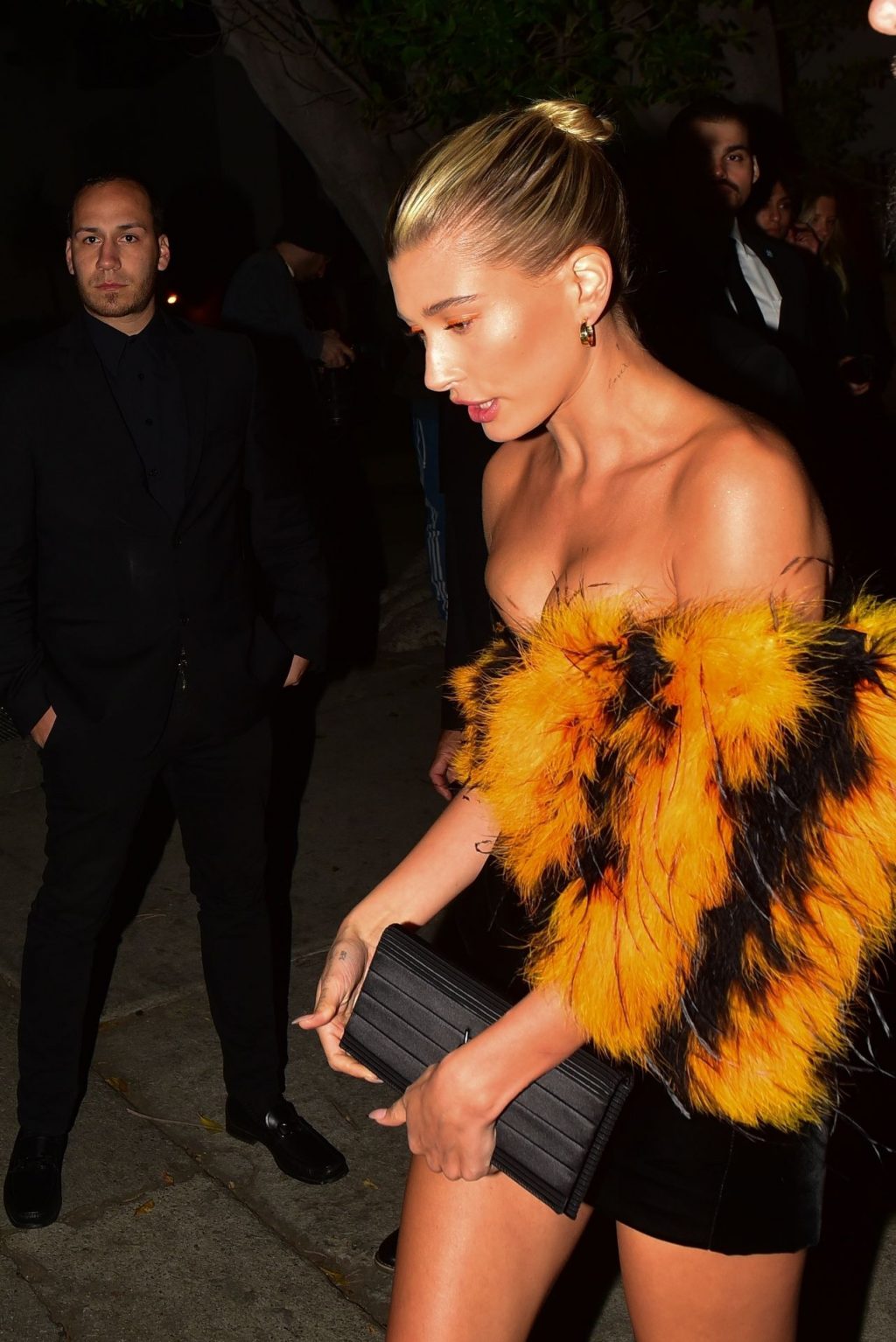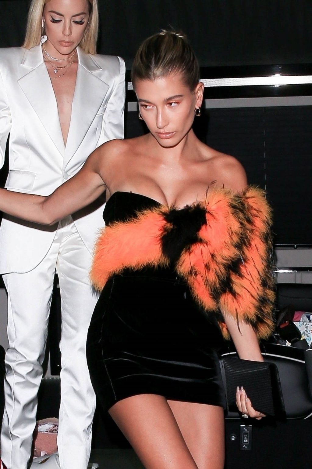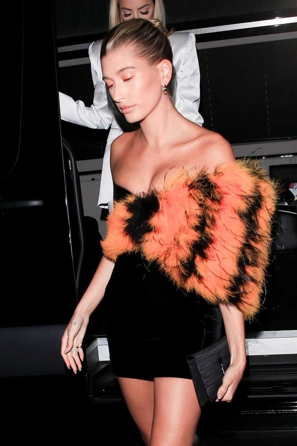 Hailey Bieber est sexy dans une robe noire avec des accents orange en arrivant à la fête YSL à Los Angeles, 01/04/2020.