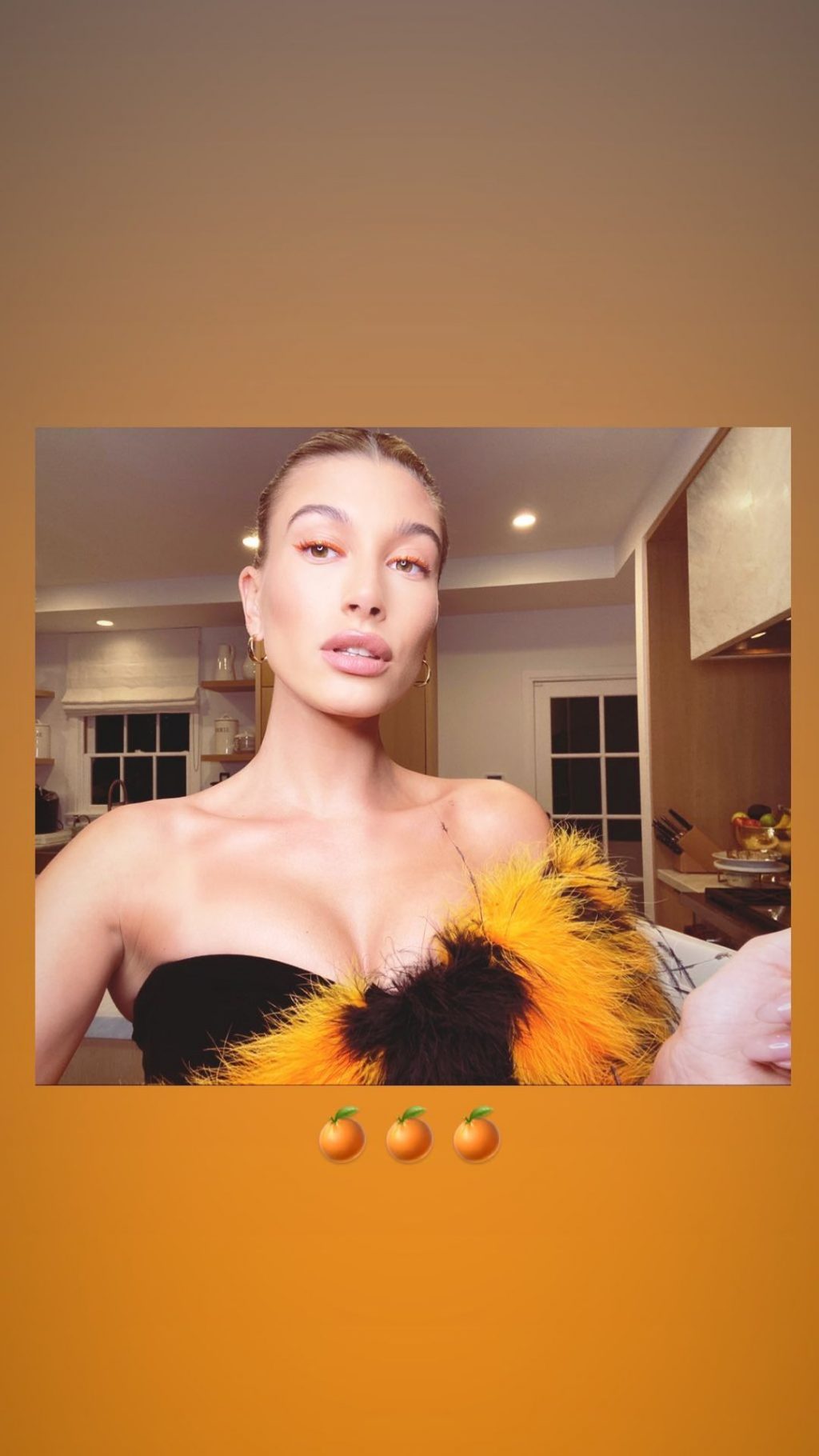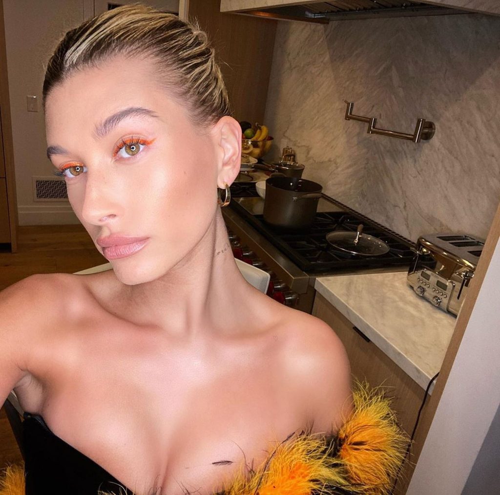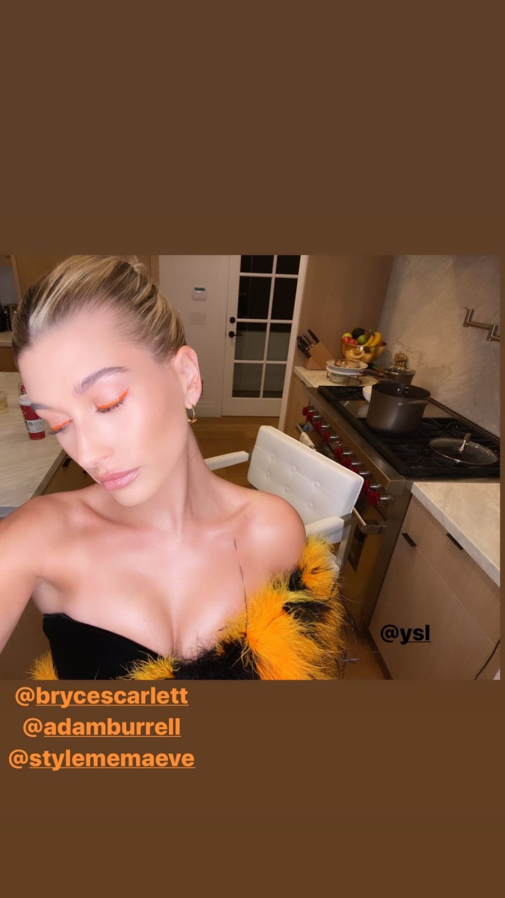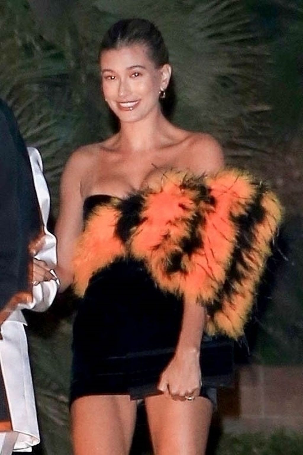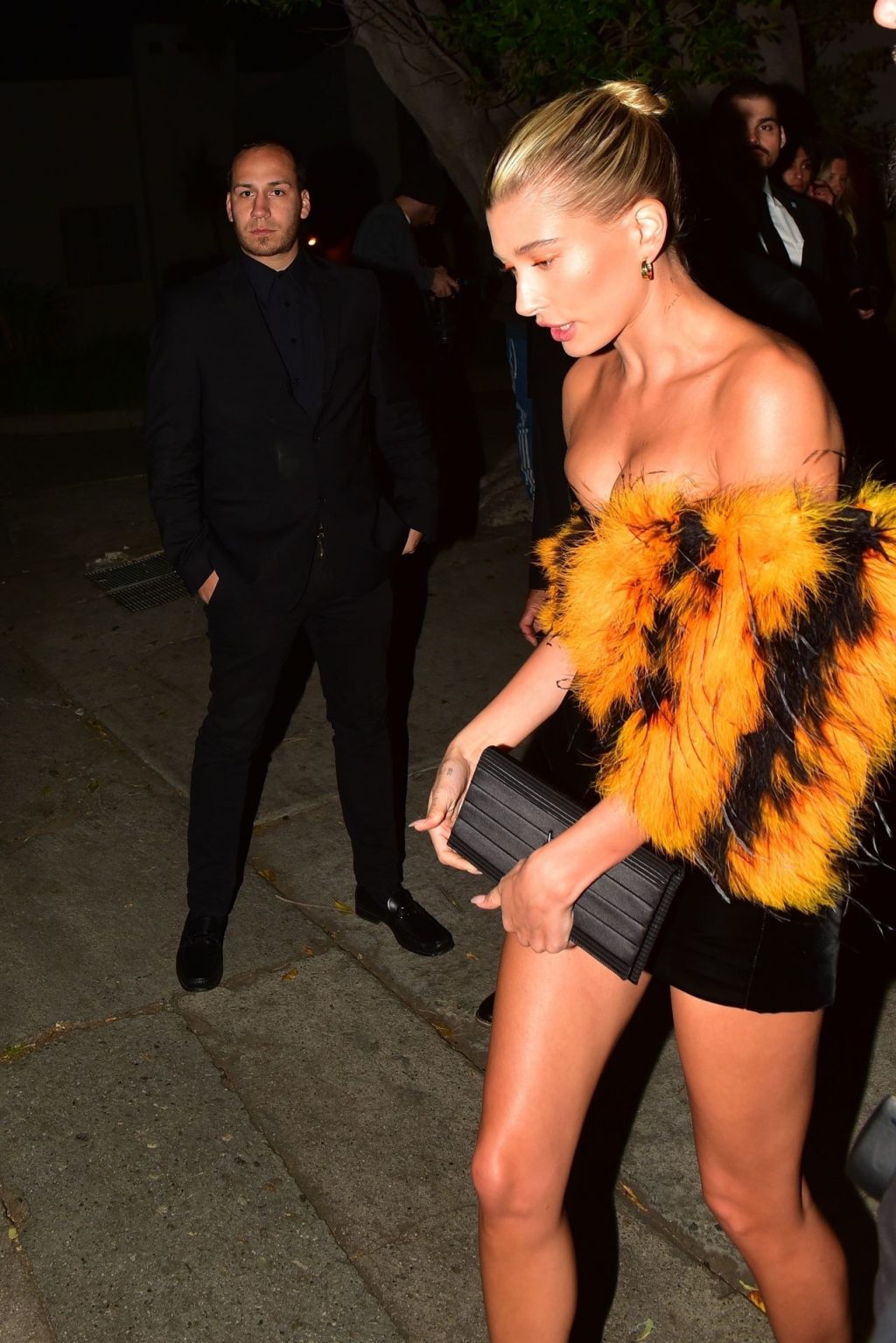 Hailey Bieber est sexy dans une robe noire avec des accents orange en arrivant à la fête YSL à Los Angeles, 01/04/2020.