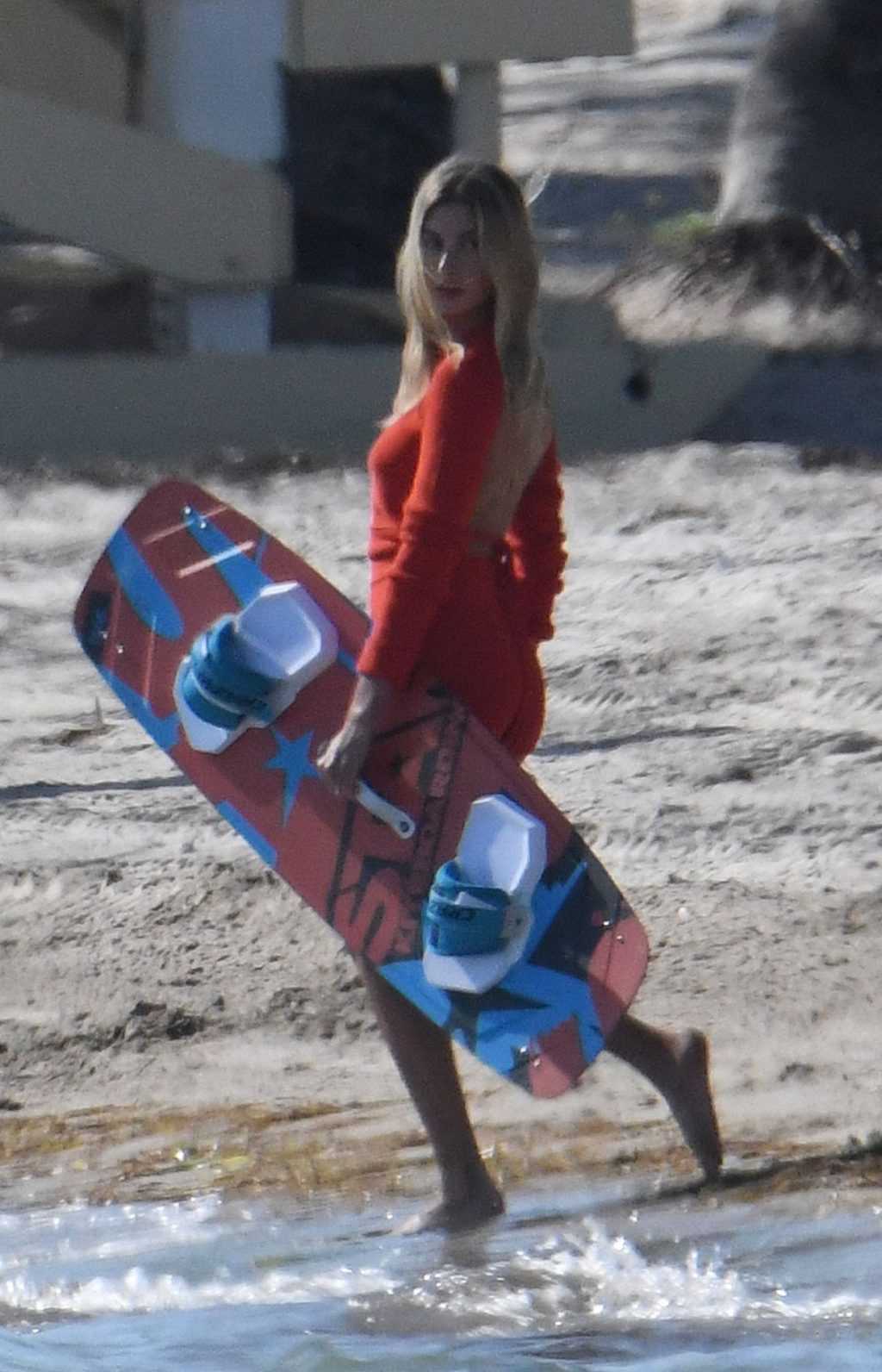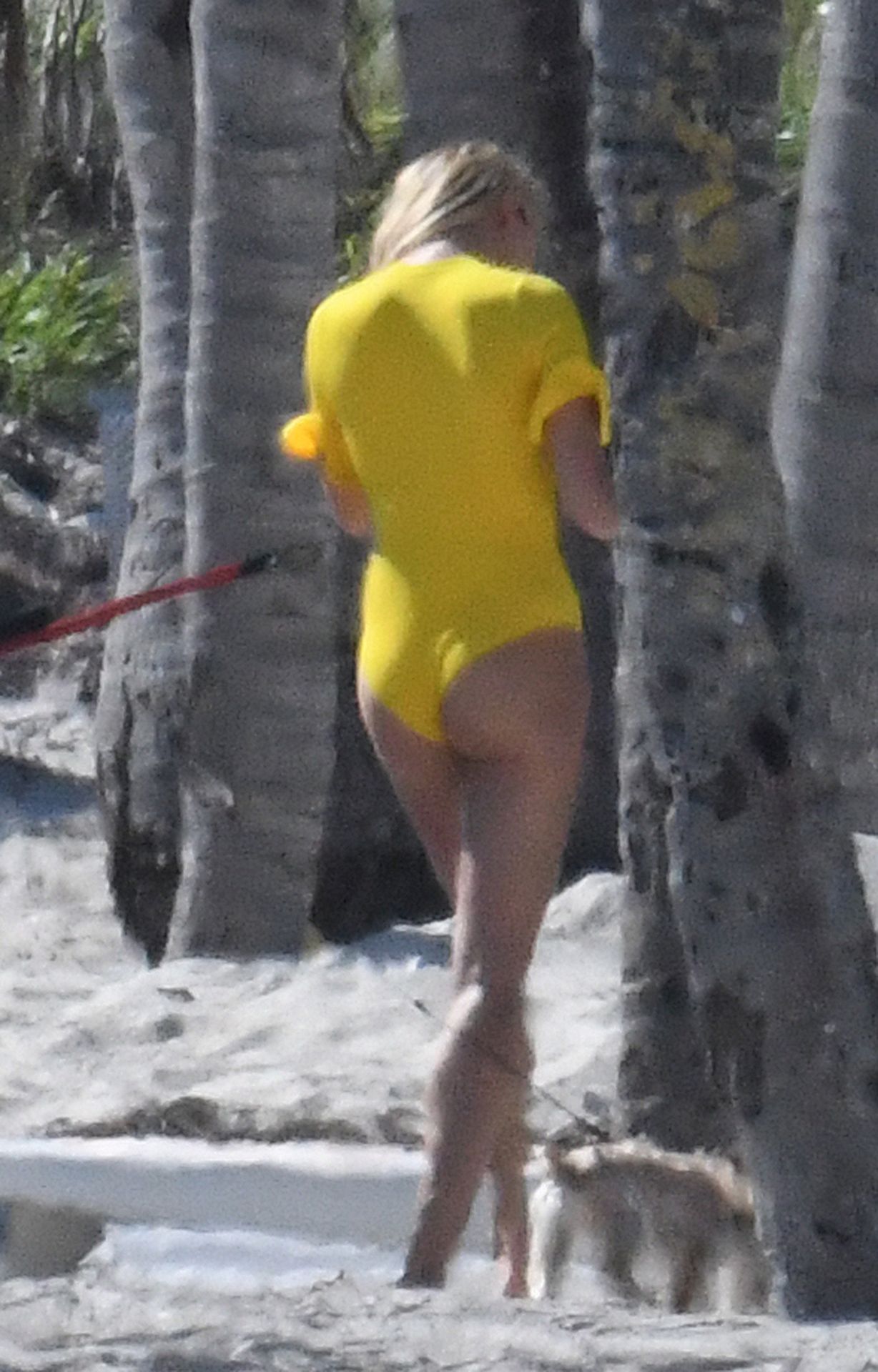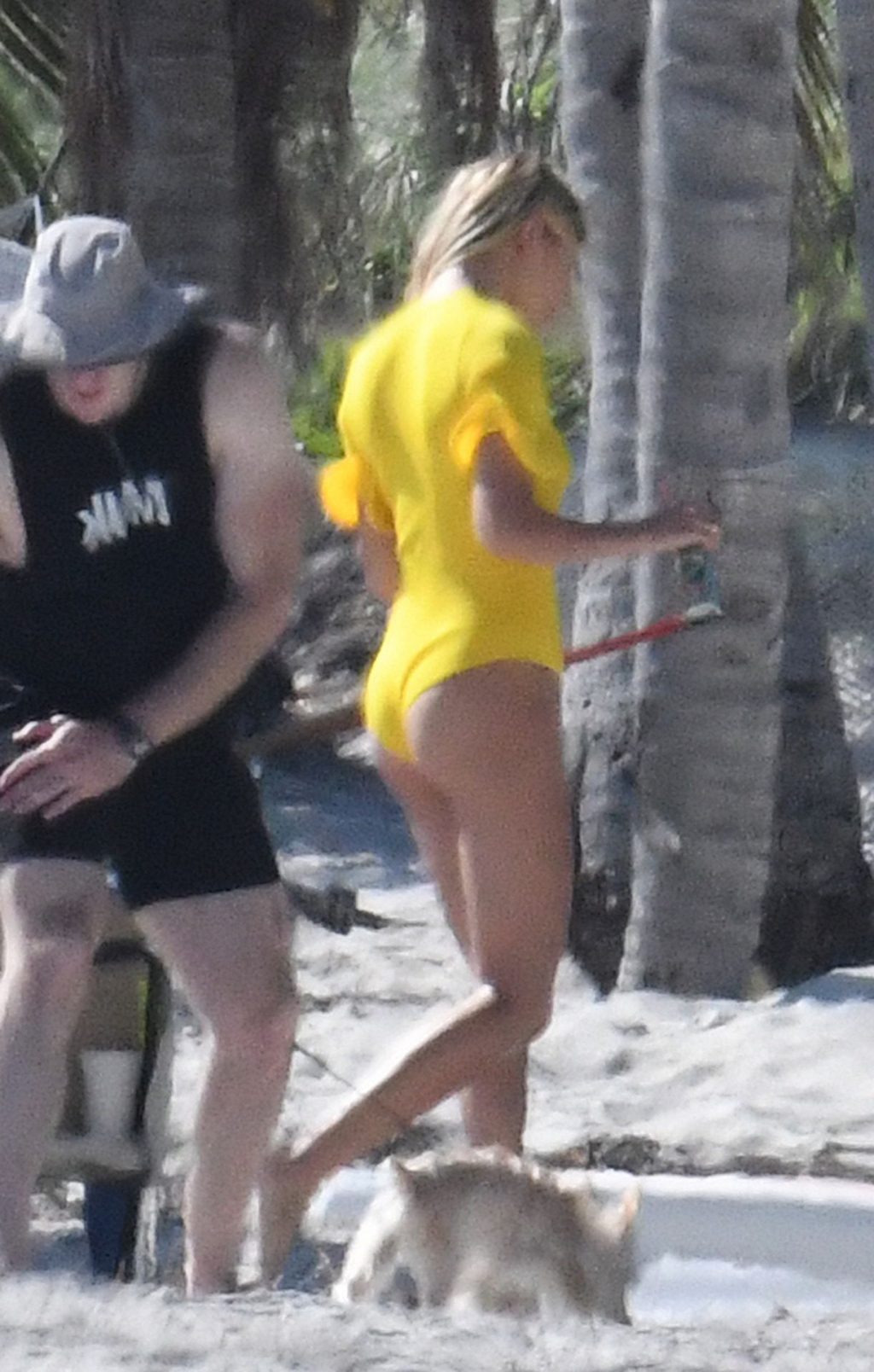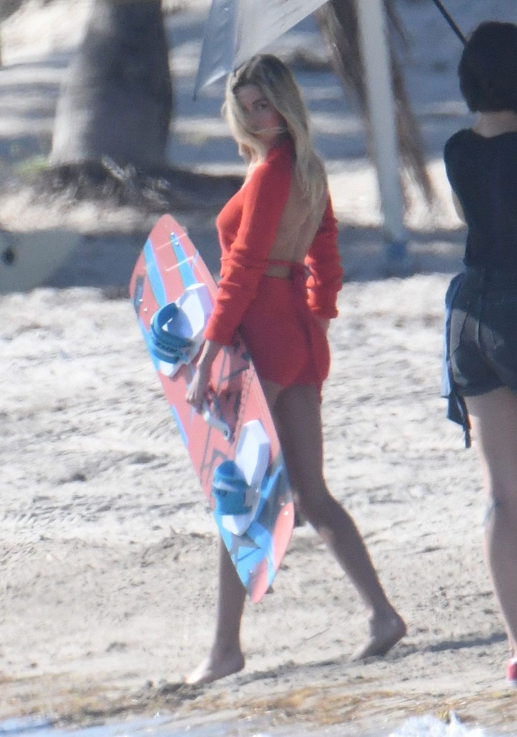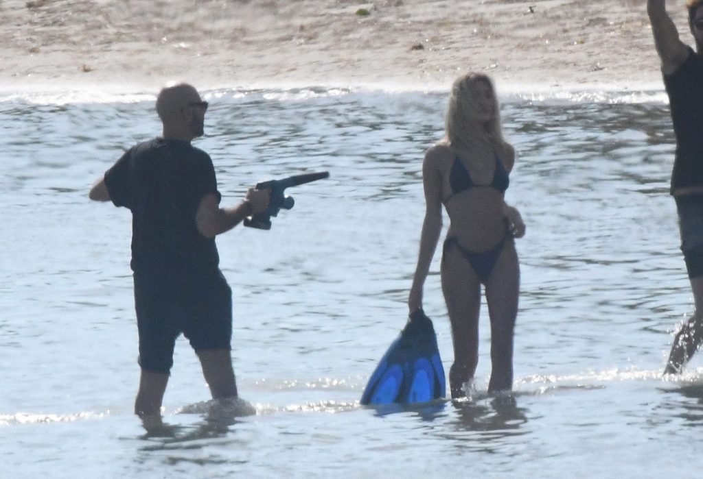Le mannequin Hailey Bieber porte un maillot de bain bleu, rouge et jaune alors qu’elle pose lors d’une séance photo sur la plage de Miami, le 27/11/2019.
