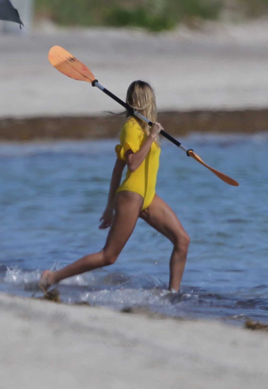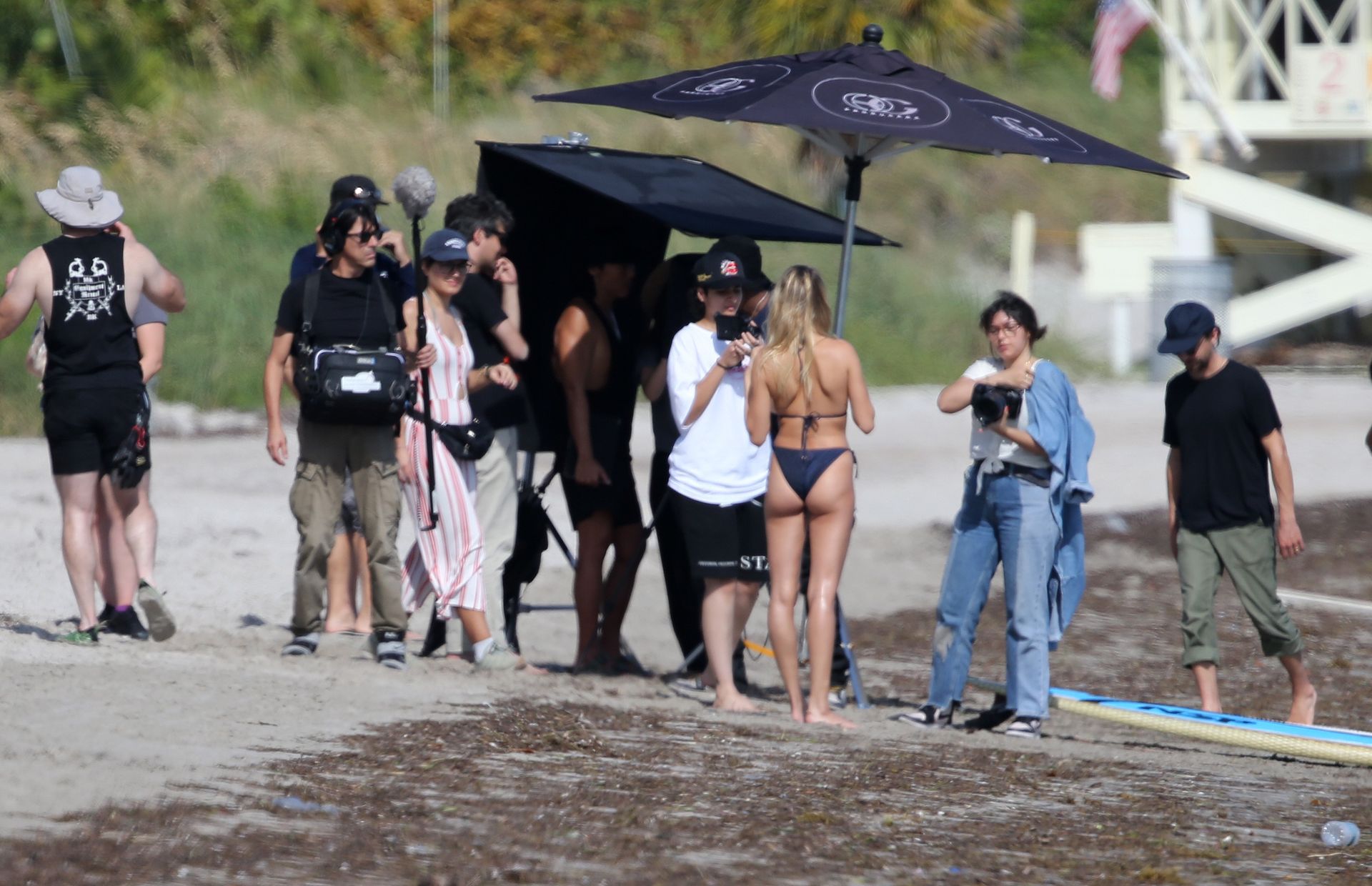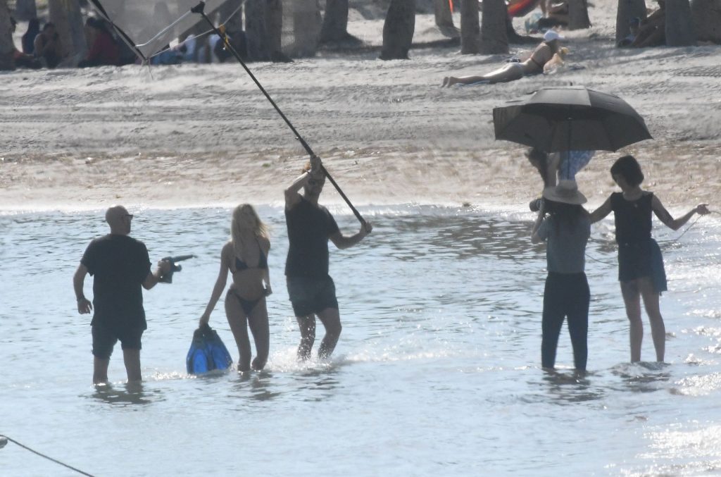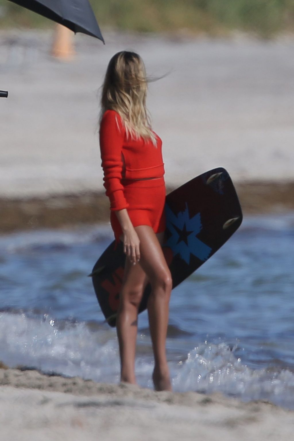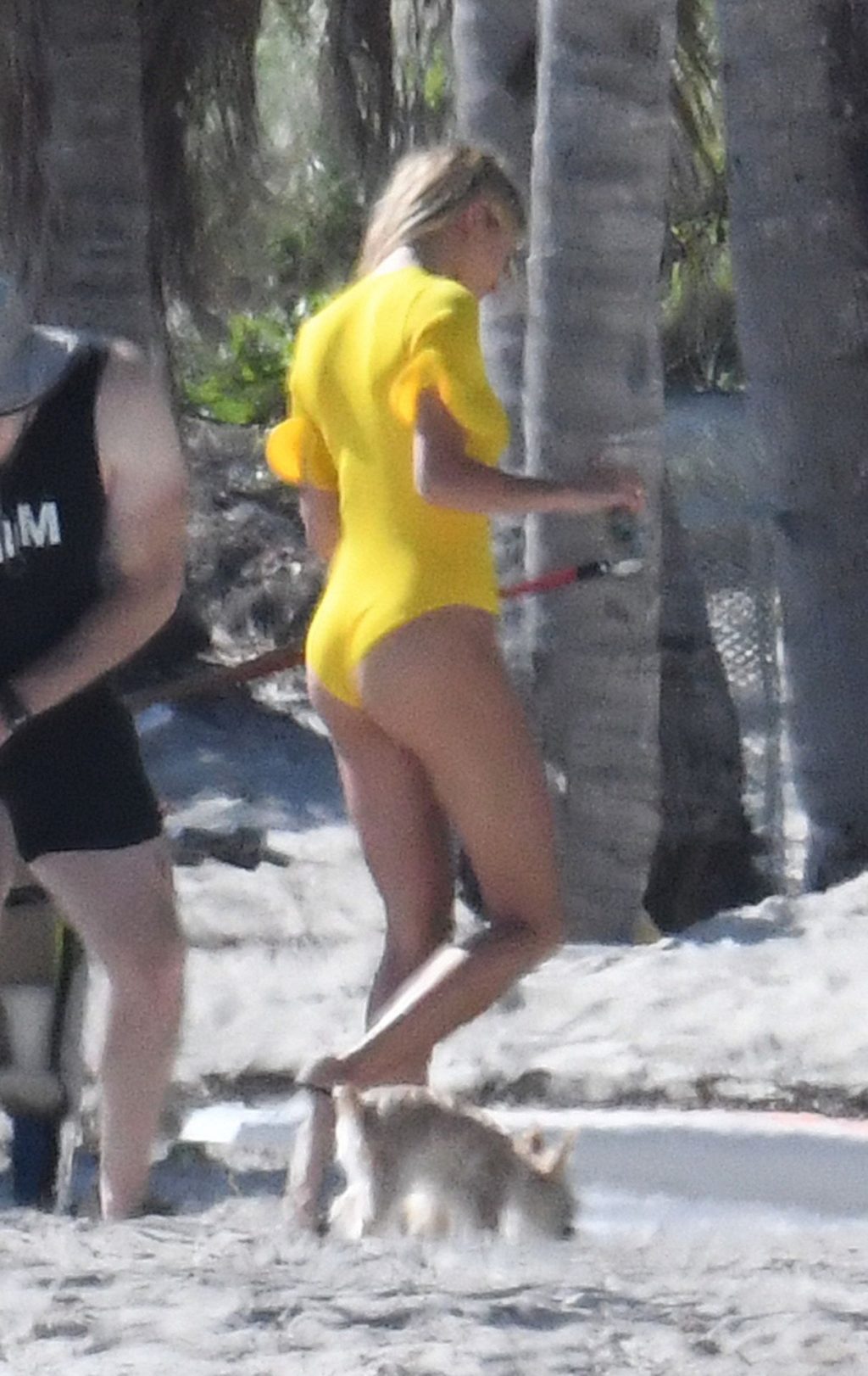 Le mannequin Hailey Bieber porte un maillot de bain bleu, rouge et jaune alors qu’elle pose lors d’une séance photo sur la plage de Miami, le 27/11/2019.