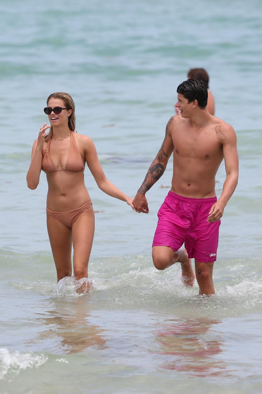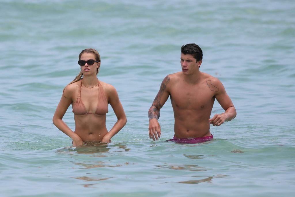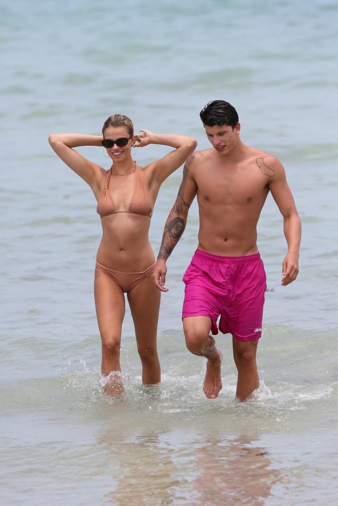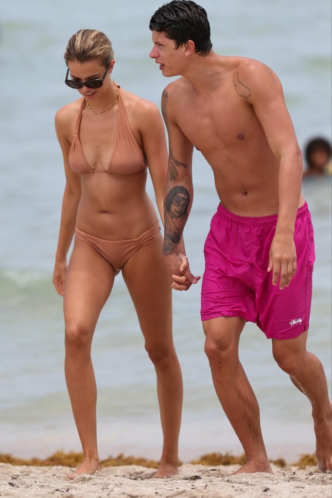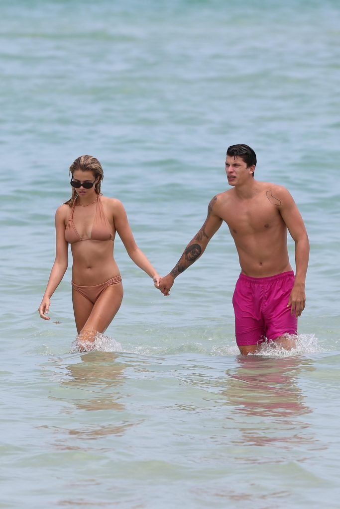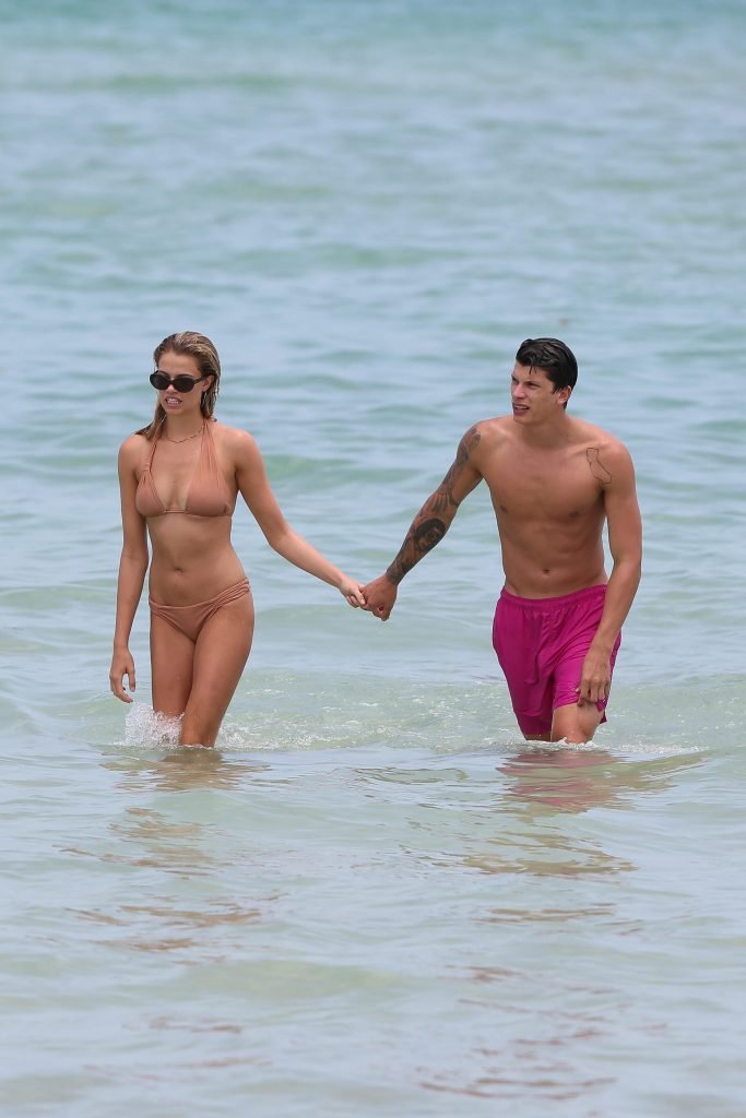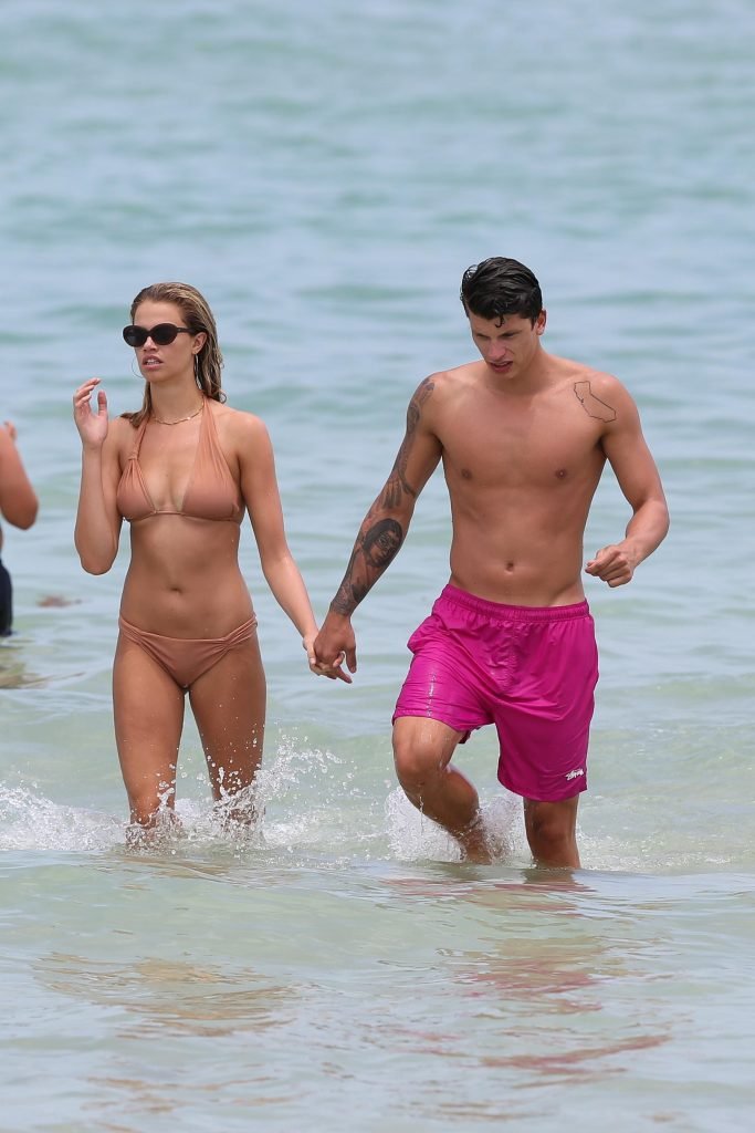 Le mannequin Hailey Clauson et son petit ami Jullien Herrera profitent d’une journée romantique à la plage à Miami Beach, Floride, le 22/07/2017.
