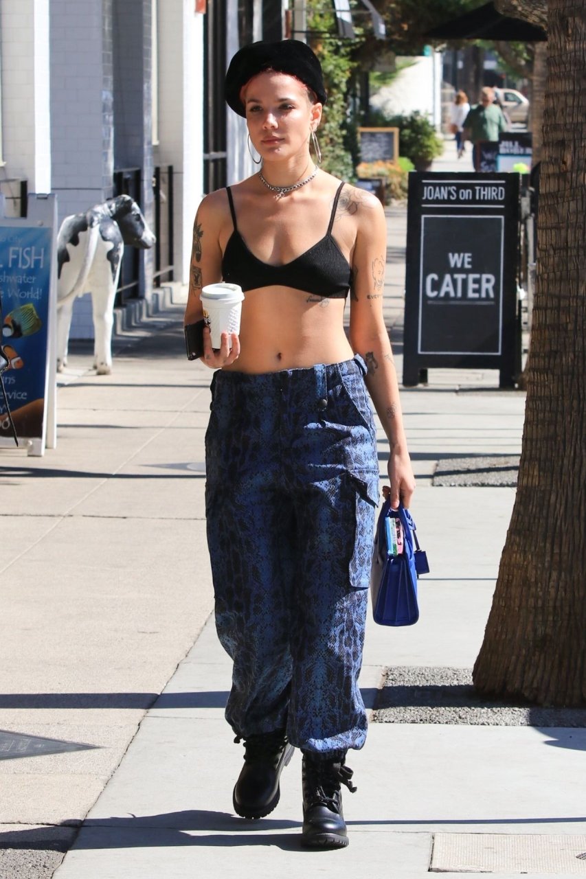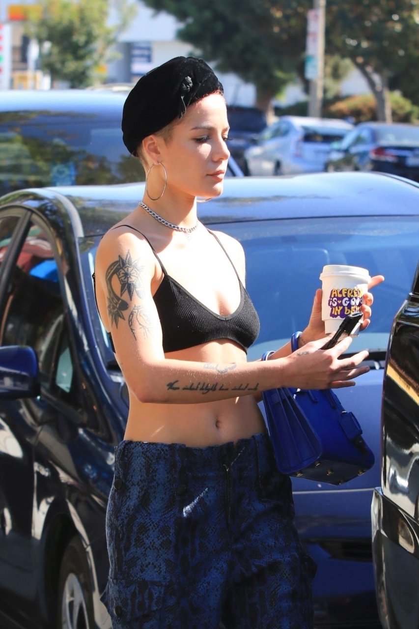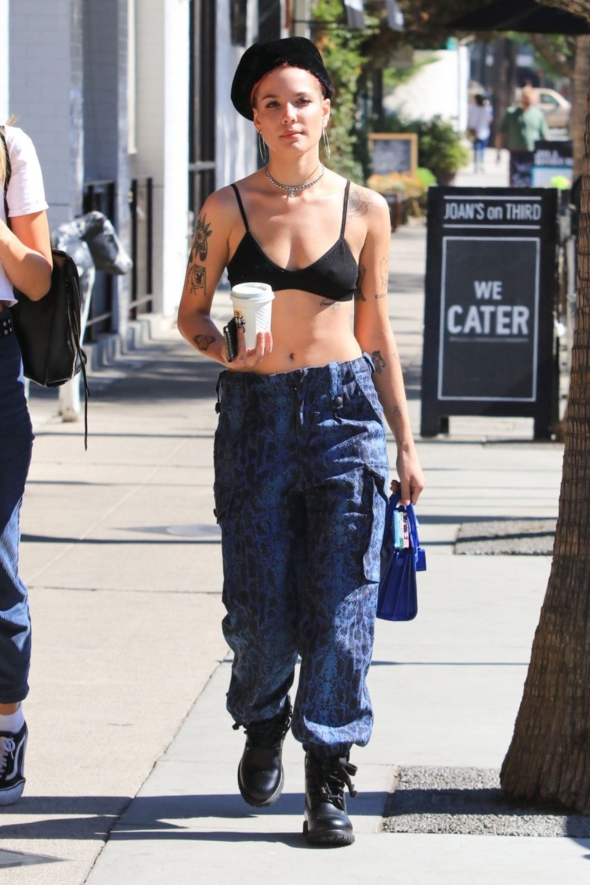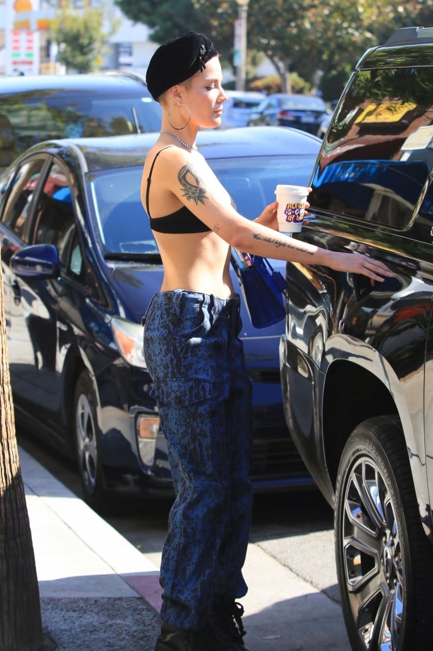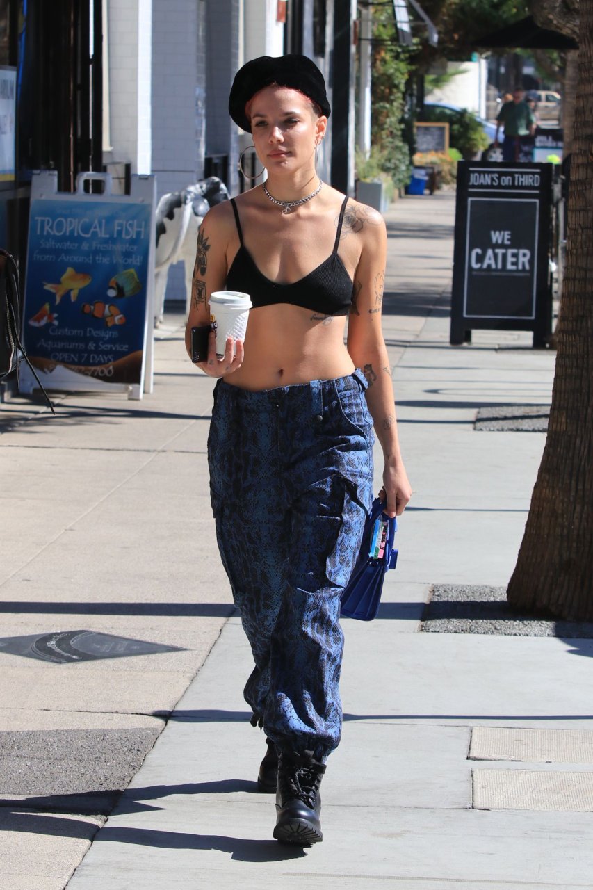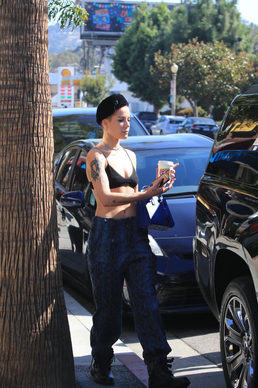 Halsey sourit alors qu’elle porte seulement un soutien-gorge noir et un pantalon en peau de serpent tout en prenant un café l’après-midi au milieu des rumeurs selon lesquelles elle se serait de nouveau séparée du rappeur G-Eazy, mais la chanteuse a souri en quittant Joans on Third. Los Angeles, Californie, 24/12/2018.