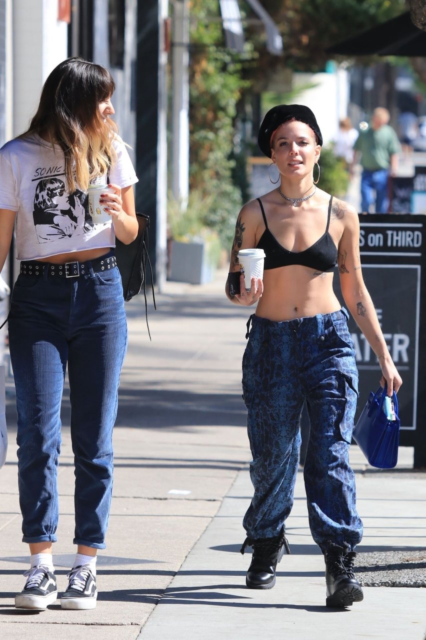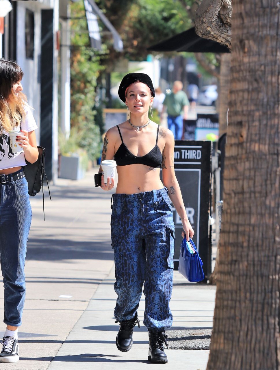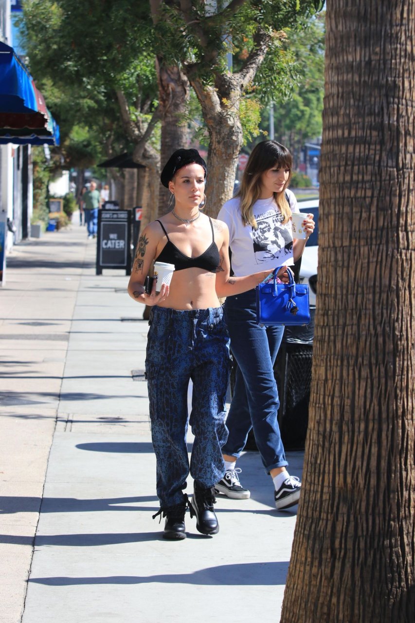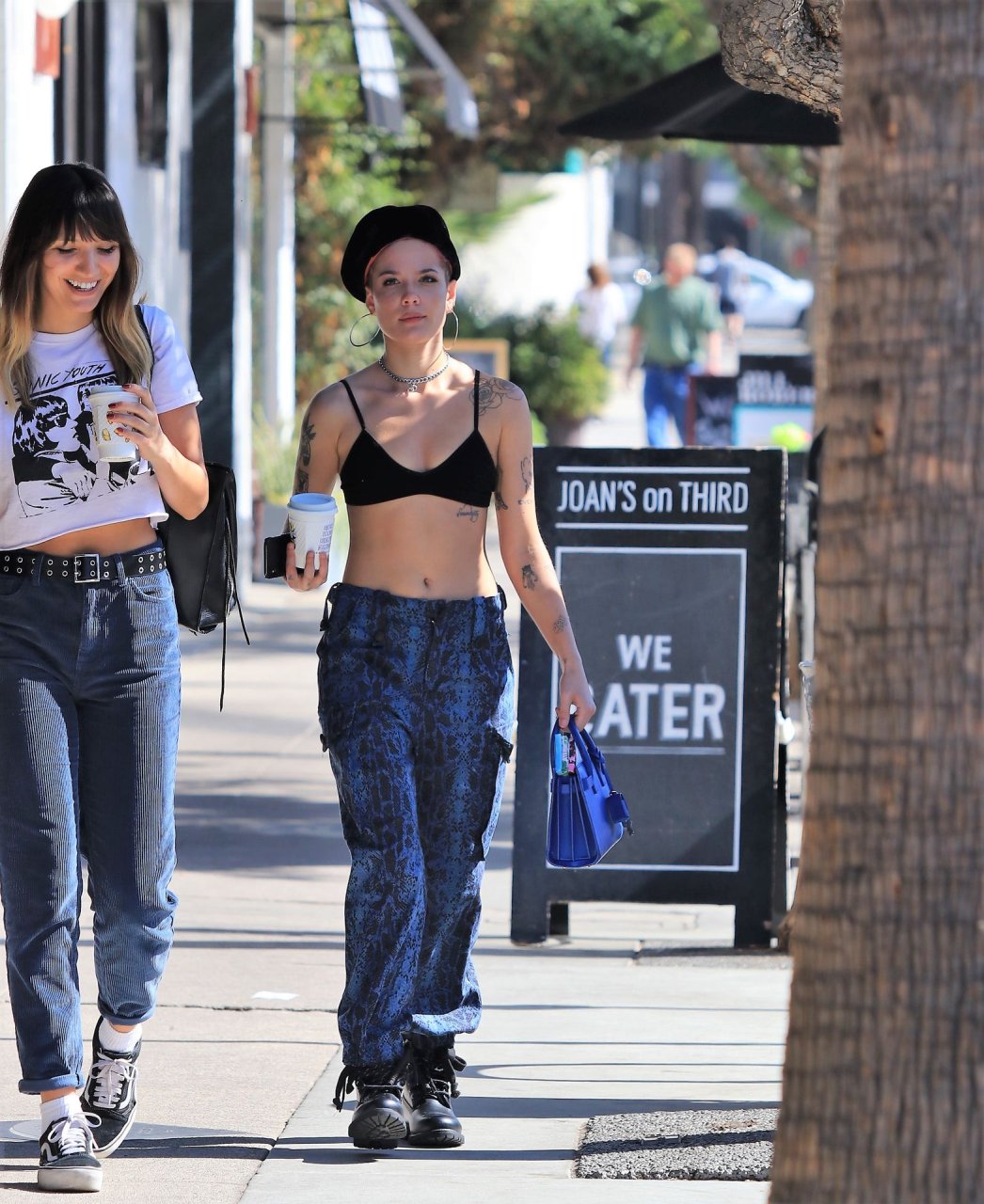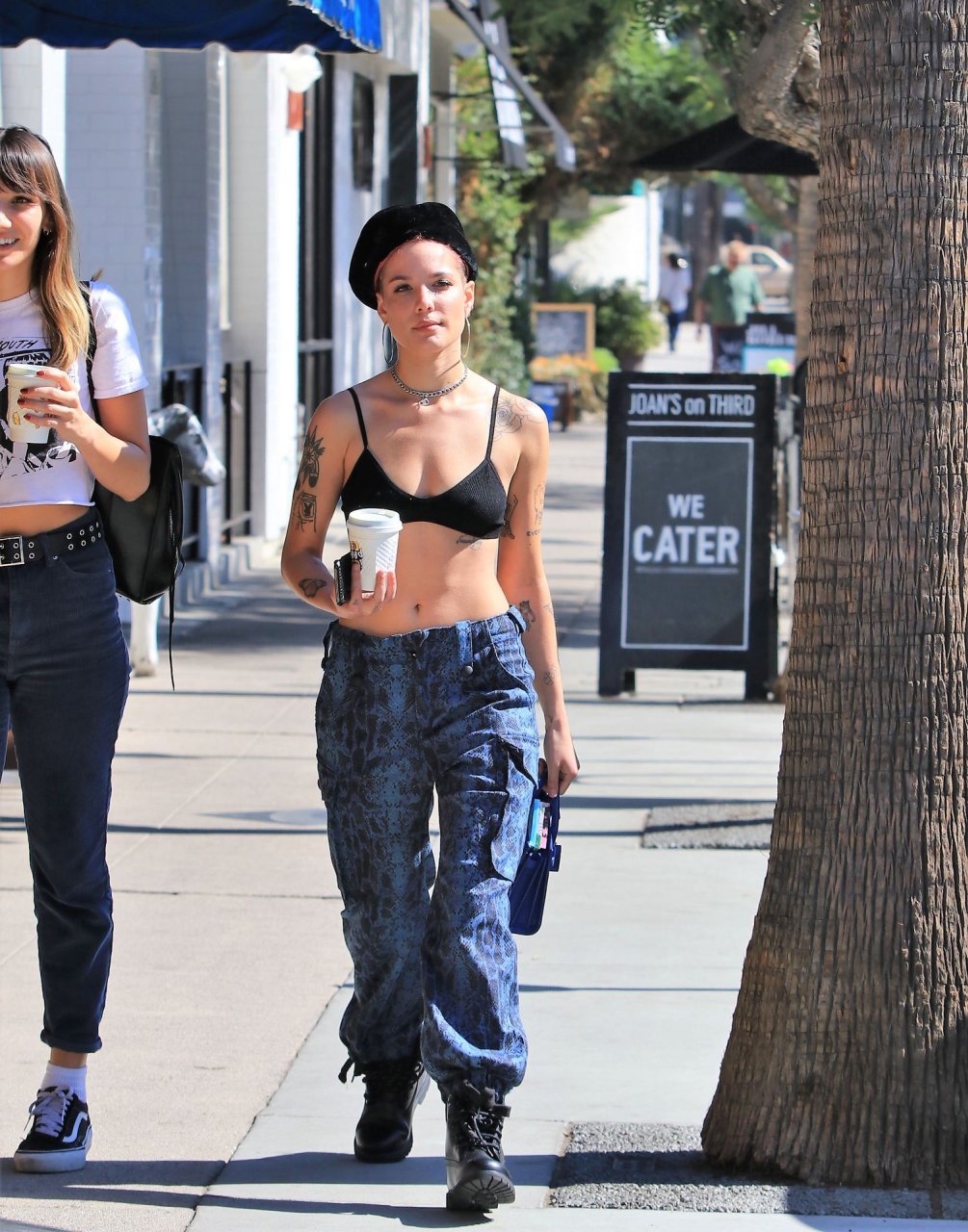 Halsey sourit alors qu’elle porte seulement un soutien-gorge noir et un pantalon en peau de serpent tout en prenant un café l’après-midi au milieu des rumeurs selon lesquelles elle se serait de nouveau séparée du rappeur G-Eazy, mais la chanteuse a souri en quittant Joans on Third. Los Angeles, Californie, 24/12/2018.