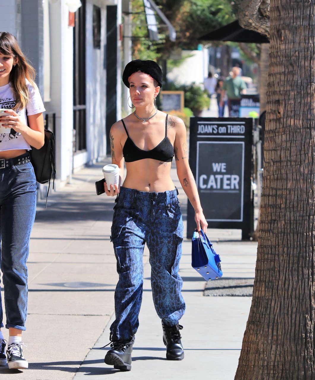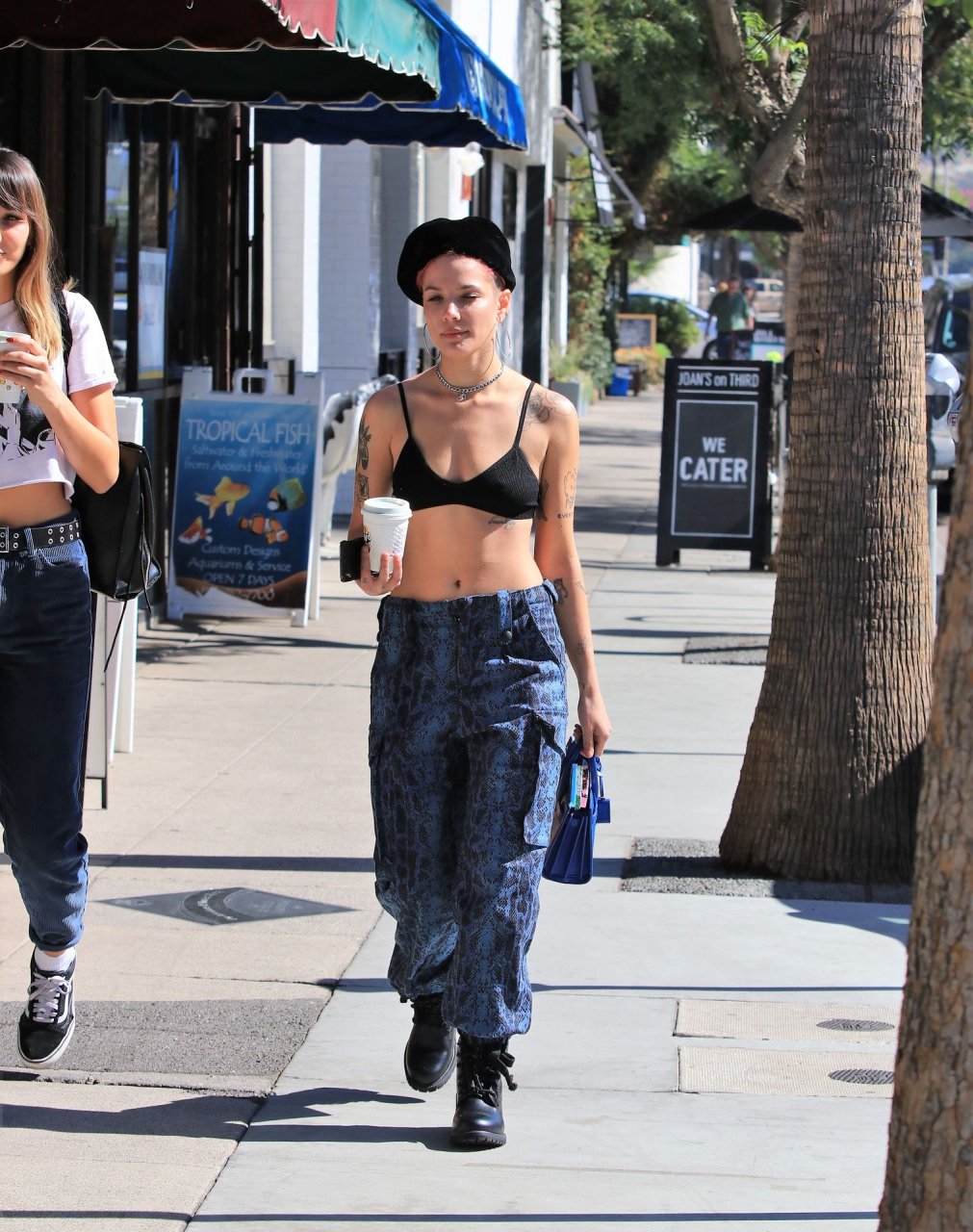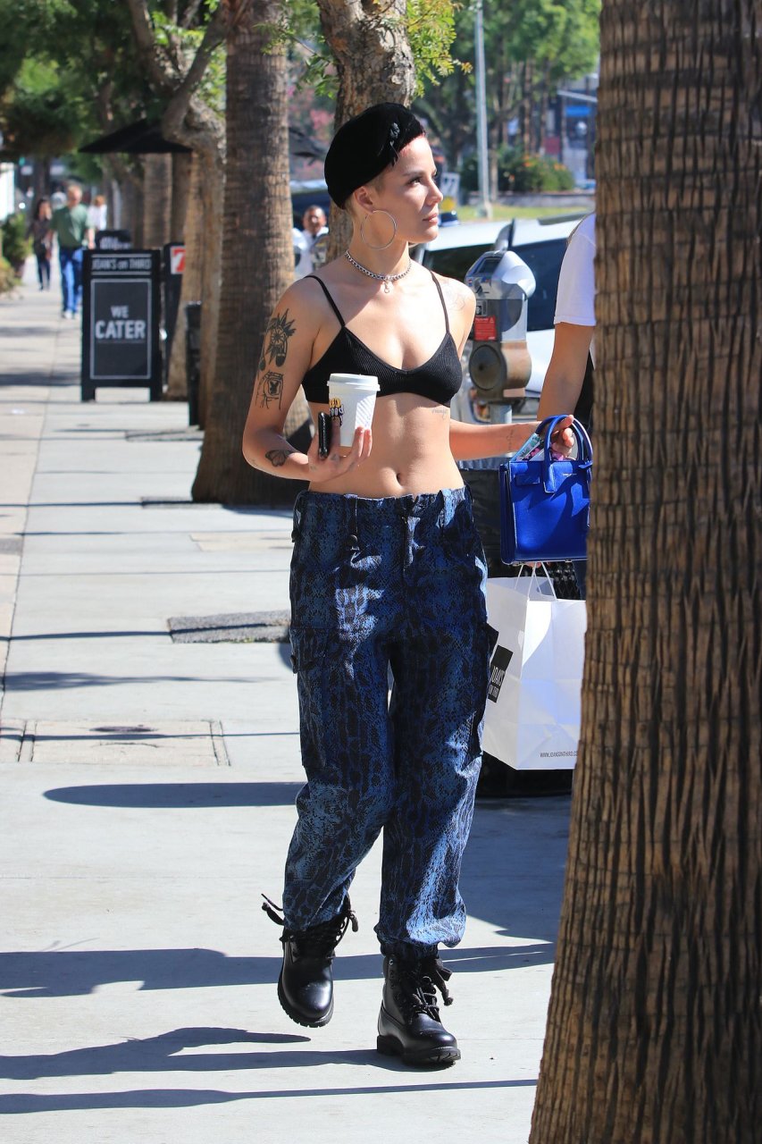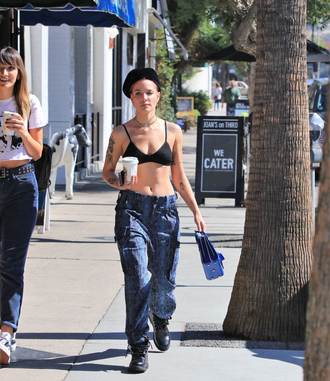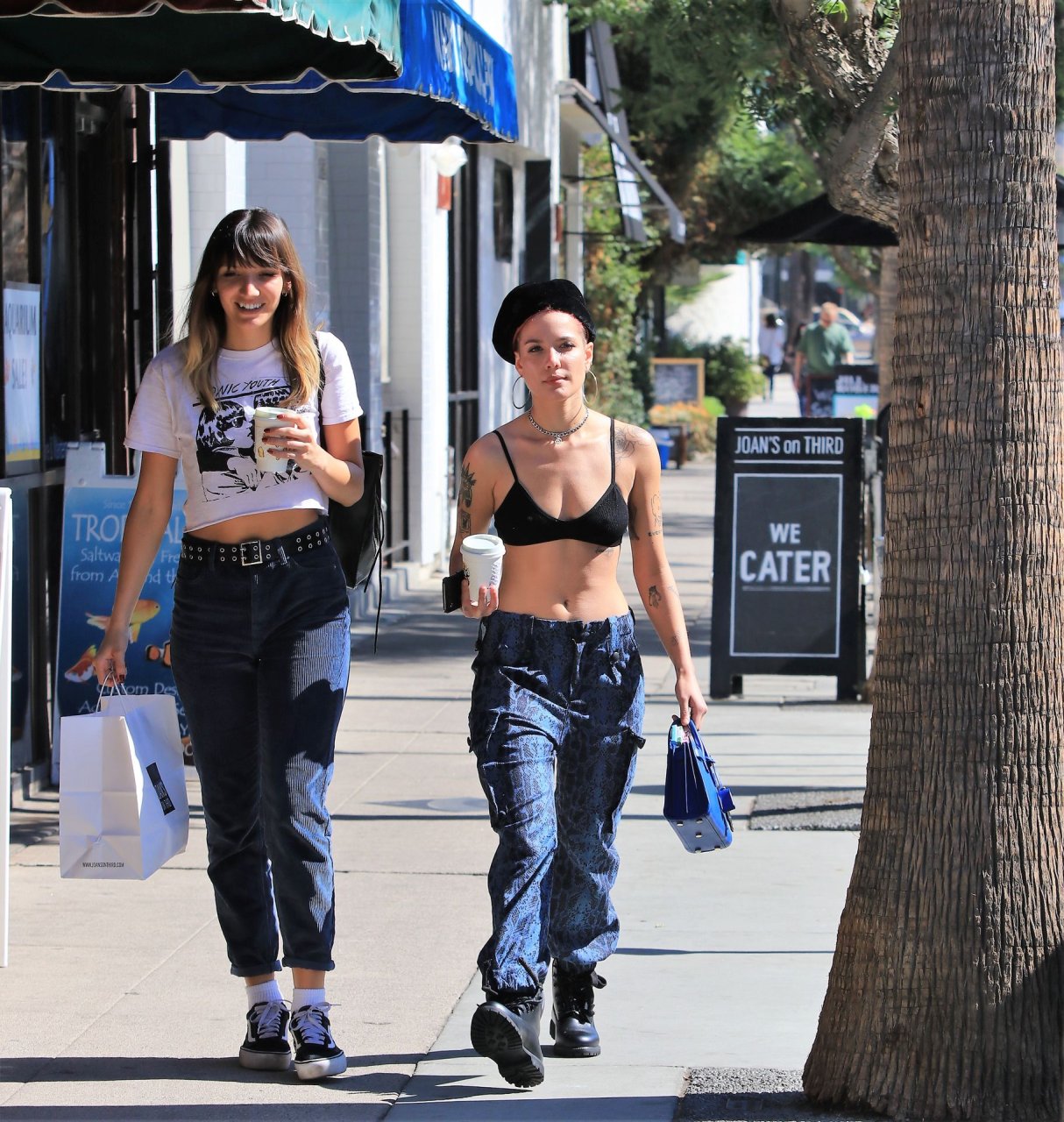 Halsey sourit alors qu’elle porte seulement un soutien-gorge noir et un pantalon en peau de serpent tout en prenant un café l’après-midi au milieu des rumeurs selon lesquelles elle se serait de nouveau séparée du rappeur G-Eazy, mais la chanteuse a souri en quittant Joans on Third. Los Angeles, Californie, 24/12/2018.