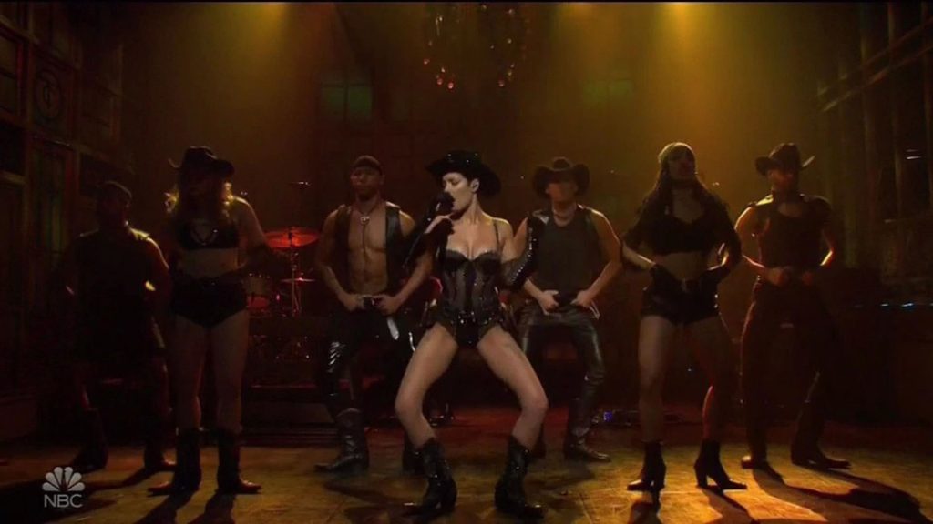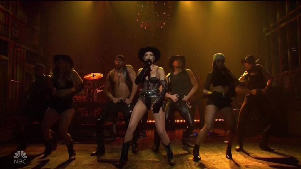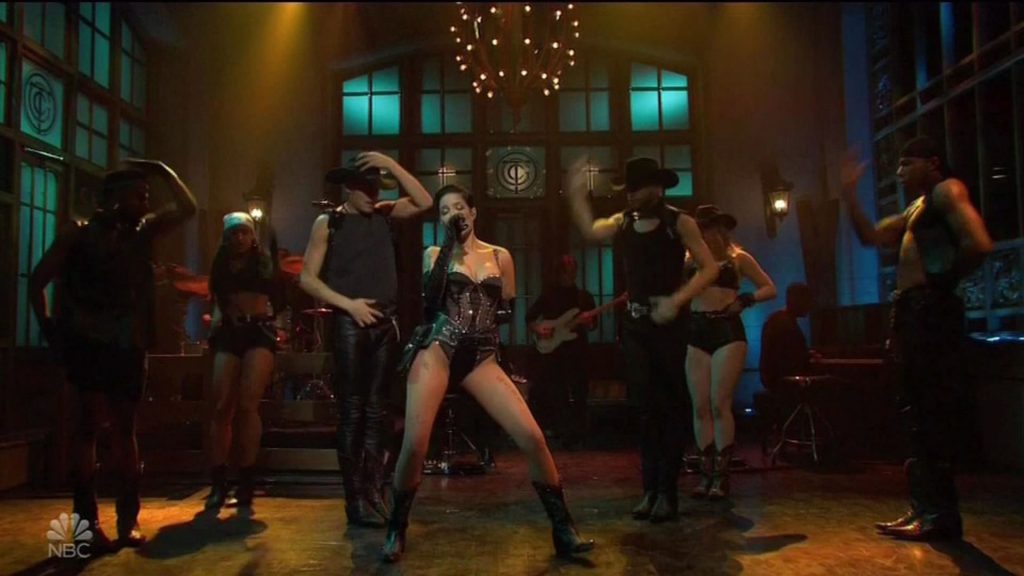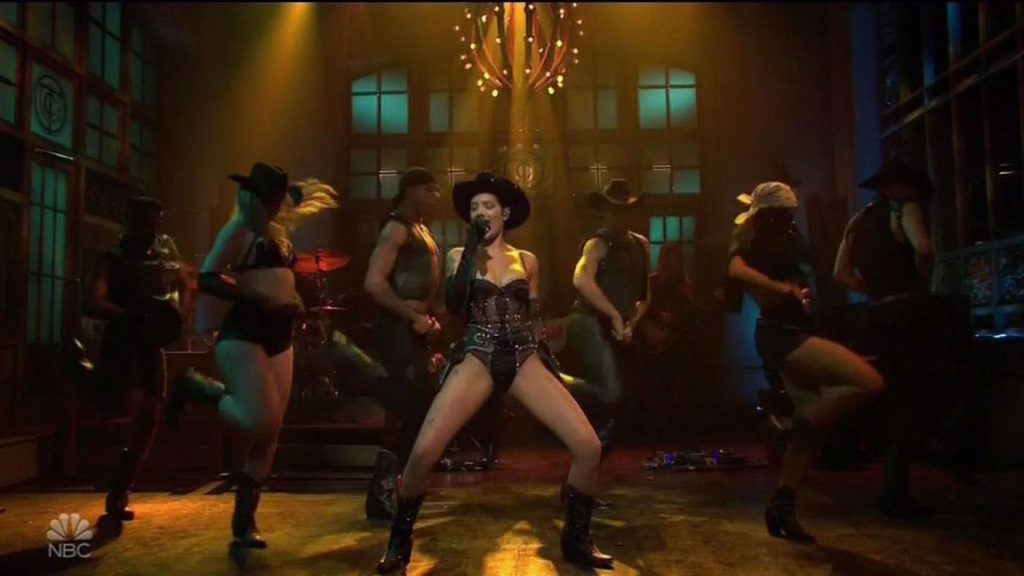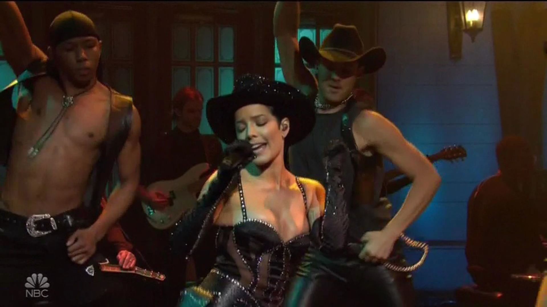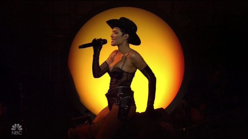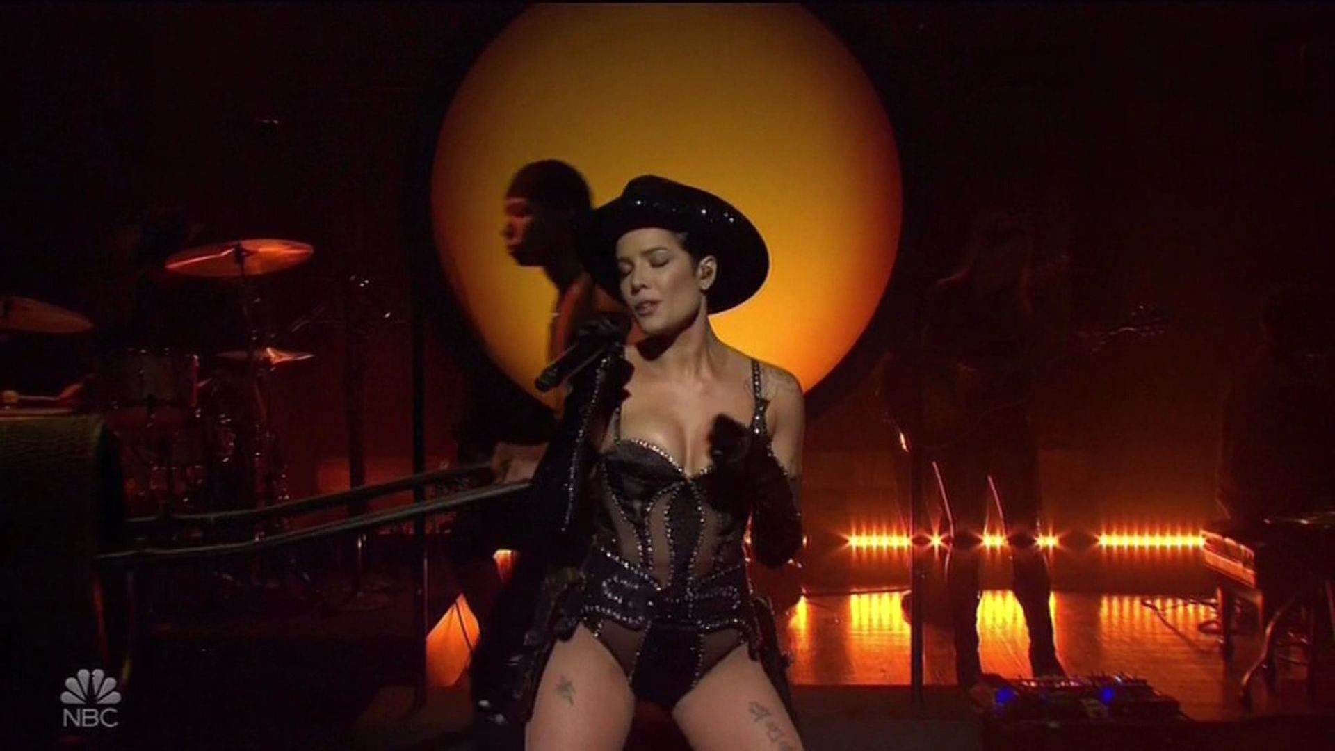 Halsey a fait son retour triomphal à SNL avec deux performances captivantes de nouveaux singles tirés de son album récemment sorti, Manic. La chanteuse de 25 ans est d’abord montée sur scène pour interpréter la chanson You Should Be Sad. Habillée d’un body noir orné de strass avec des bas résille et des gants, Halsey, qui a ouvert la performance en chevauchant un taureau mécanique avec un chapeau de cowboy couvert de strass et des bottes de cowboy assorties, a chauffé sa première prestation de la soirée avec une interprétation sexy de la chanson.