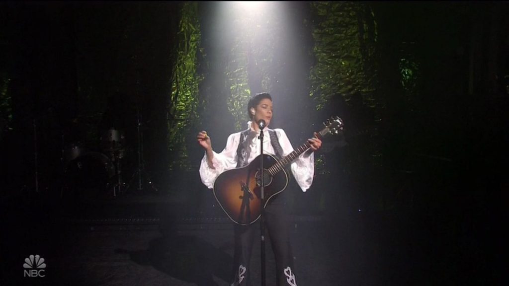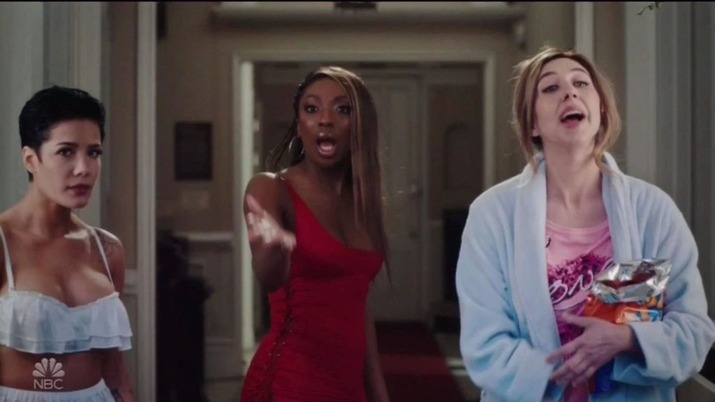Halsey est ensuite revenue sur scène pour ralentir le rythme avec une performance épurée de Finally et Beautiful Stranger. Chic dans une chemise bohème blanche à manches longues et volantées et un pantalon large, avec une guitare acoustique à la main, Halsey a montré son vrai talent en se tenant au centre de la scène sous un unique projecteur. Halsey est également apparue dans le court-métrage numérique Slow, aux côtés de l’animateur de SNL Adam Driver. Dans le sketch musical Take It Slow, la chanteuse britannique était vue en lingerie blanche sexy tandis que l’animateur Driver, accompagné des réguliers de SNL Kenan Thompson et Chris Redd, chantait à leurs femmes à propos de prendre les choses lentement dans la chambre – comme « à peine bouger » lentement ou « dans la voie 65 à 2 ».