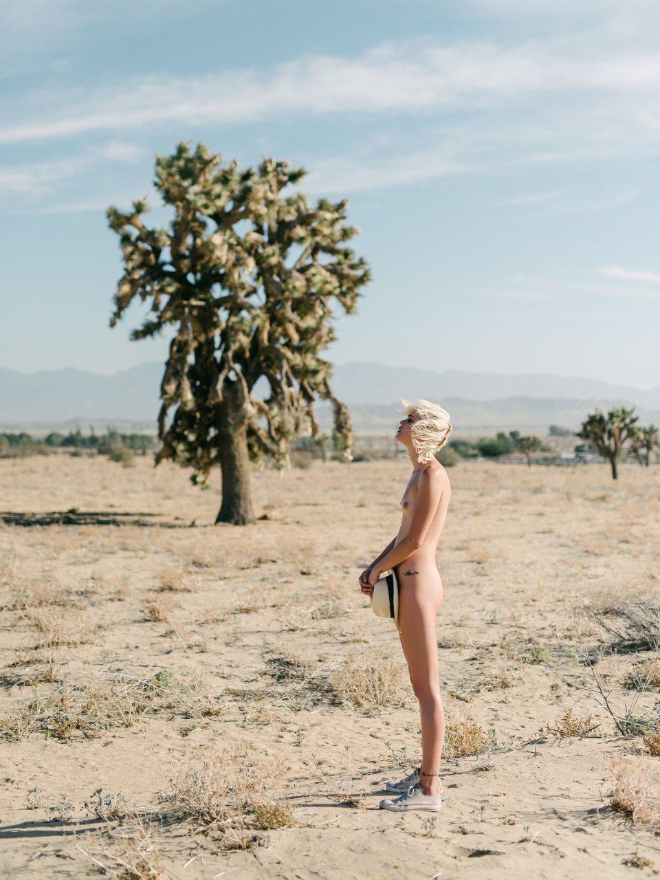 La blonde mince a montré ses petits seins et son minuscule derrière en plein air. La belle modèle australienne a les yeux bleus, un corps tatoué incroyable et des jambes sexy. Elle adore poser nue et semble trop jeune pour son âge.