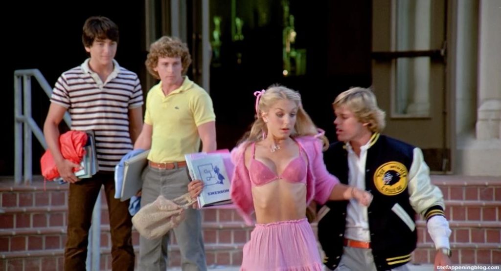 Heather Thomas is talking with some guys out in front of their school as one of the guy stares at her breasts in a fluffy pink sweater before suddenly her sweater bursts open revealing her cleavage in a pink bra as she freaks out trying to cover herself back up and then gets lead away by a third guy just as her sweater flies back open again showing her bra and cleavage once more.