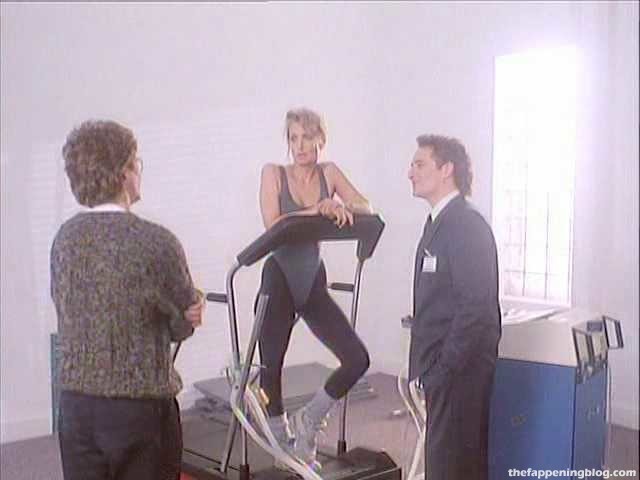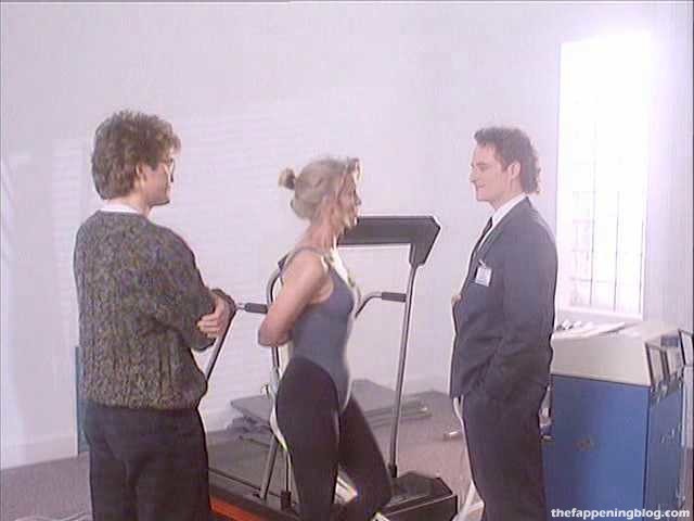 Heather Thomas is walking on a treadmill in a blue thong workout outfit and black tights giving us a close up look at her ass before she takes off her mask and then stands around talking with some guys for a bit.