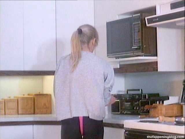 Heather Thomas is wearing black tights with a pink thong leotard and gray sweatshirt as she dances in a kitchen while cooking as a guy watches from outside before she notices him and turns off the music and lets him in to talk with him for a bit.