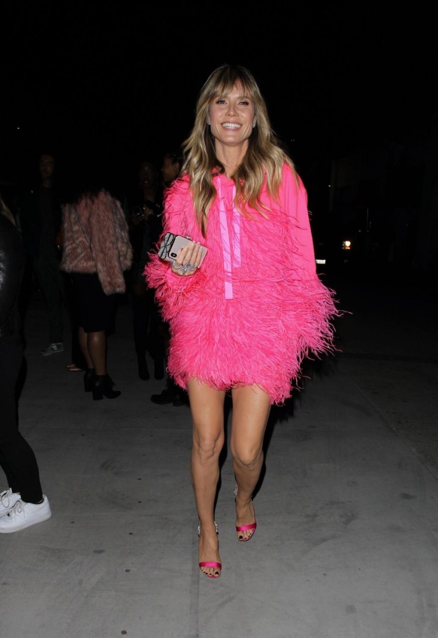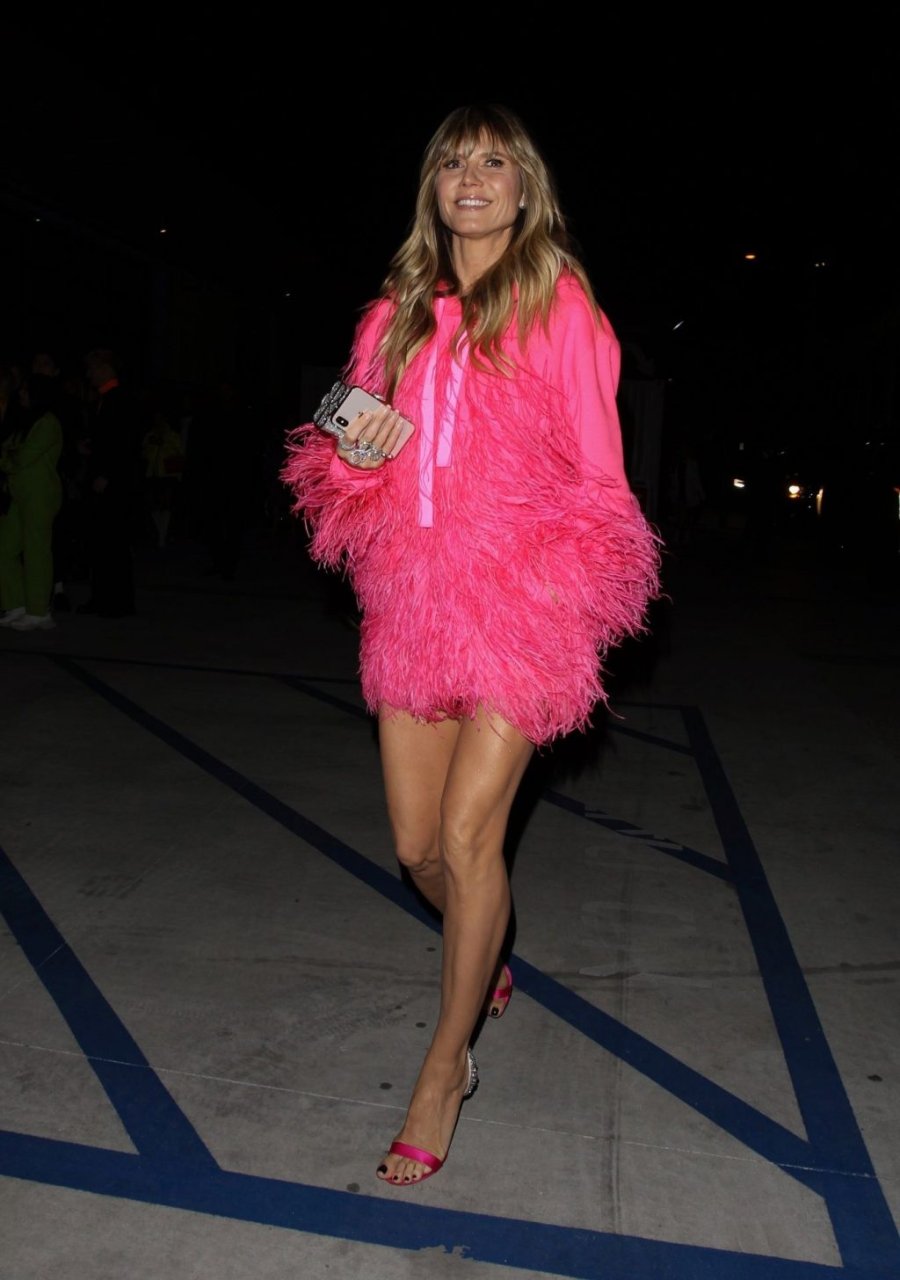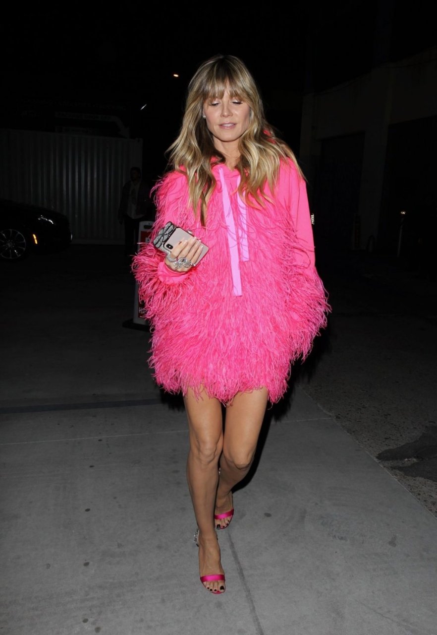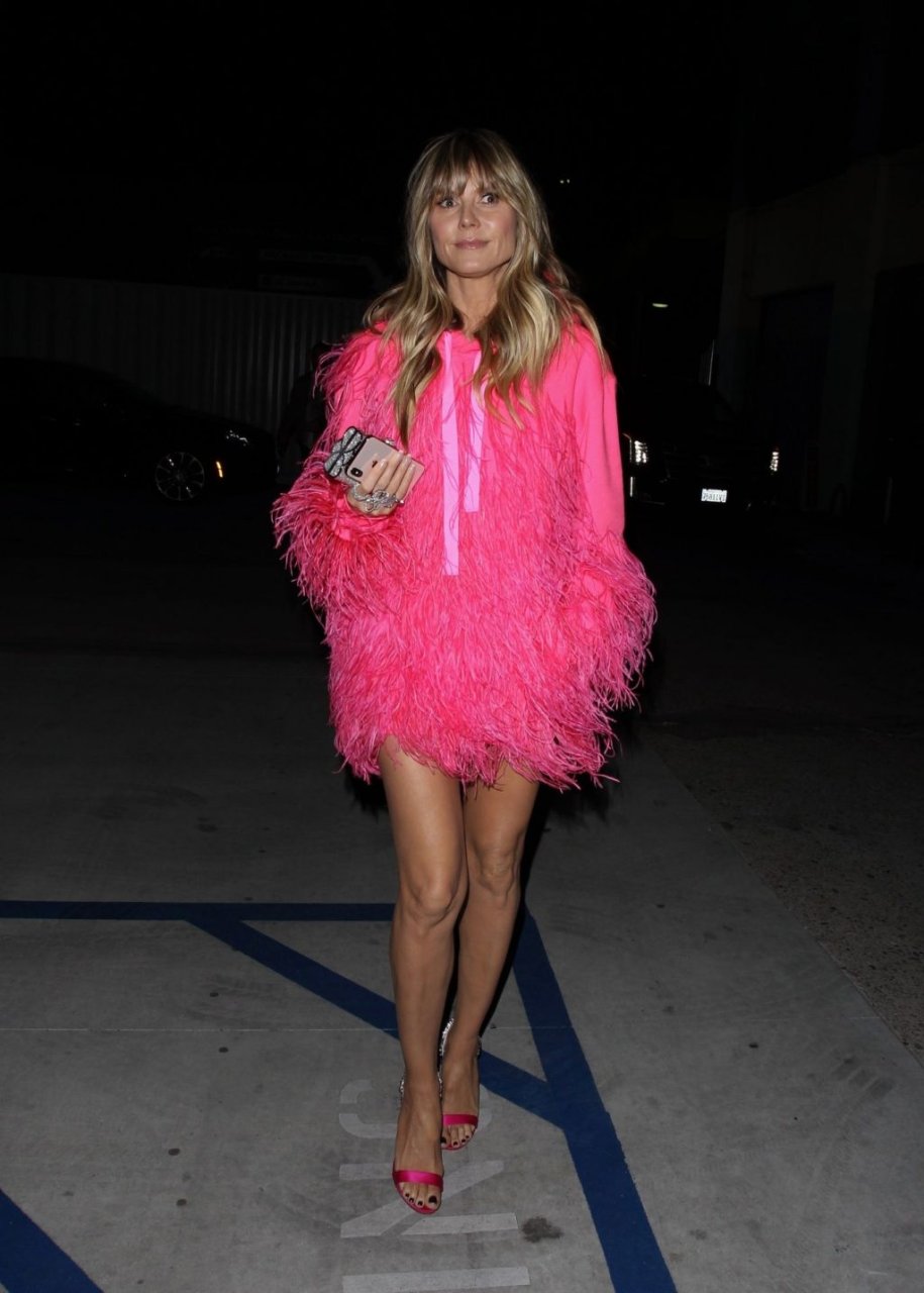 Heidi Klum a été vue quittant l’événement “Les Supers Nanas” à DTLA, jolie dans un sweat à capuche rose duveteux et des talons.