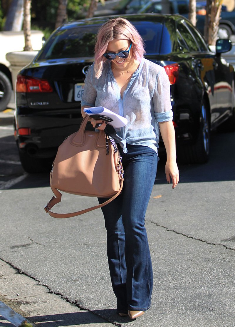 Nouvelles photos paparazzi de Hilary Duff en blouse transparente dans les rues de Beverly Hills, 21/01/16. C’est un soutien-gorge transparent :-( Hilary Duff est une actrice et chanteuse américaine. Âge : 28 ans (28 septembre 1987).