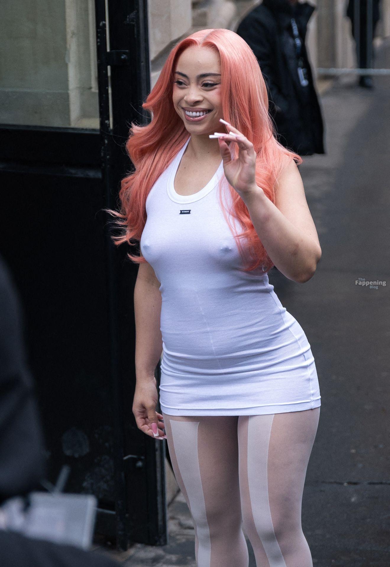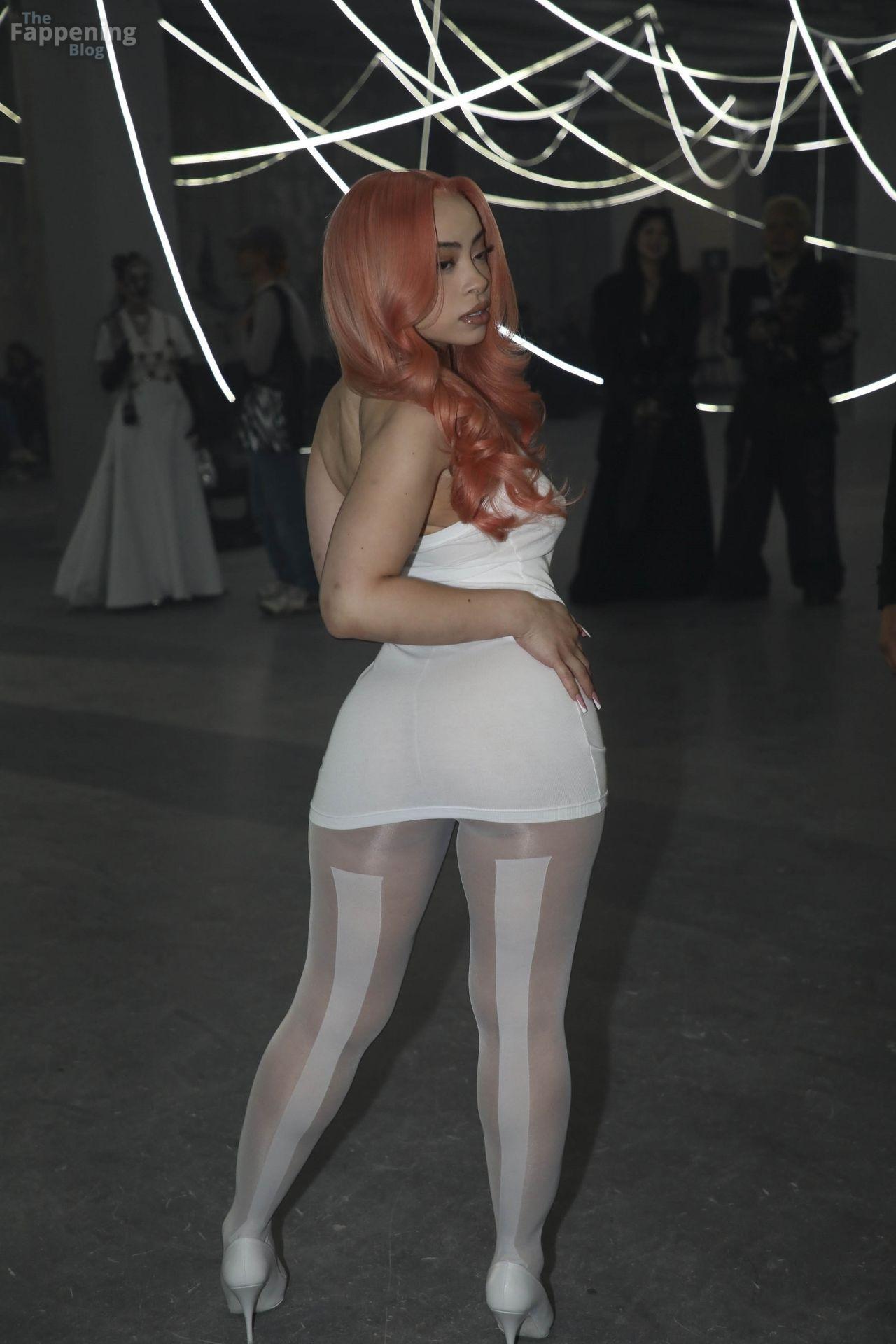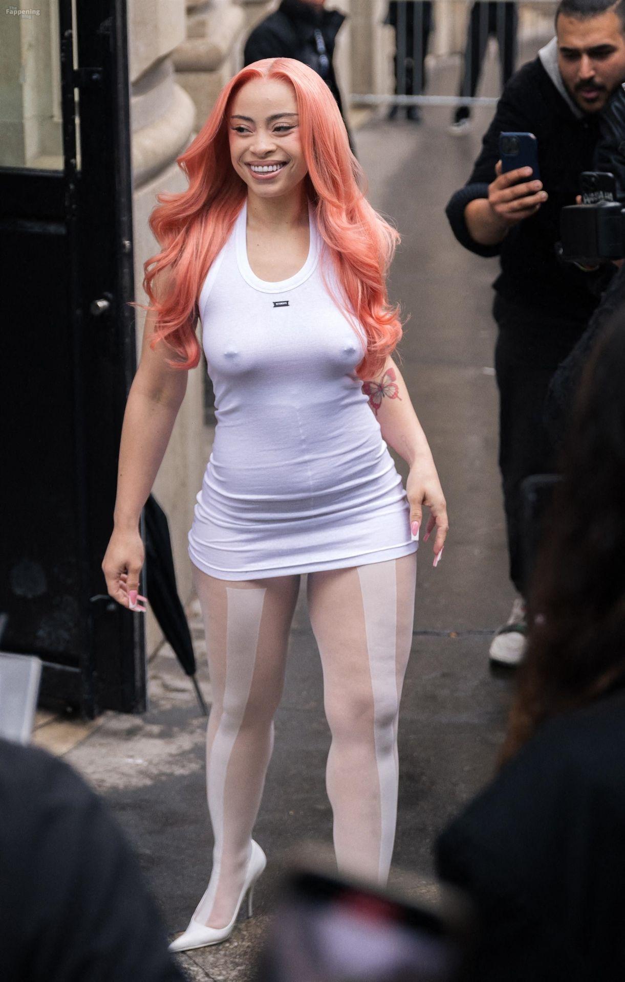 Ice Spice met en valeur ses atouts dans une mini-jupe moulante et des collants transparents lors de la Fashion Week VETEMENTS à Paris.