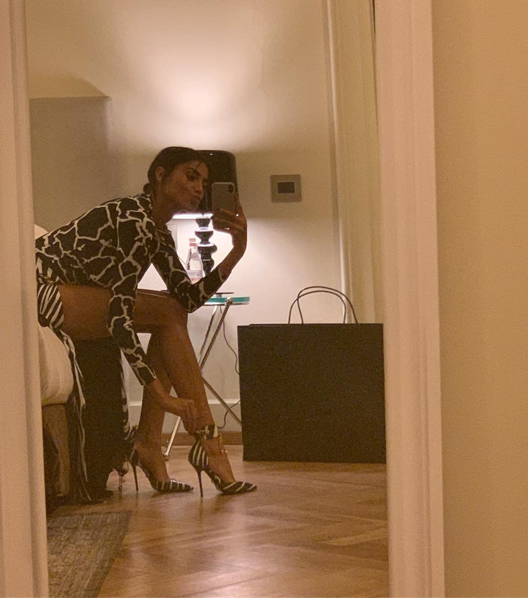 Le mannequin sans soutien-gorge Imaan Hammam assiste au dîner Versace automne 2019 pendant la Fashion Week de Milan, 22/02/2019.