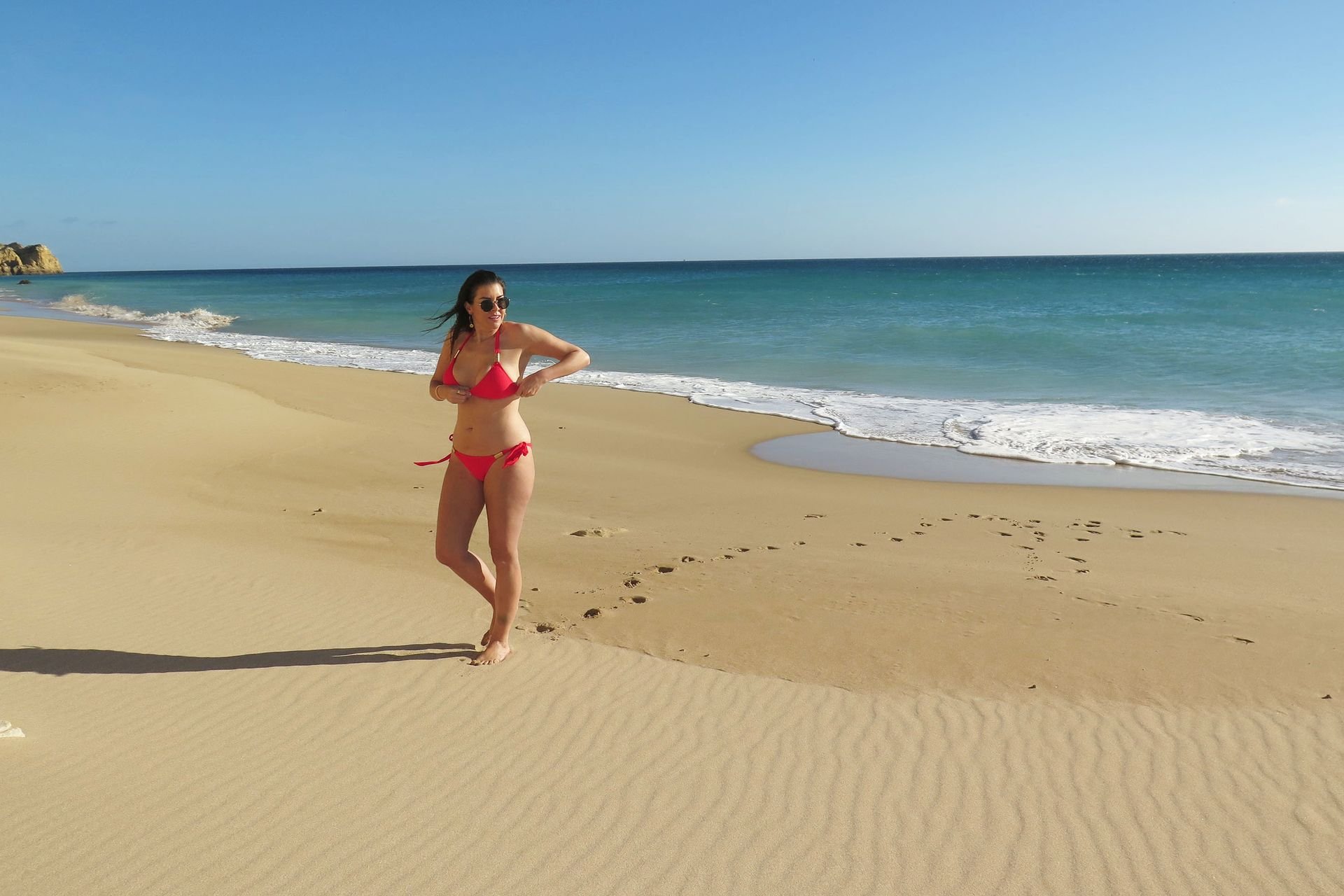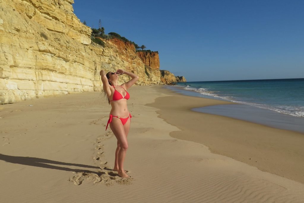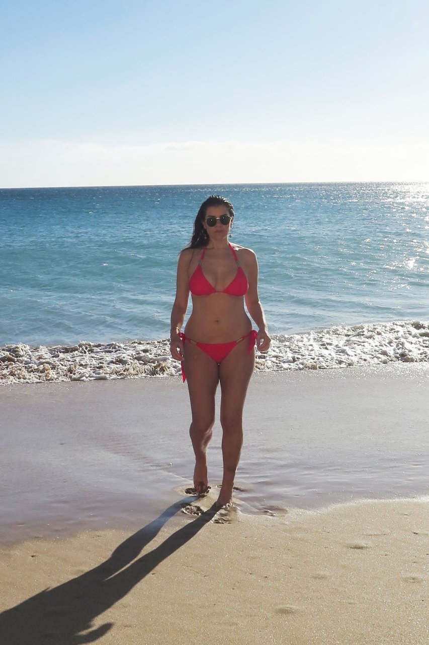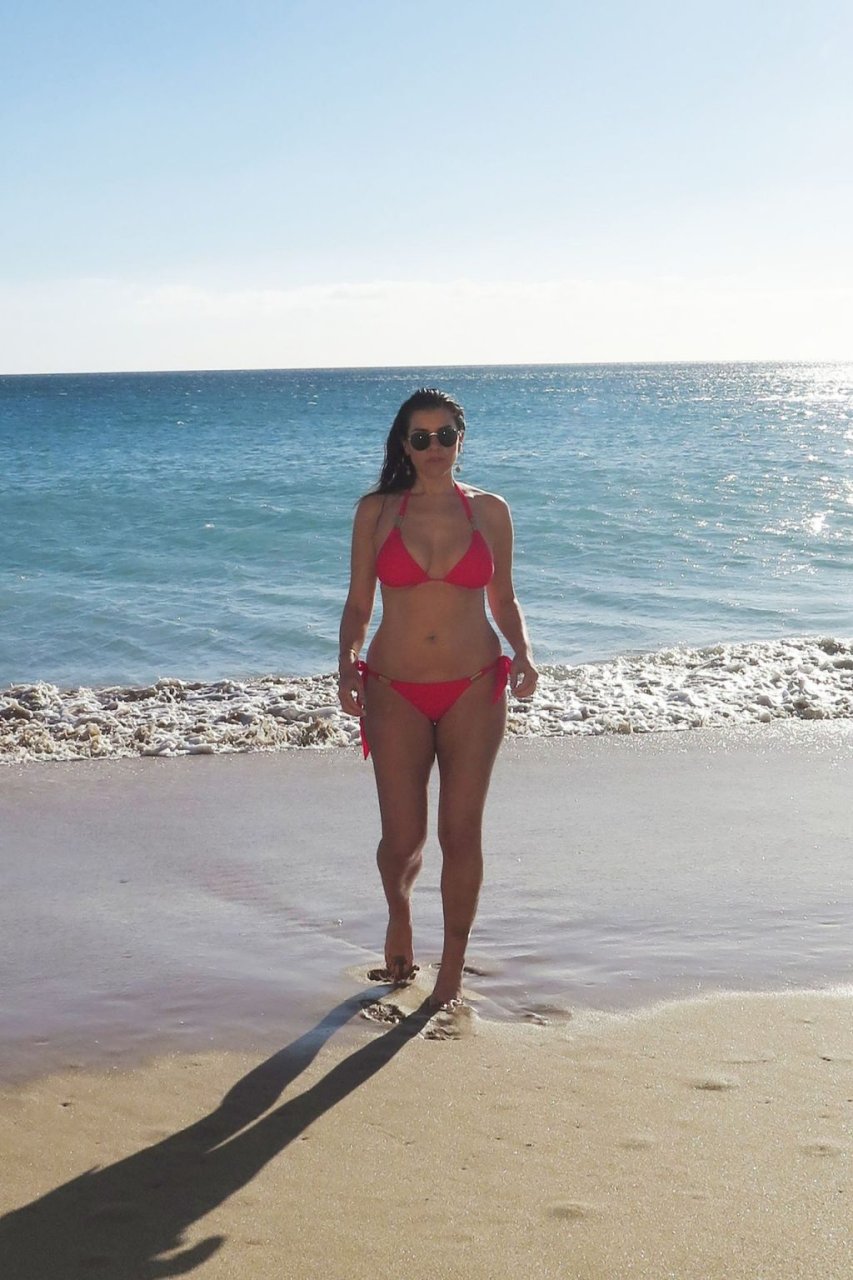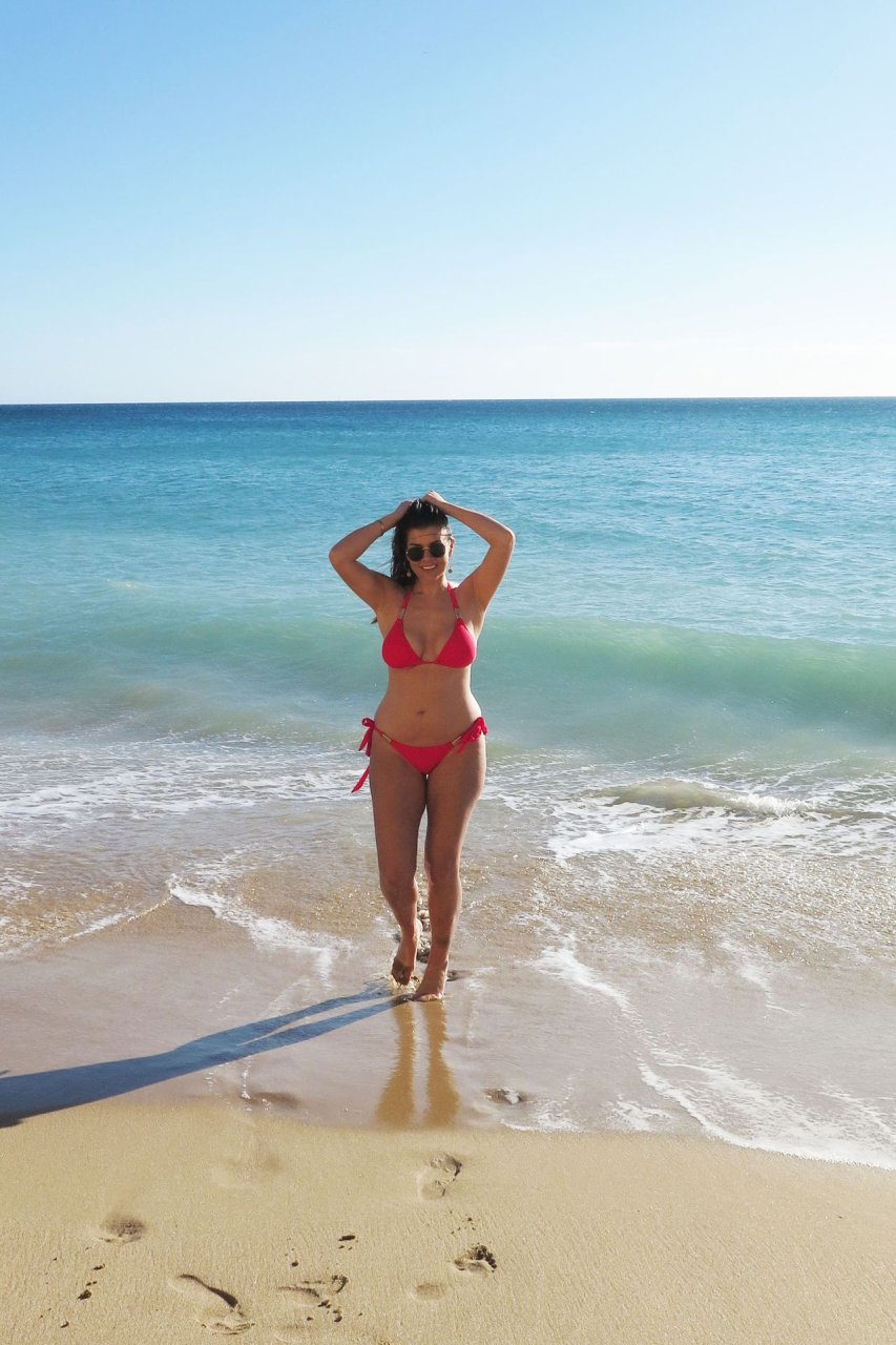 Imogen Thomas récolte les fruits de son travail en exhibant son incroyable corps en bikini dans un bikini rouge Chasing Summer après avoir participé à une semaine éprouvante de fitness et de régime au Prestige Bootcamp au Portugal, le 25/01/2019.