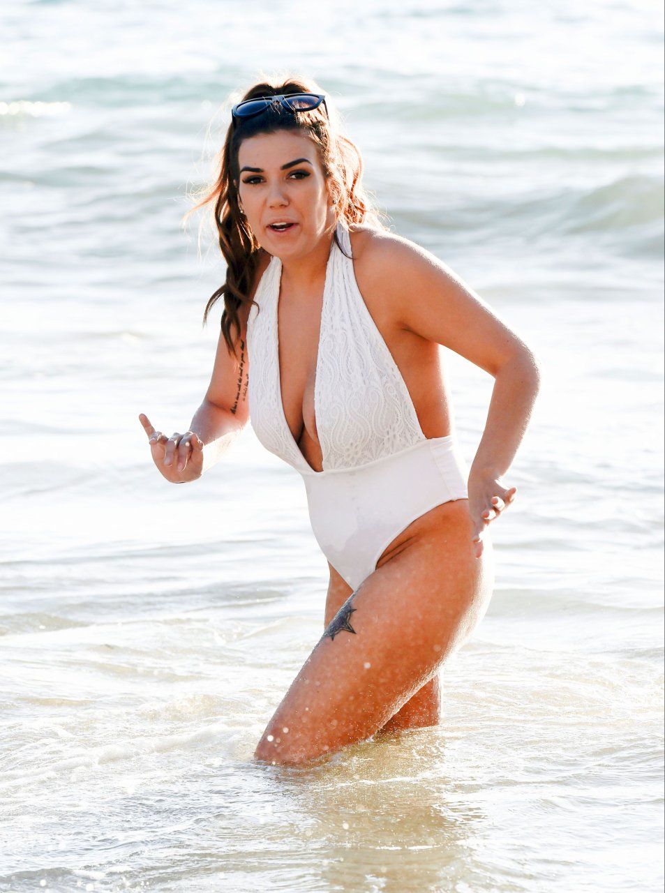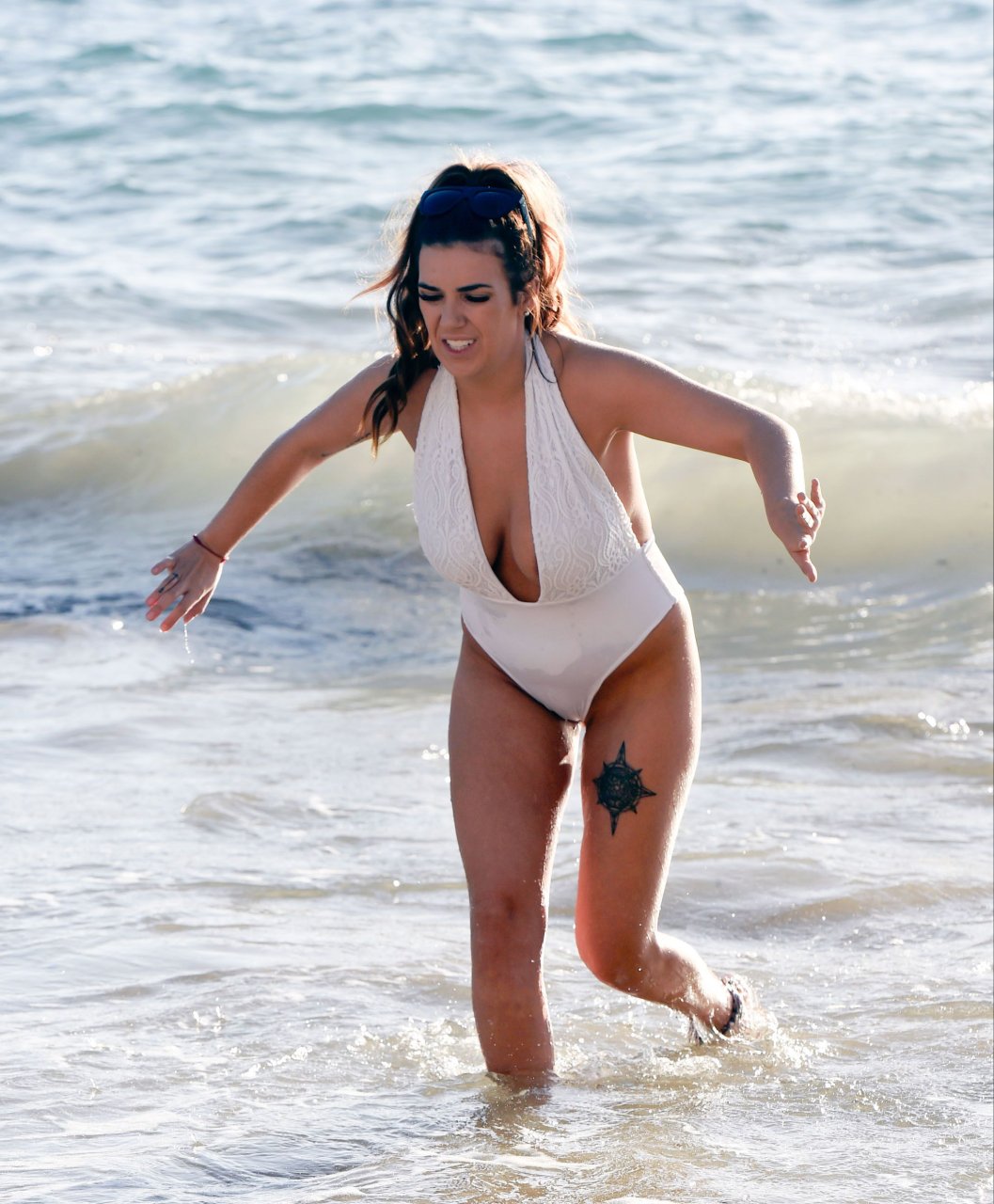 Imogen Townley porte un maillot de bain blanc et montre un parfait sideboob en vacances sur la plage en Espagne, 13/01/2017. Imogen Townley est une star britannique de la télé-réalité. Âge : 24 ans (19 mars 1992).