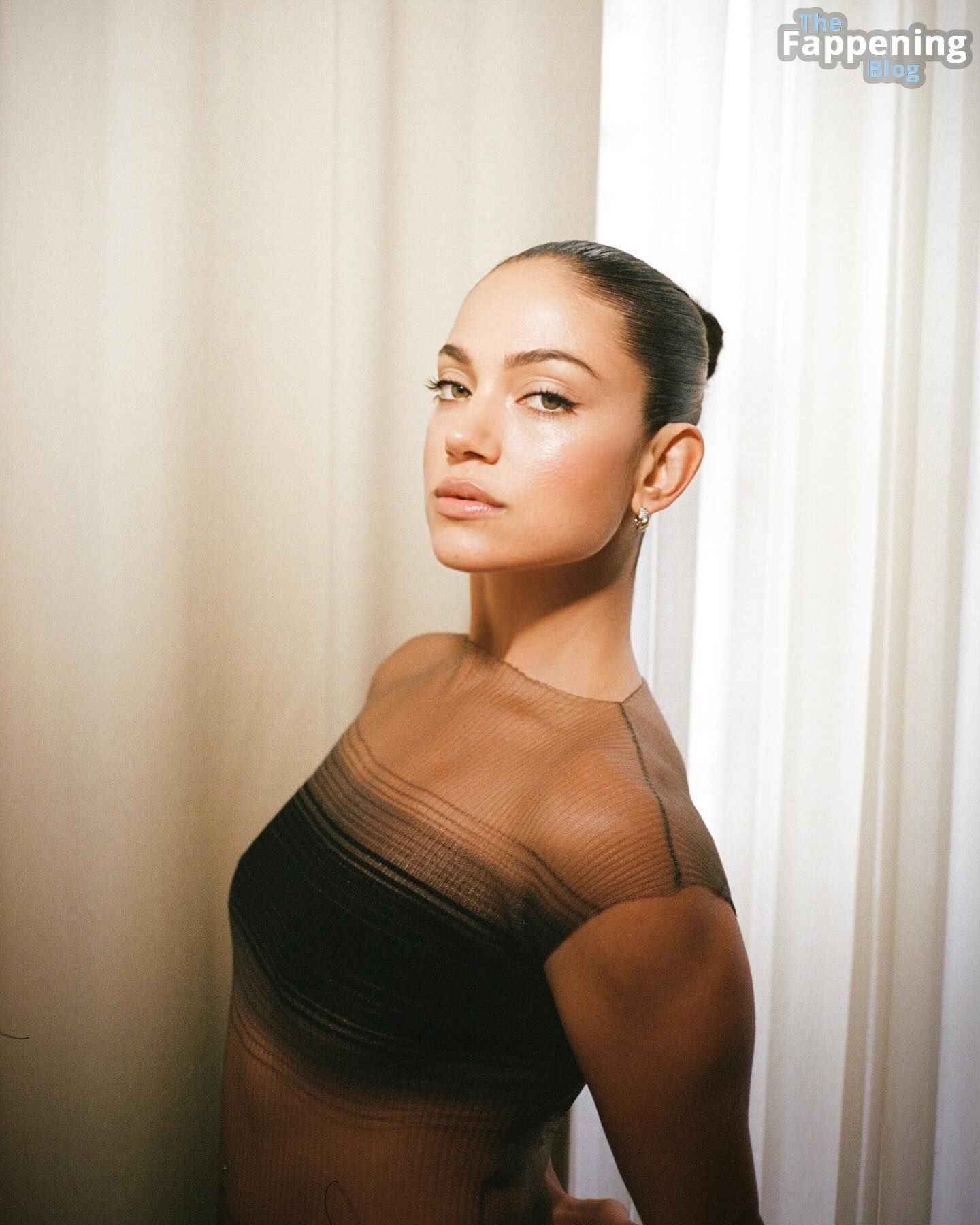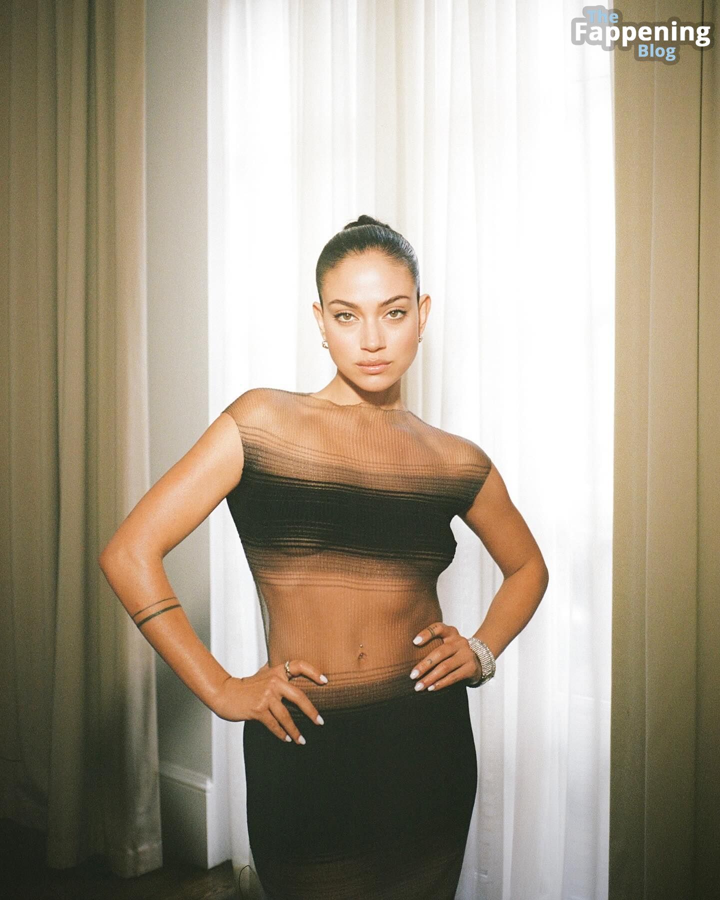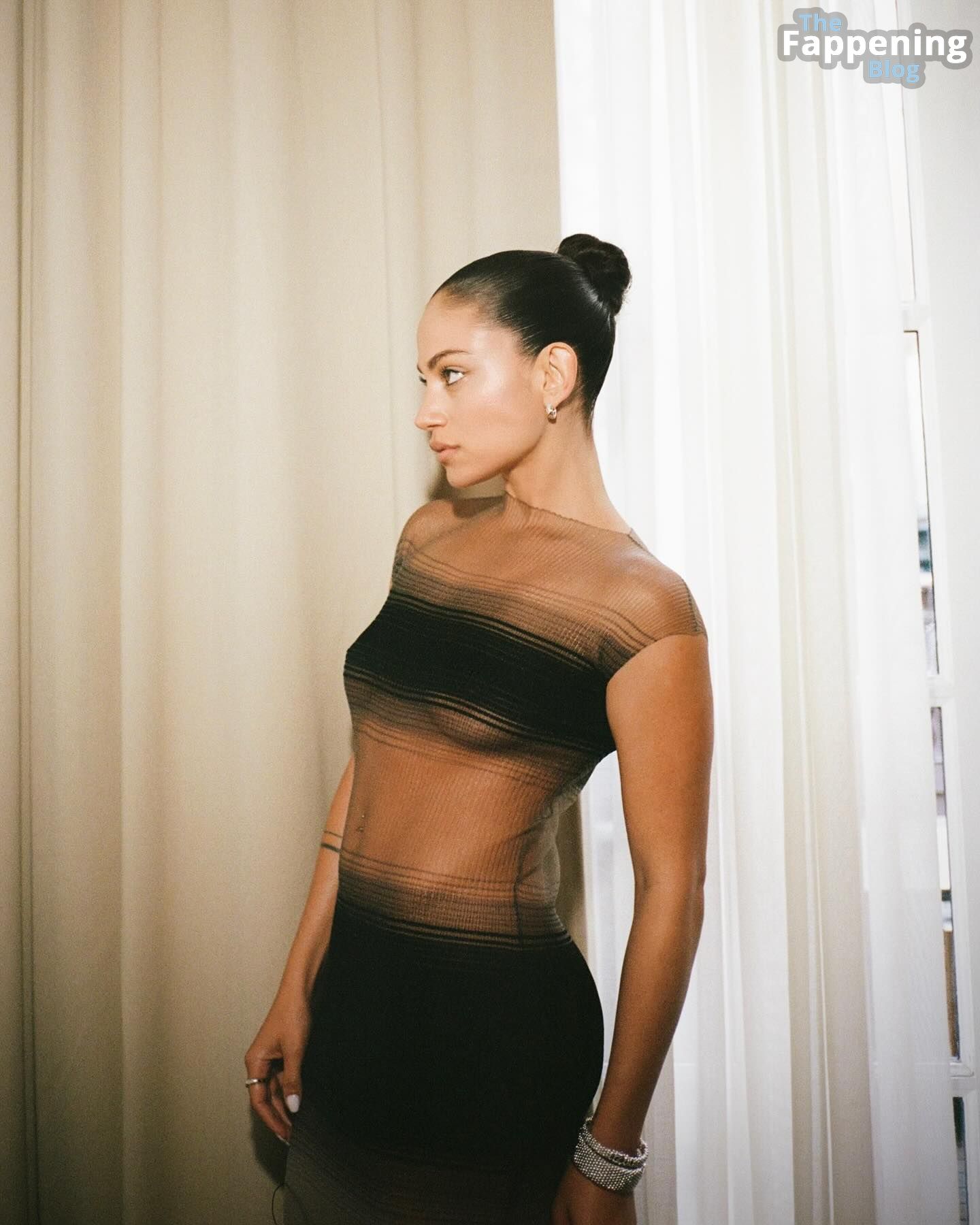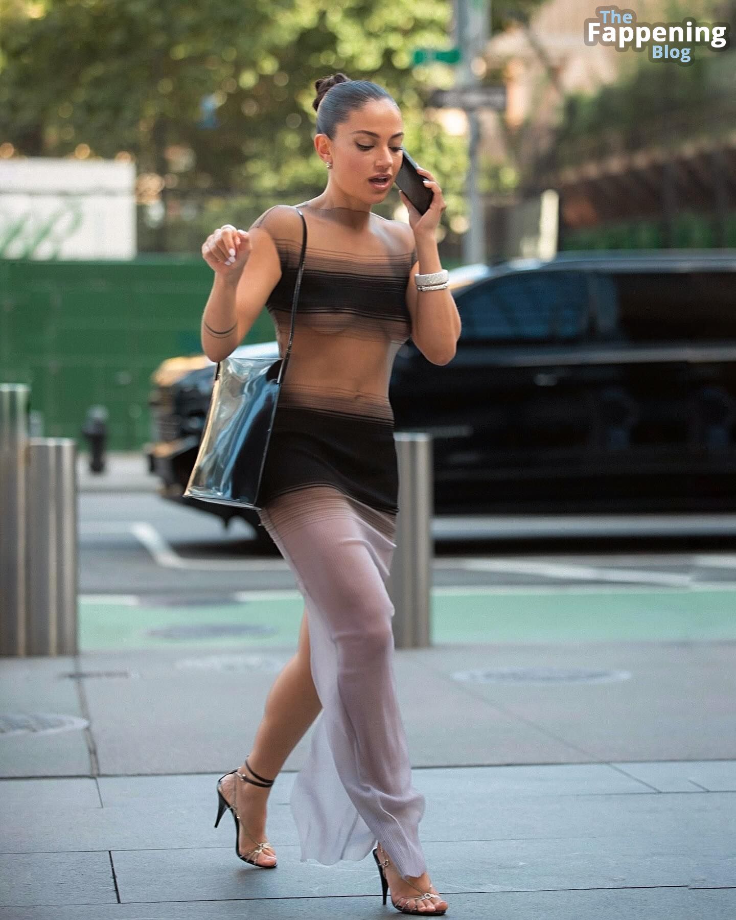 Inanna Sarkis est superbe en montrant un joli underboob dans une robe transparente.