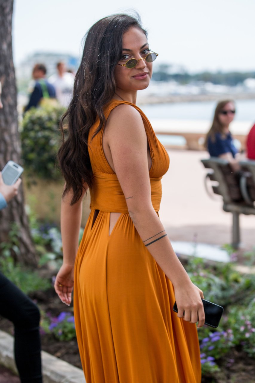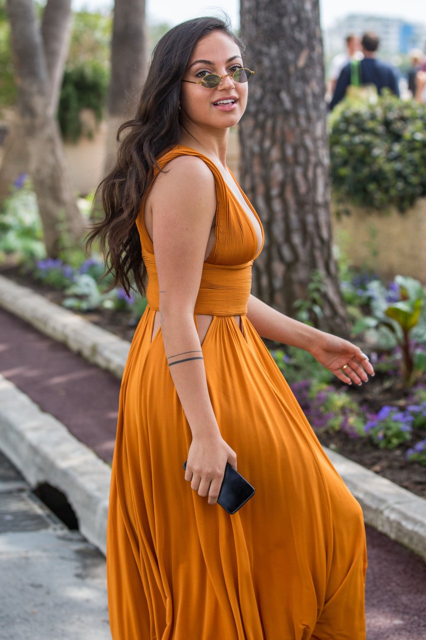 Inanna Sarkis est vue dans une robe orange à la Croisette à Cannes, France, 10/05/2018. L’actrice pulpeuse, blogueuse et star des réseaux sociaux a montré son décolleté profond et a envoyé un baiser aux paparazzis.