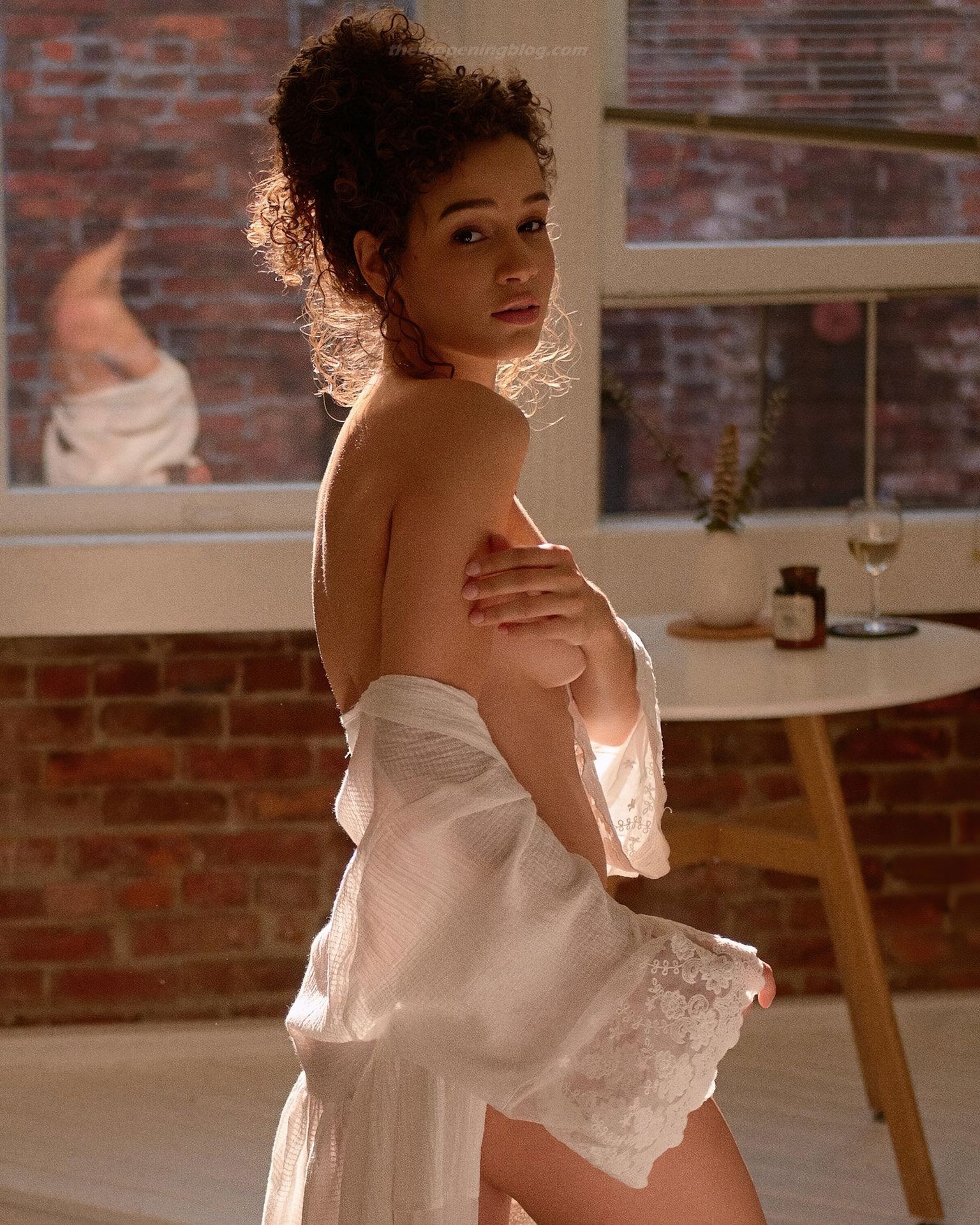 Modèle américaine, artiste et photographe, India “Indi” Williams pose nue sur le lit avec un ventilateur et un verre de vin lors d’une séance photo nue à Seattle par Joel Wallace Henderson (2019).