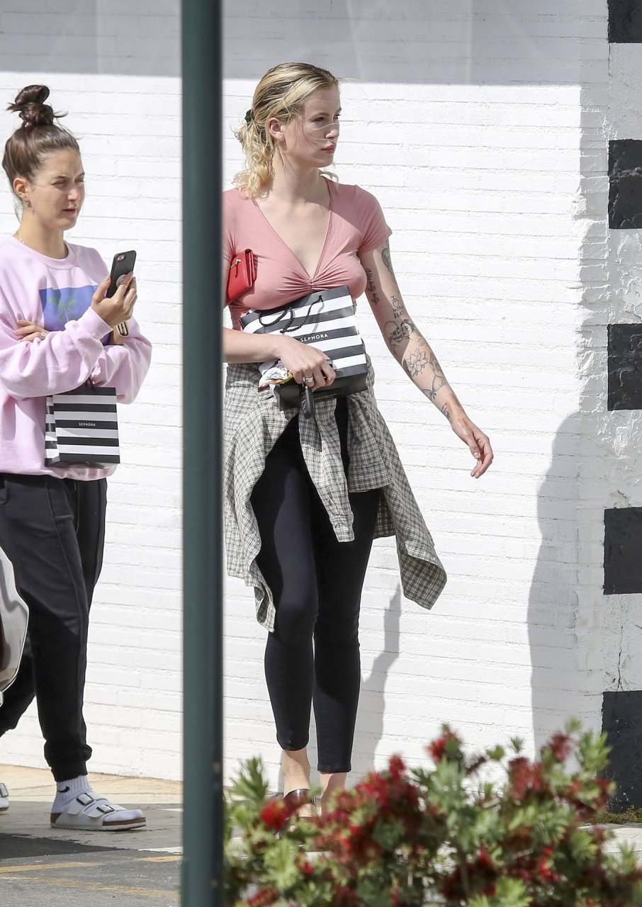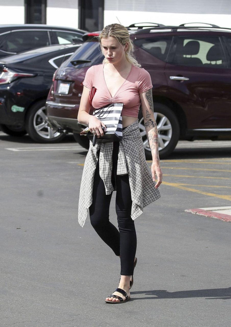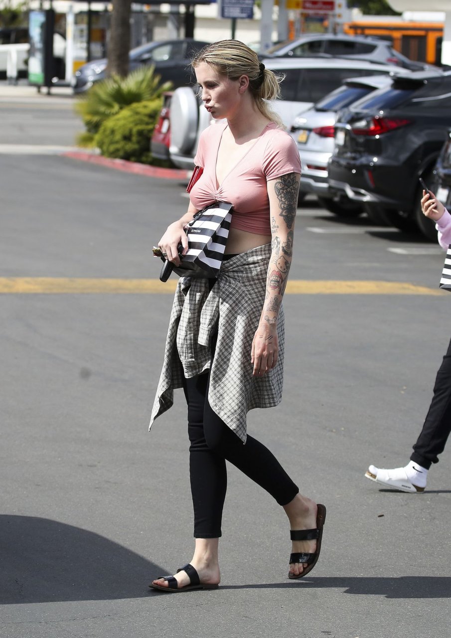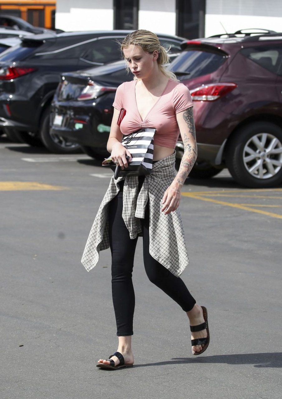 Mannequin sans soutien-gorge Ireland Baldwin est vue dans un t-shirt rose en faisant du shopping chez Sephora à Los Angeles, 17/05/2019.