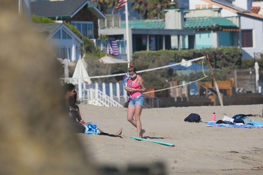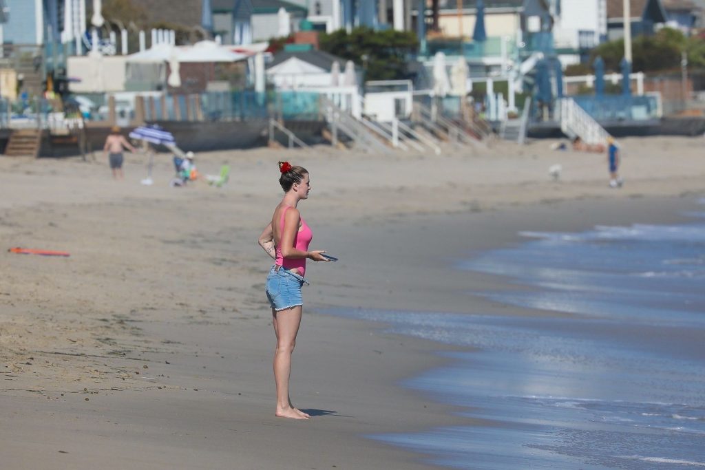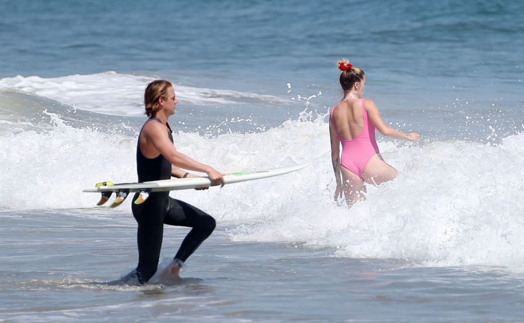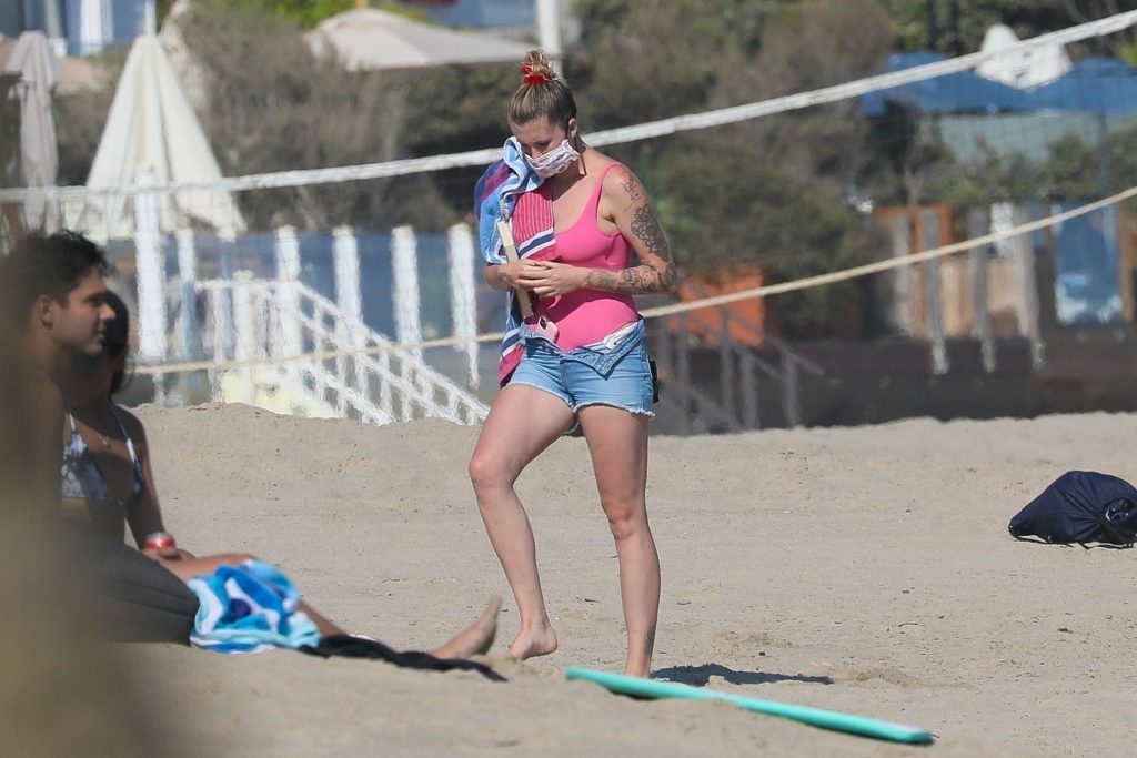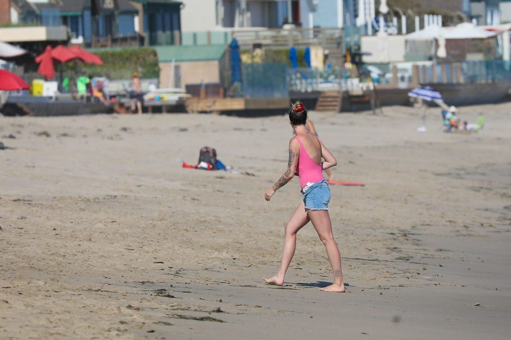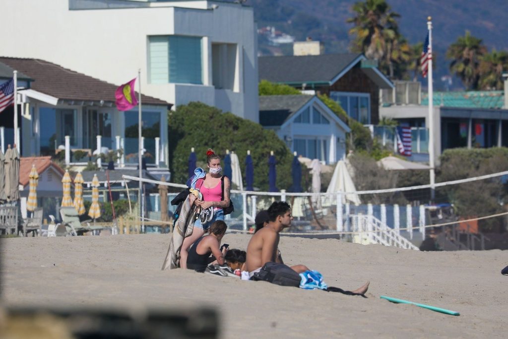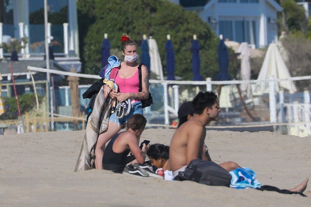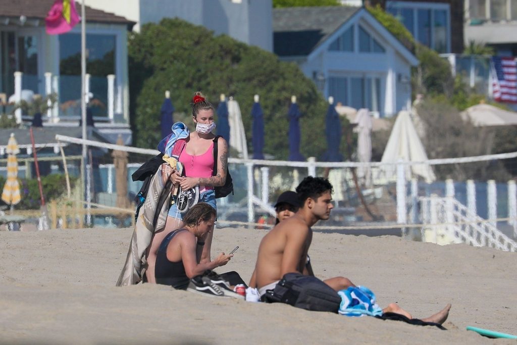 Ireland Baldwin est photographiée en train de profiter d’une journée à la plage, le 20/07/2020. Le mannequin de 24 ans s’est jetée à l’eau pour une baignade dans un maillot une pièce rose bubblegum. On la voit regarder son petit ami Corey Harper surfer à Malibu.