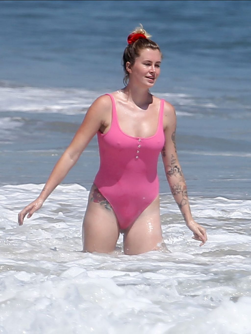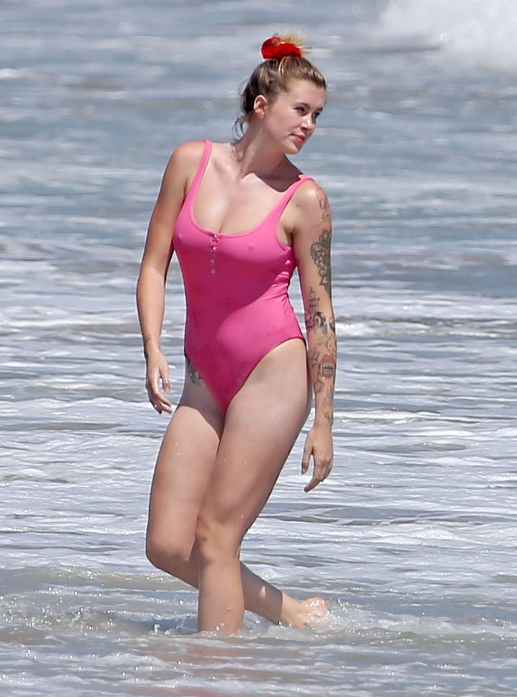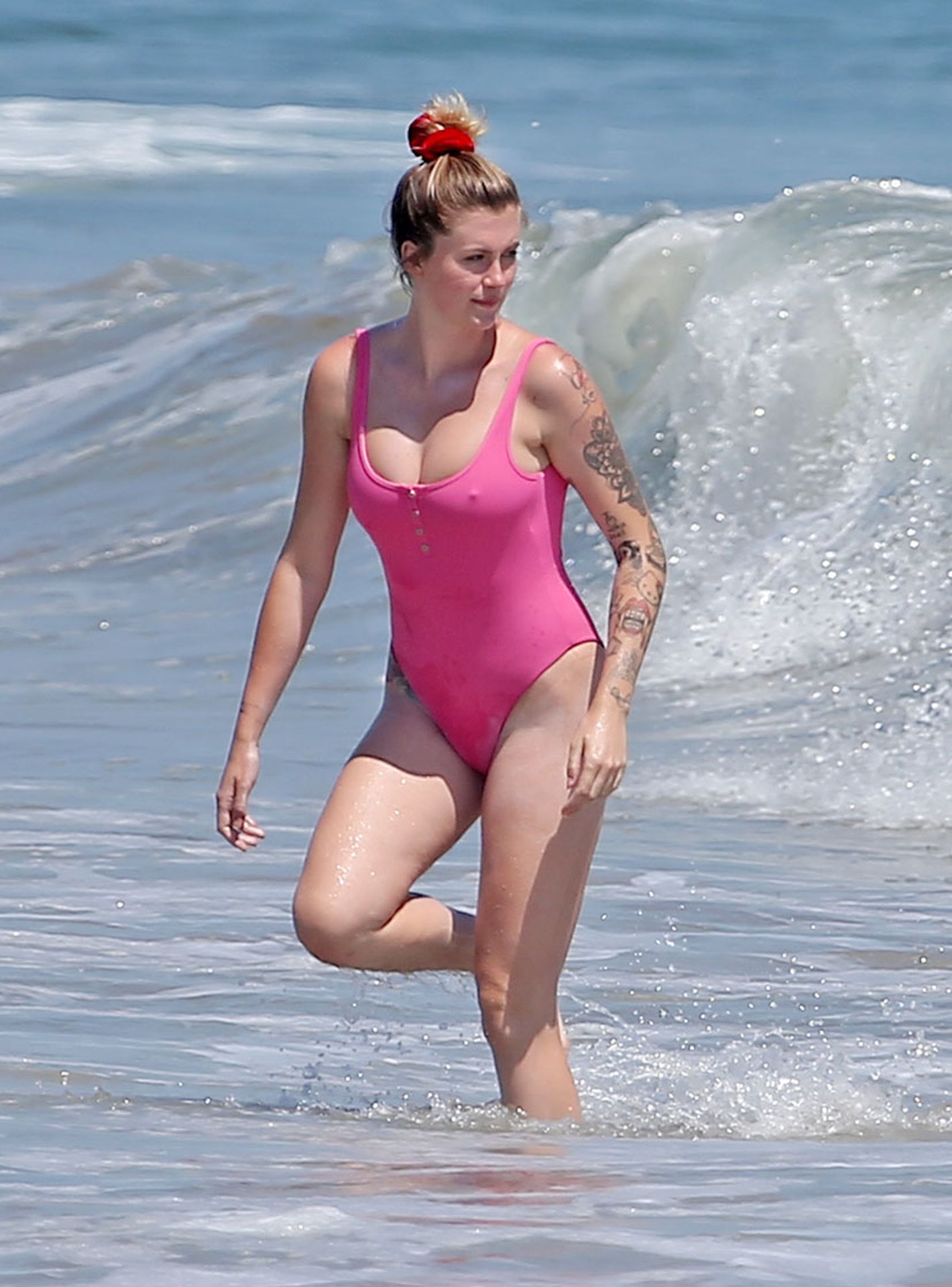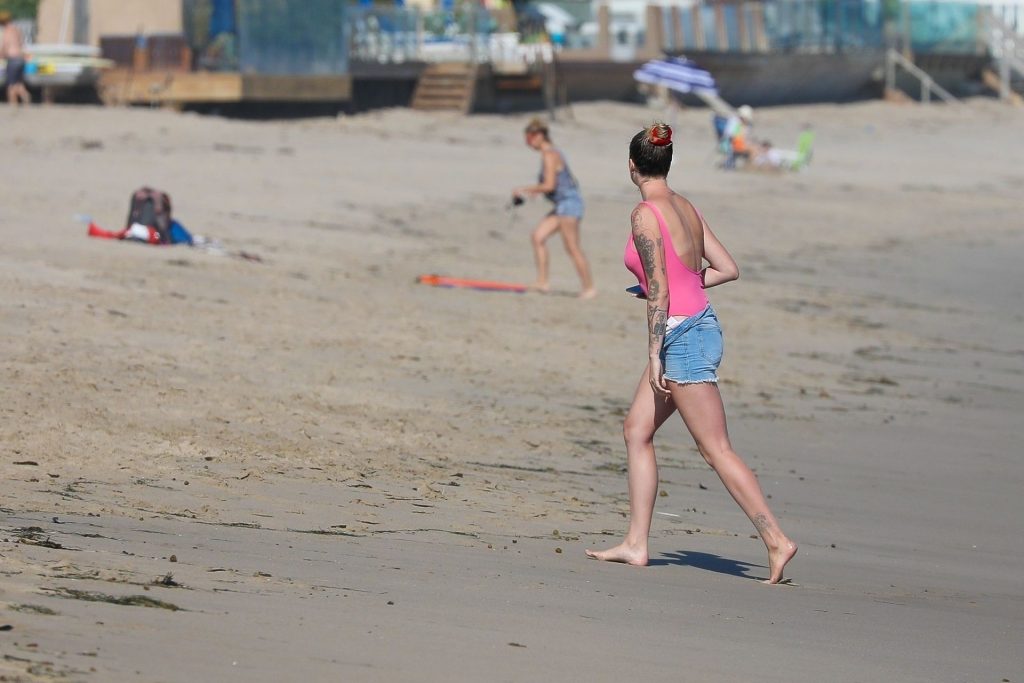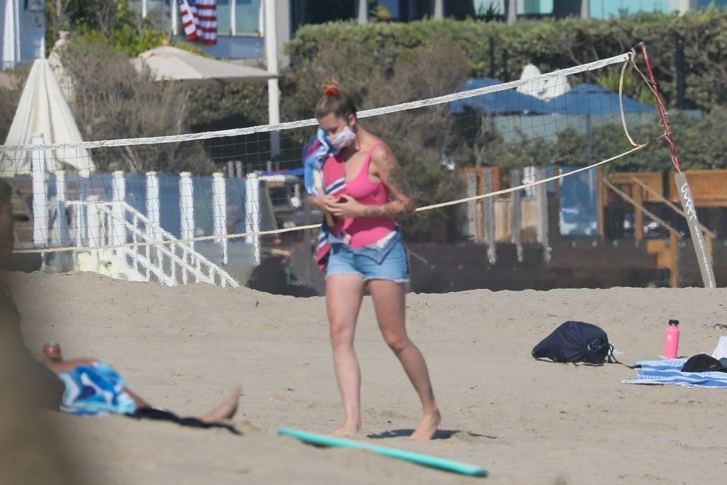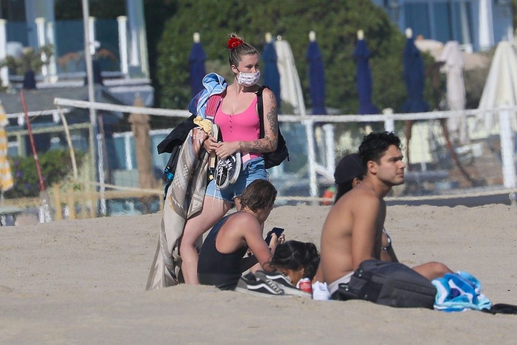 Ireland Baldwin est photographiée en train de profiter d’une journée à la plage, le 20/07/2020. Le mannequin de 24 ans s’est jetée à l’eau pour une baignade dans un maillot une pièce rose bubblegum. On la voit regarder son petit ami Corey Harper surfer à Malibu.