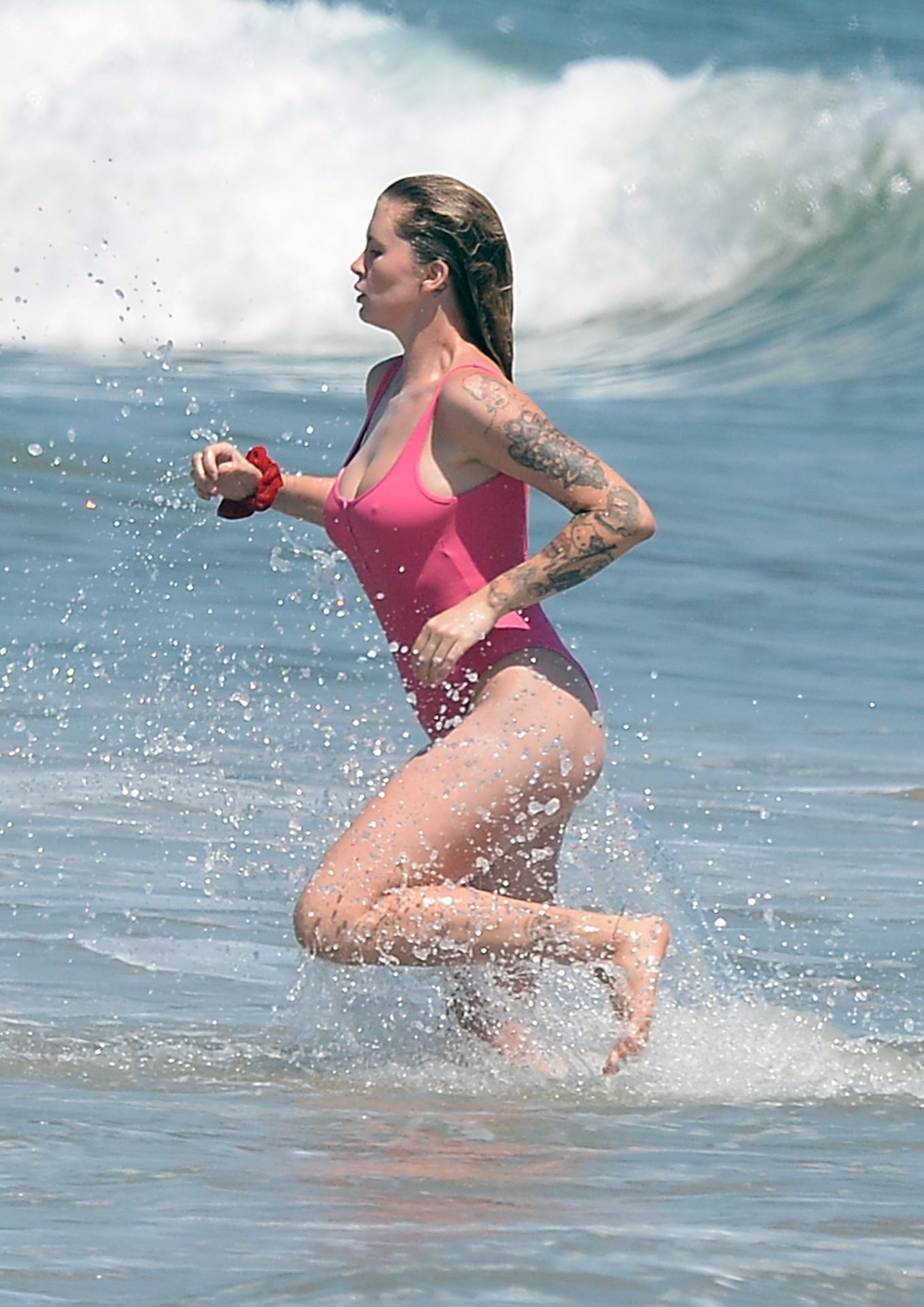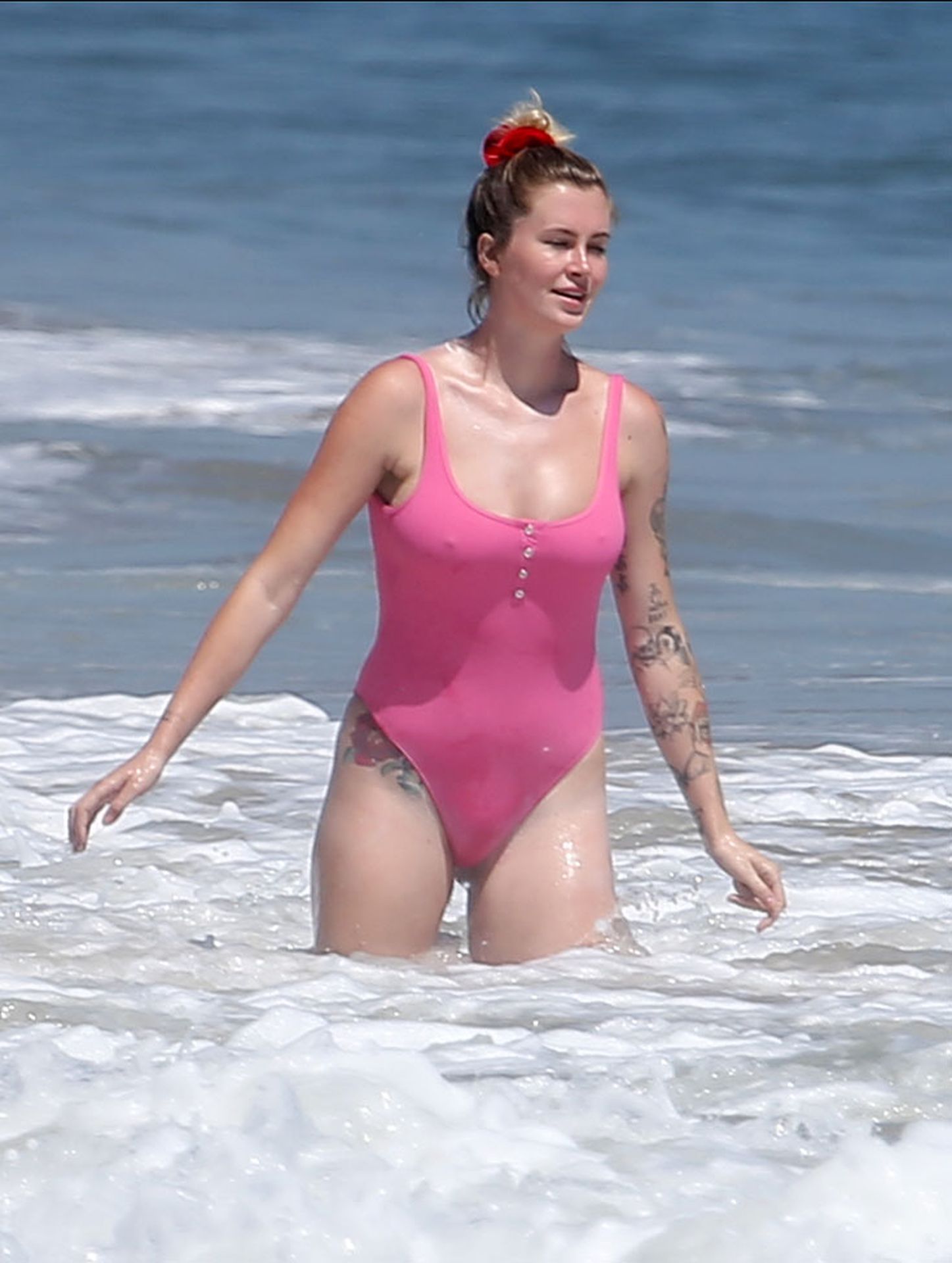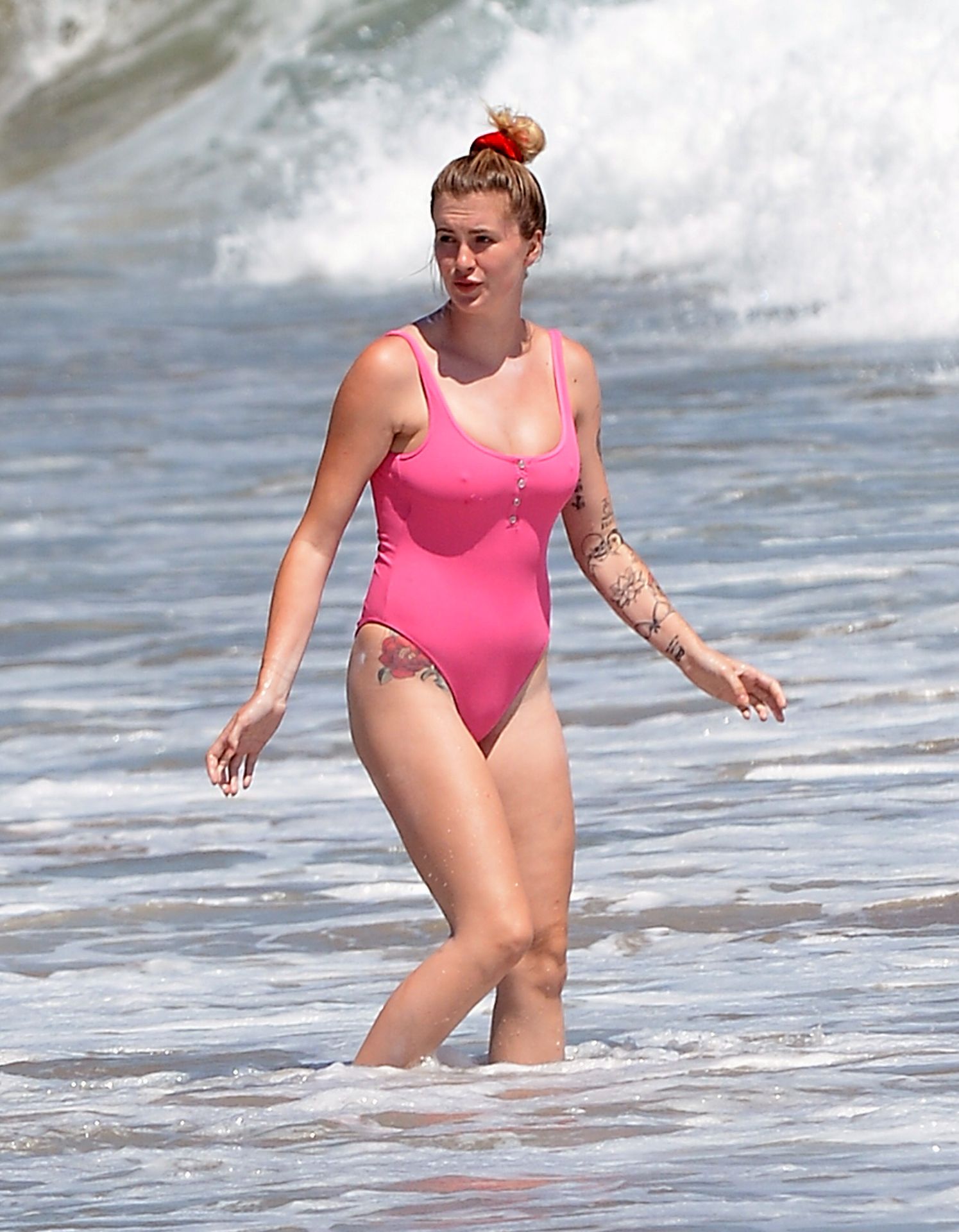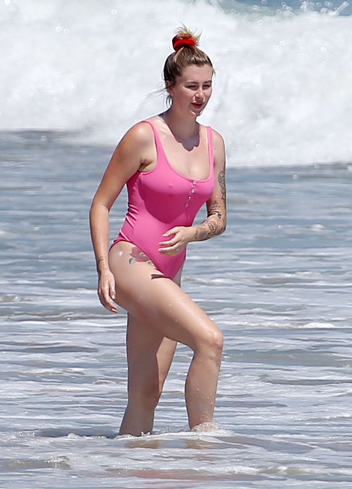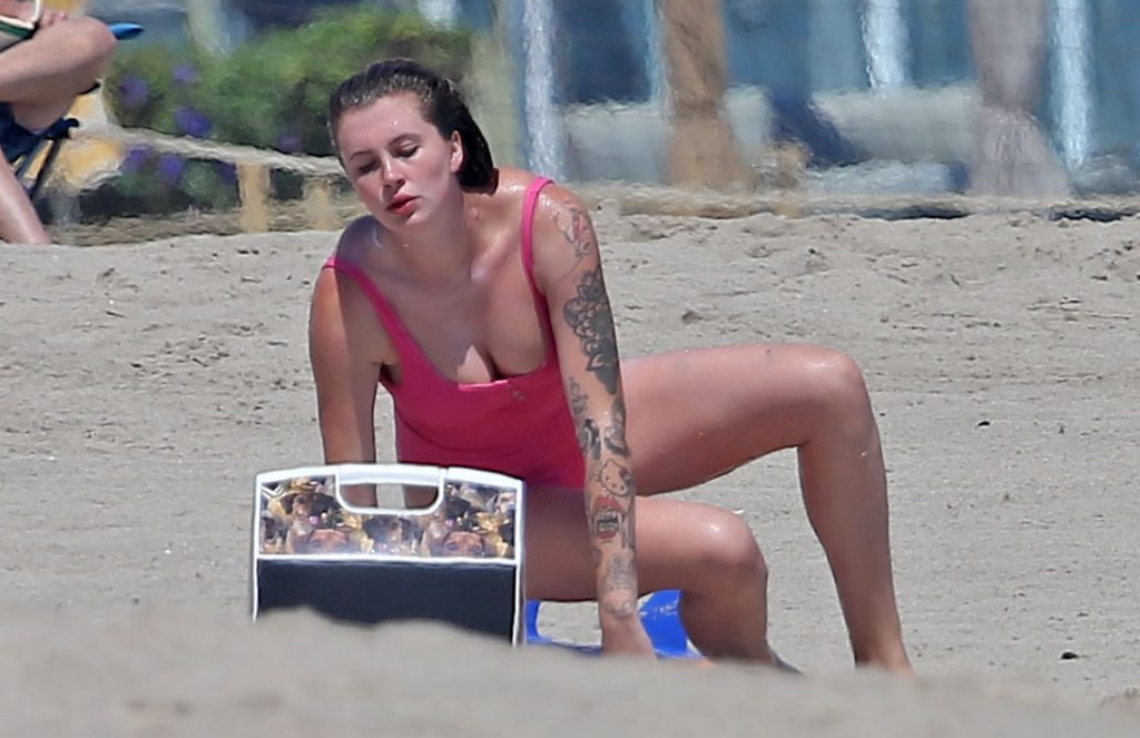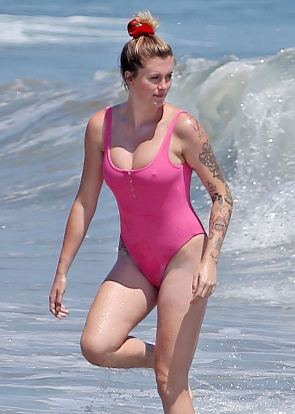 Ireland Baldwin est photographiée en train de profiter d’une journée à la plage, le 20/07/2020. Le mannequin de 24 ans s’est jetée à l’eau pour une baignade dans un maillot une pièce rose bubblegum. On la voit regarder son petit ami Corey Harper surfer à Malibu.