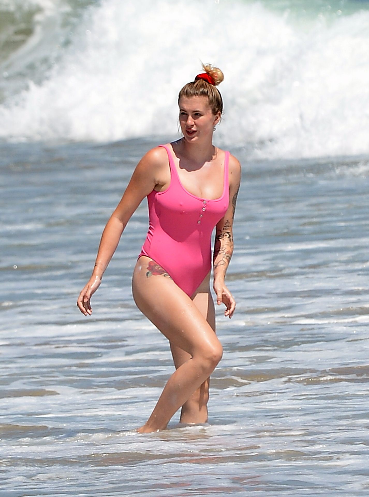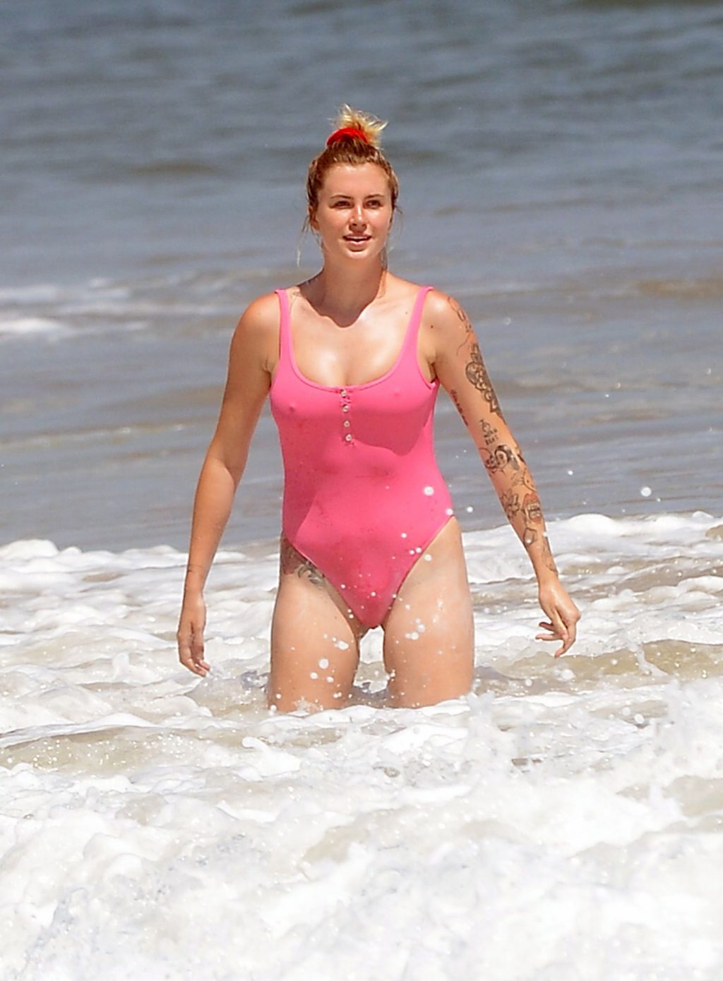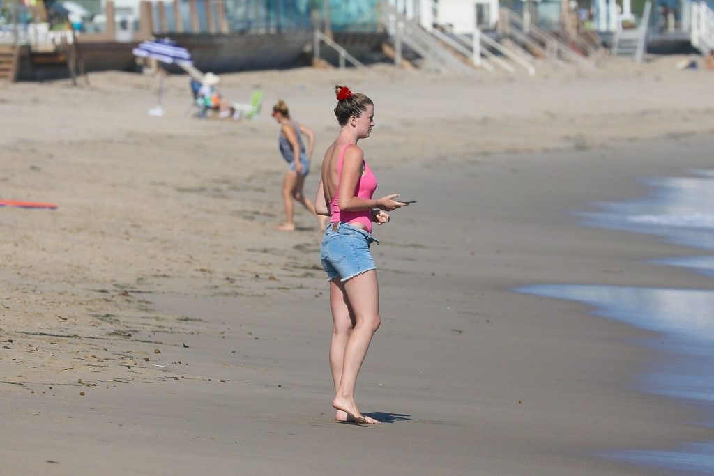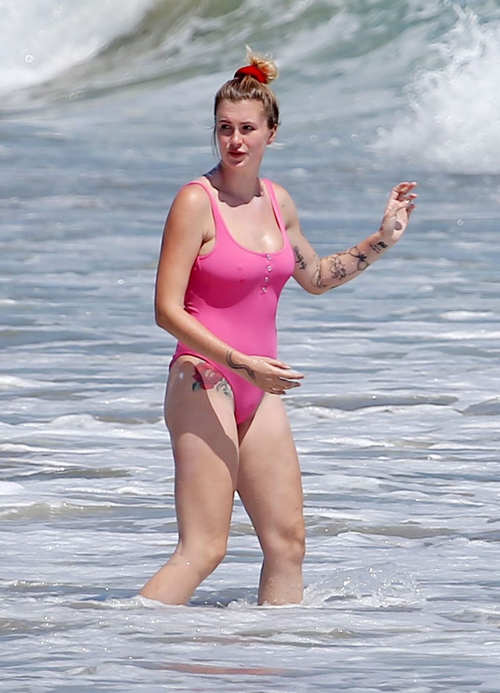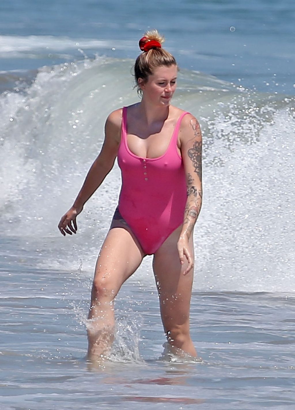 Ireland Baldwin est photographiée en train de profiter d’une journée à la plage, le 20/07/2020. Le mannequin de 24 ans s’est jetée à l’eau pour une baignade dans un maillot une pièce rose bubblegum. On la voit regarder son petit ami Corey Harper surfer à Malibu.
