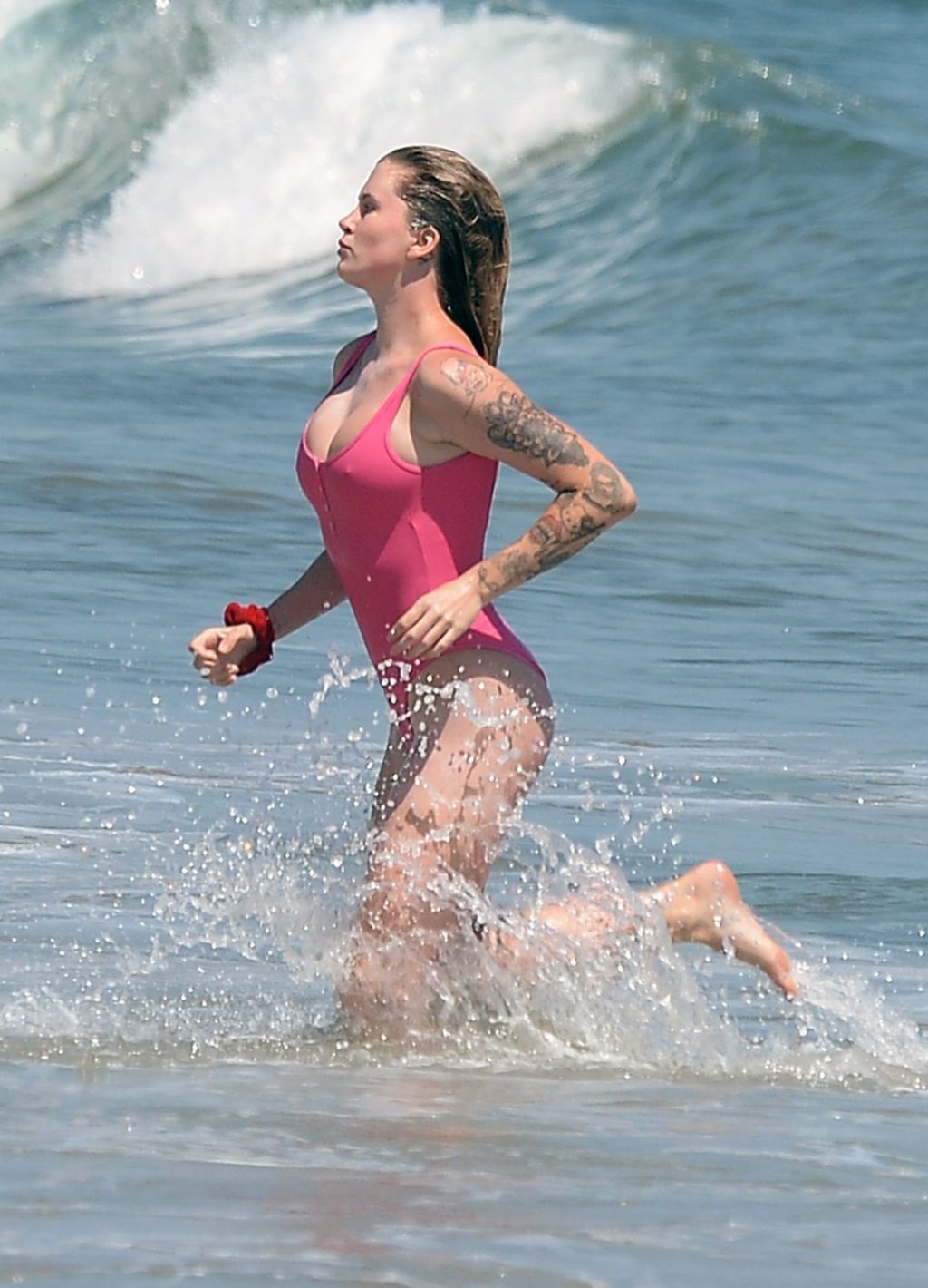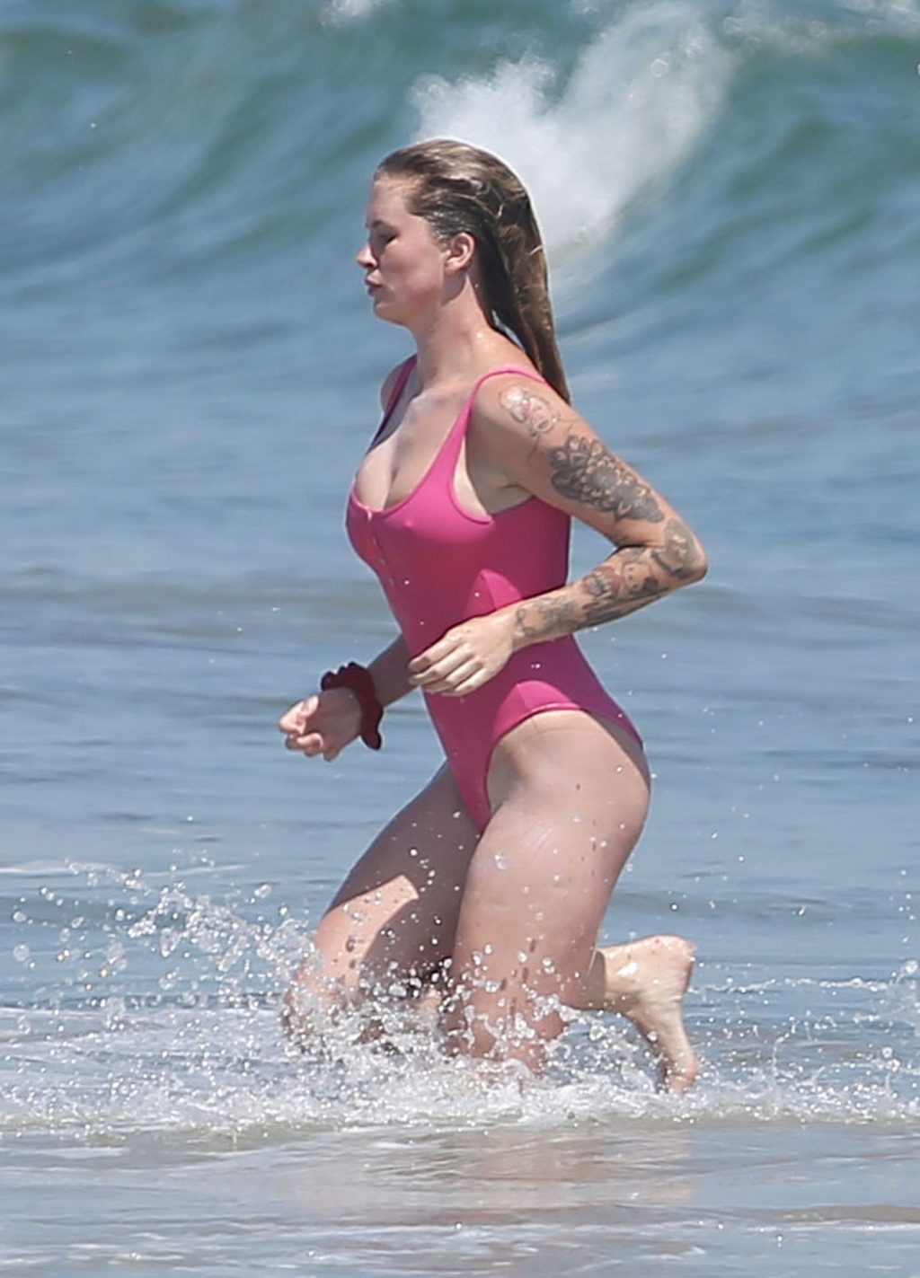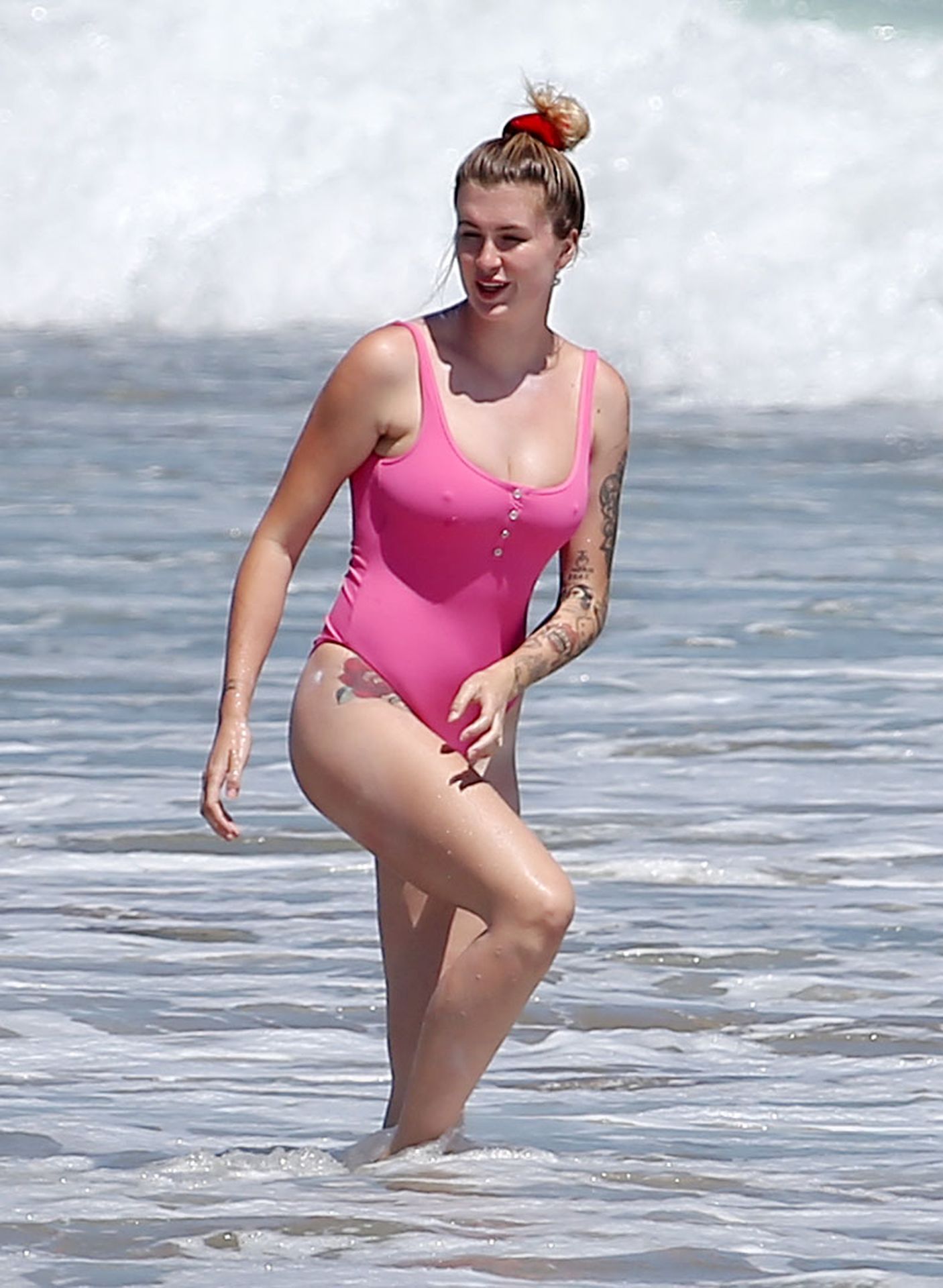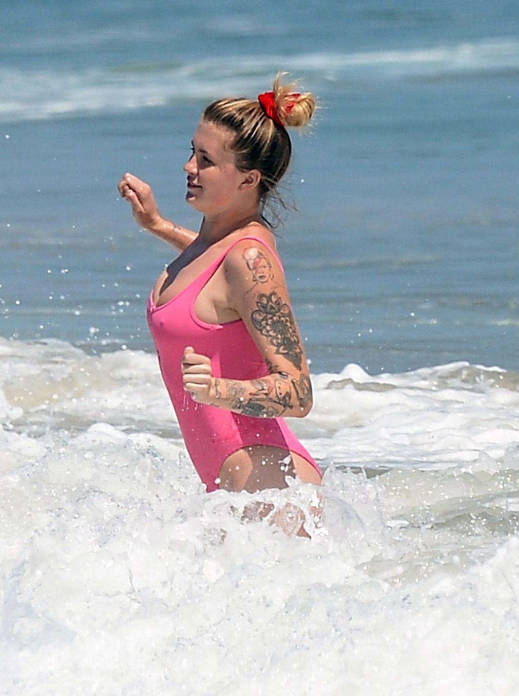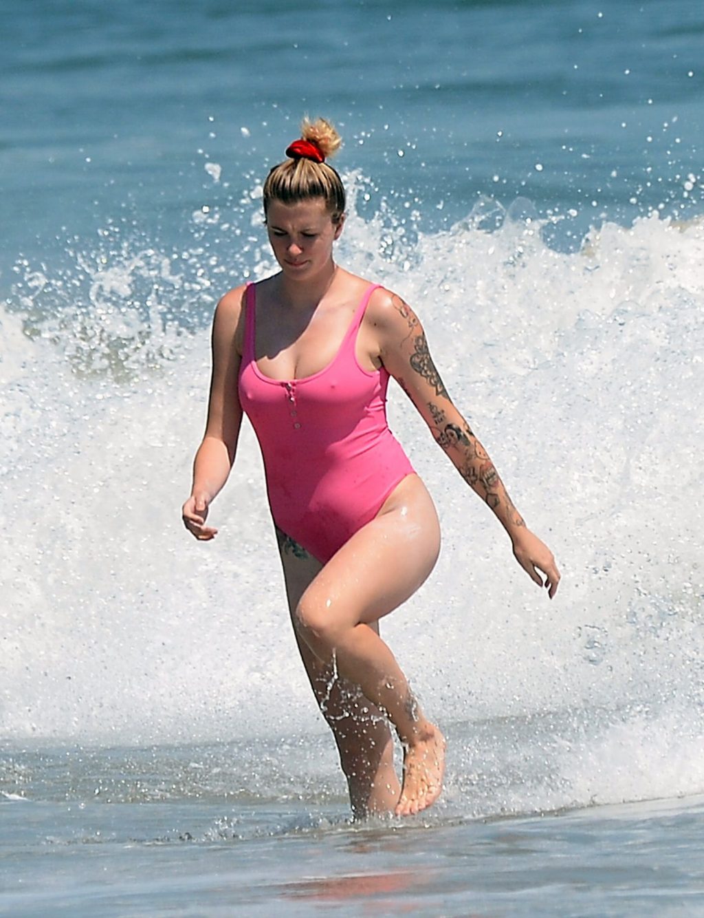 Ireland Baldwin est photographiée en train de profiter d’une journée à la plage, le 20/07/2020. Le mannequin de 24 ans s’est jetée à l’eau pour une baignade dans un maillot une pièce rose bubblegum. On la voit regarder son petit ami Corey Harper surfer à Malibu.