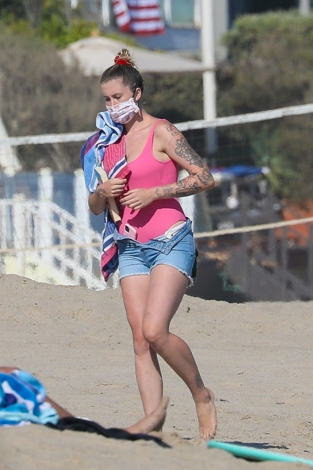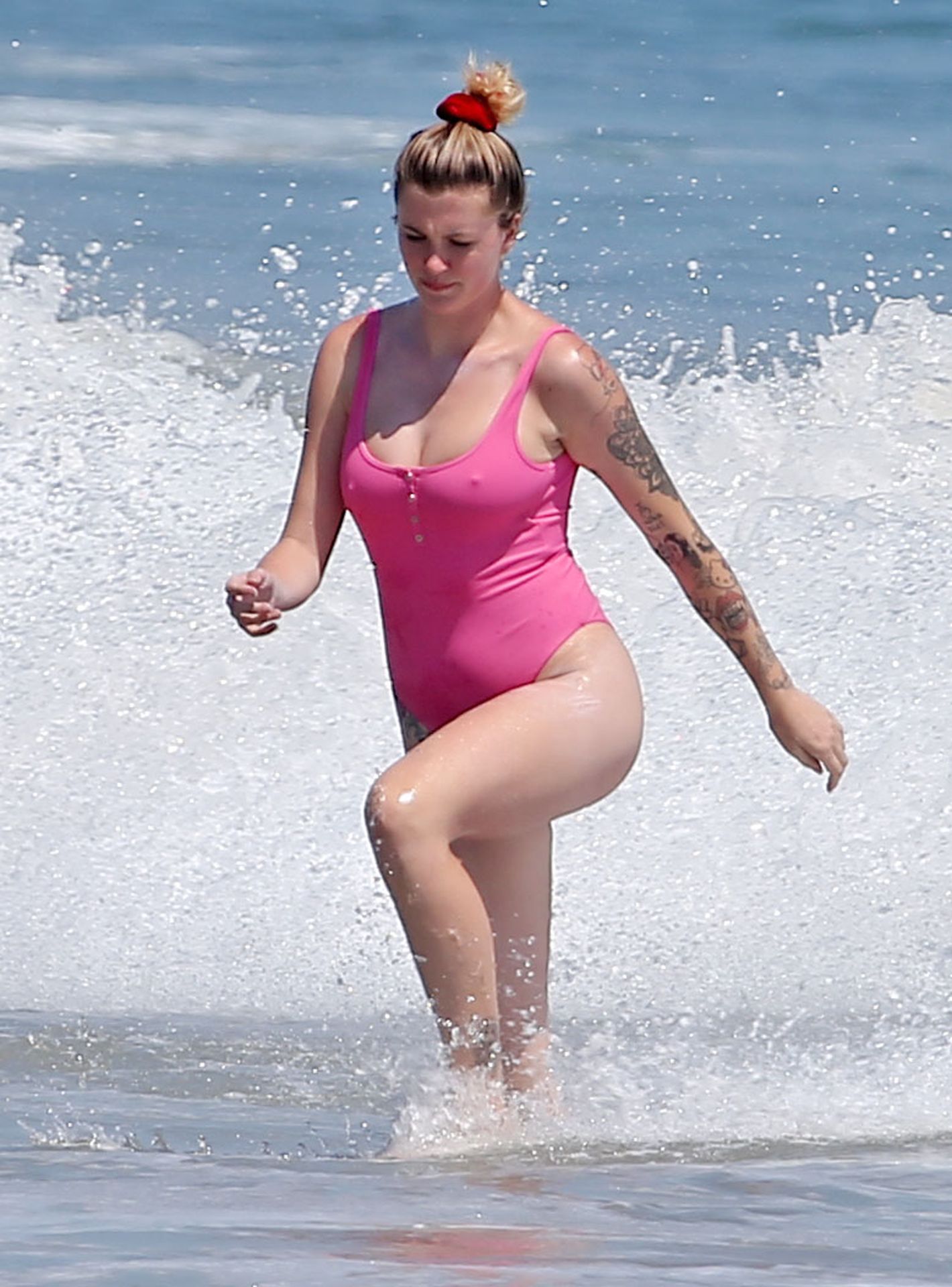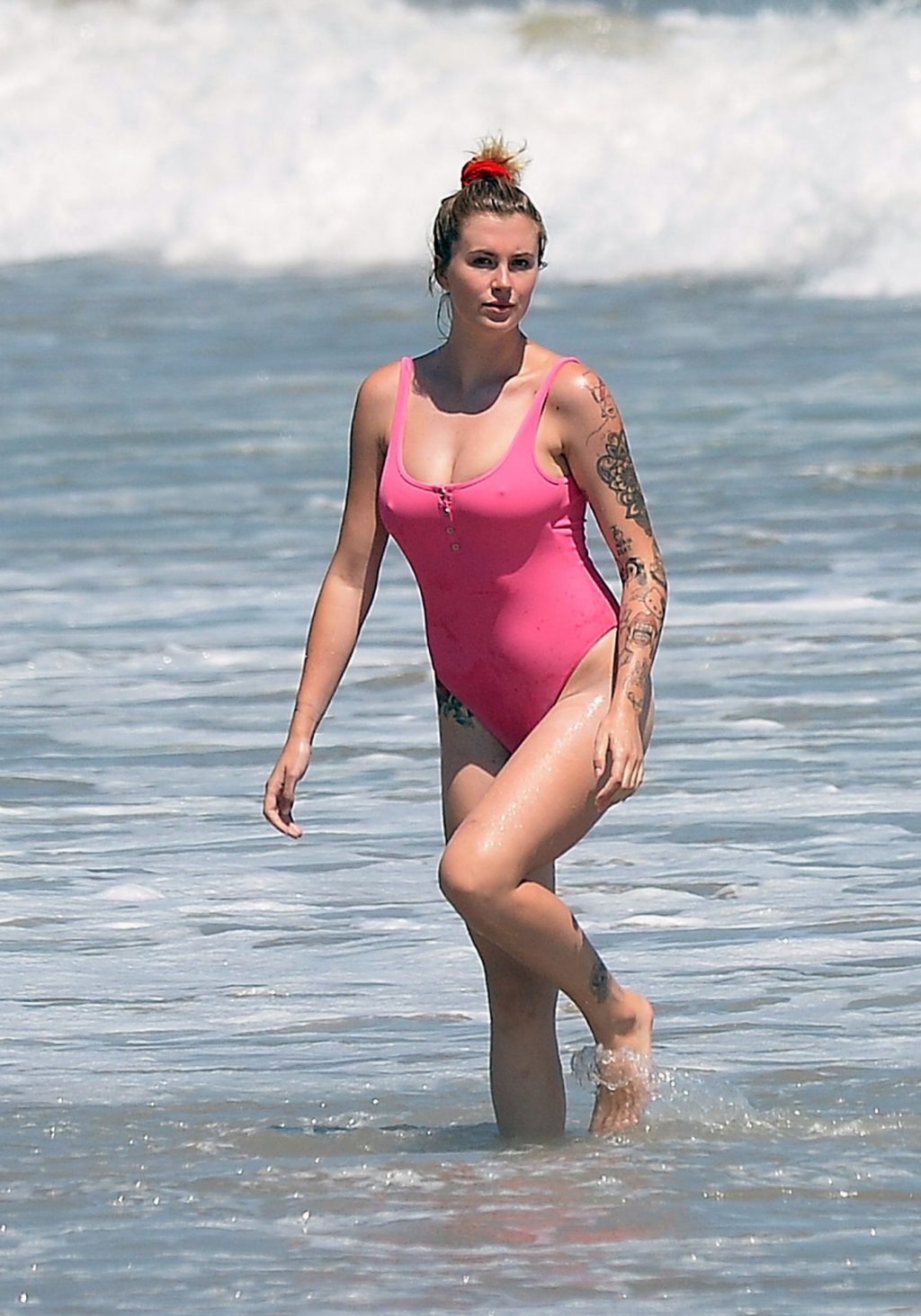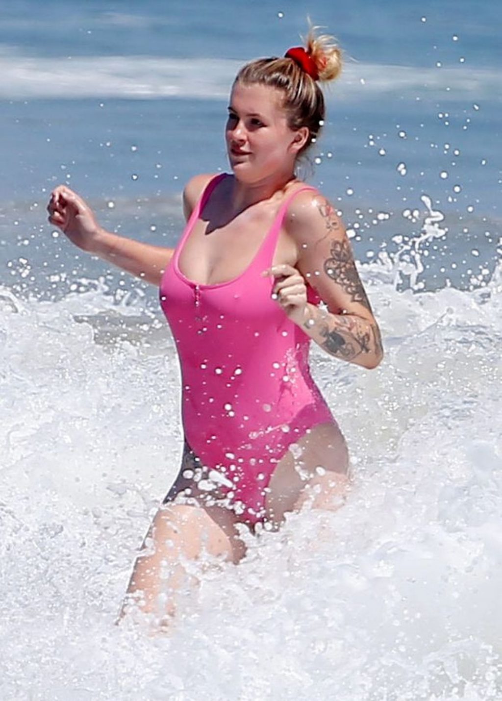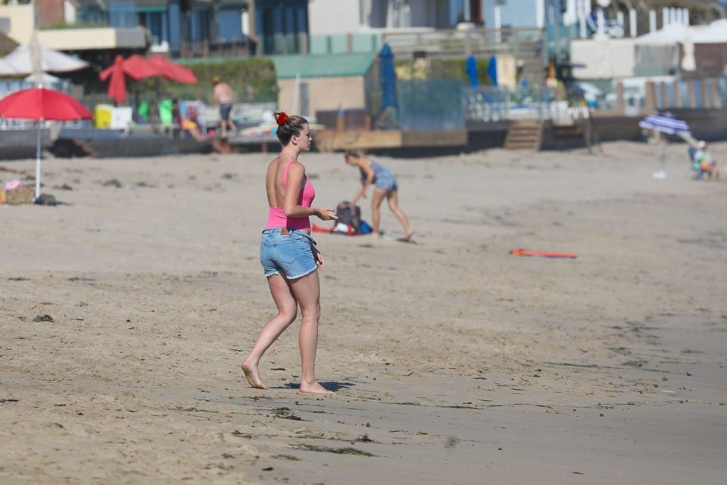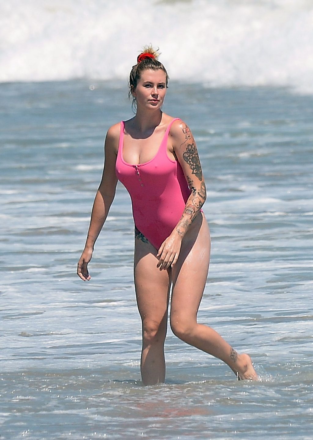 Ireland Baldwin est photographiée en train de profiter d’une journée à la plage, le 20/07/2020. Le mannequin de 24 ans s’est jetée à l’eau pour une baignade dans un maillot une pièce rose bubblegum. On la voit regarder son petit ami Corey Harper surfer à Malibu.