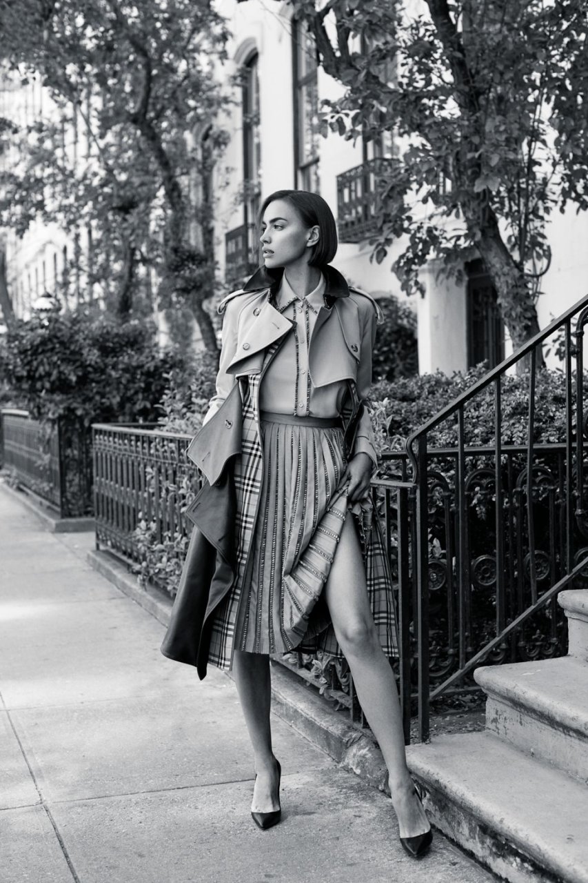 Les images accompagnantes incluent des looks glamour stylisés par Charles Varenne. Irina porte une garde-robe comprenant des marques comme Burberry, Bulgari et Carolina Herrera.