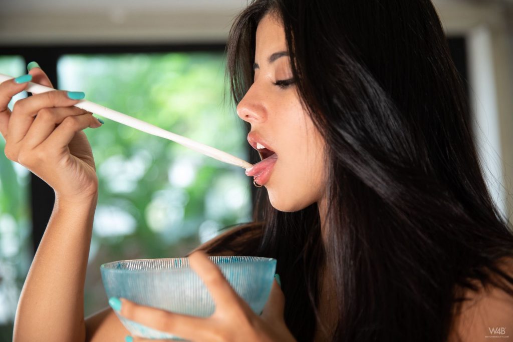 La charmante modèle Iris Lucky pose nue dans la cuisine, mais pas pour préparer le dîner, plutôt pour enlever joliment sa lingerie érotique et verser du lait sur son délicieux sexe dans une nouvelle séance photo (2021).