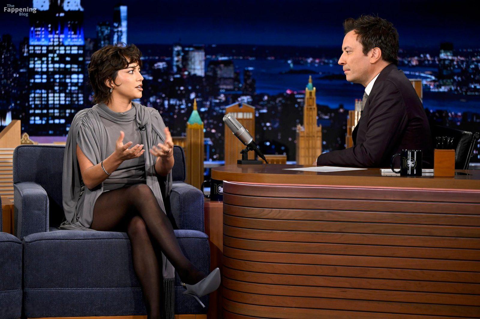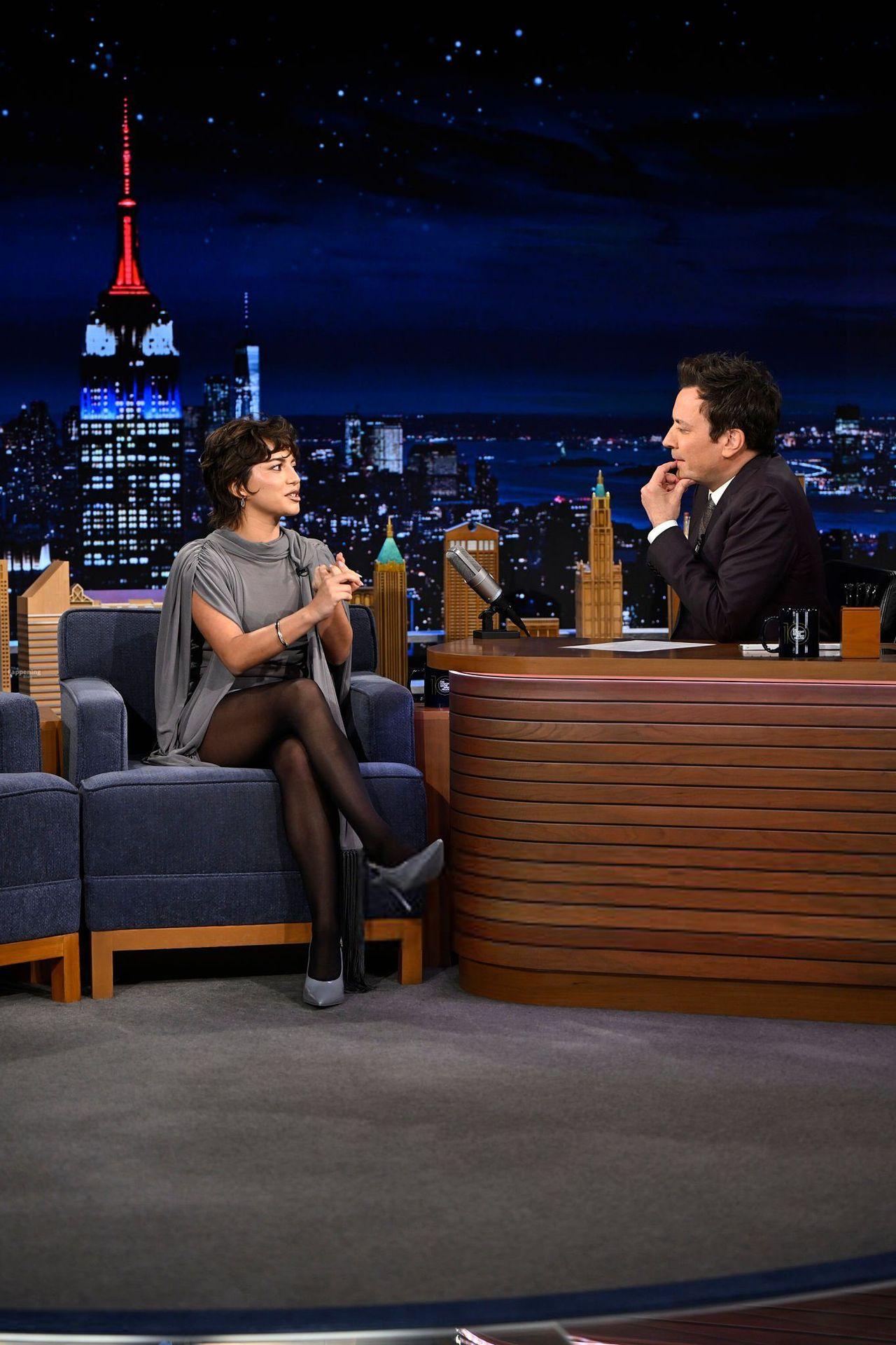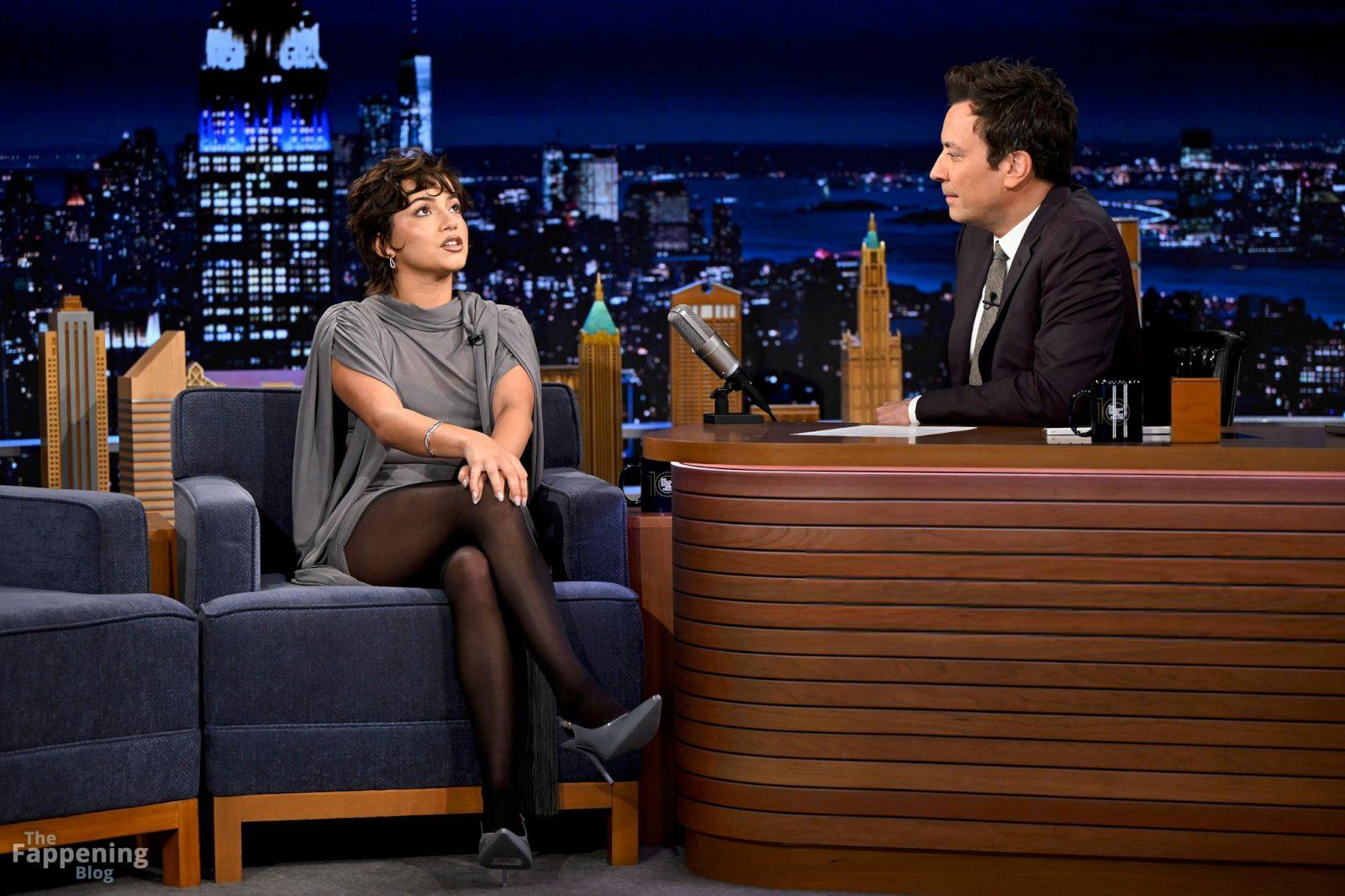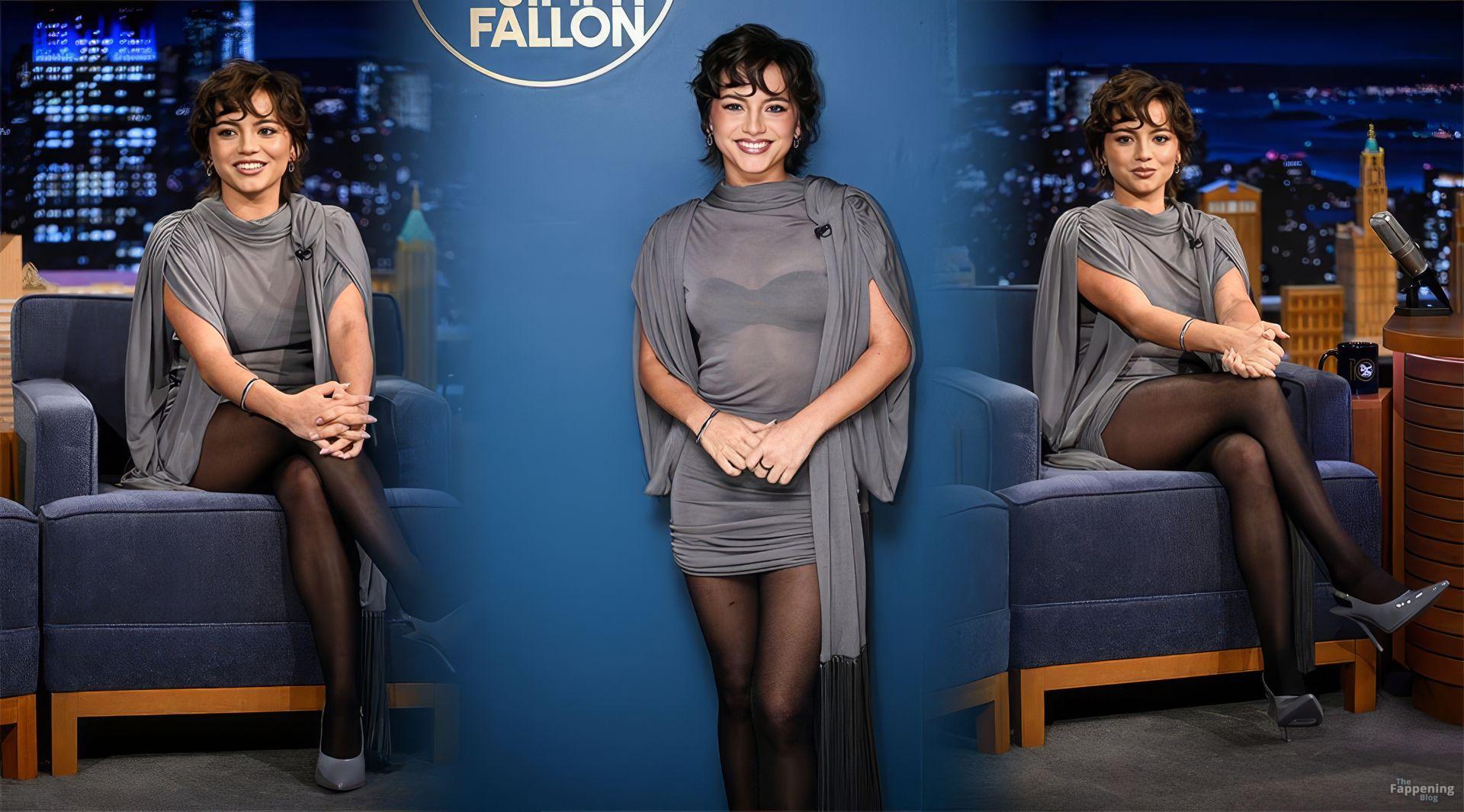 L’actrice Isabela Merced met en valeur ses jambes dans des bas transparents et une mini-robe transparente lors du Tonight Show avec Jimmy Fallon.